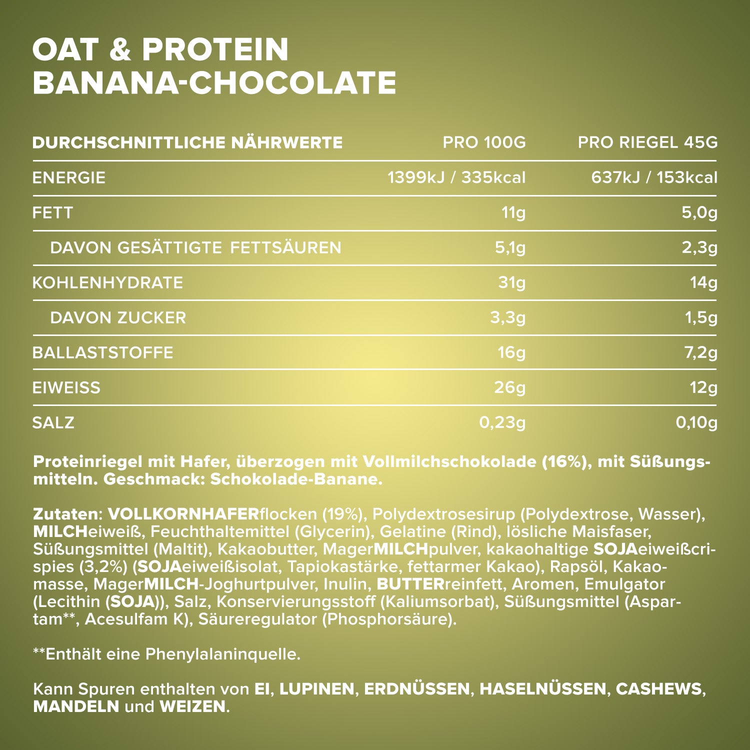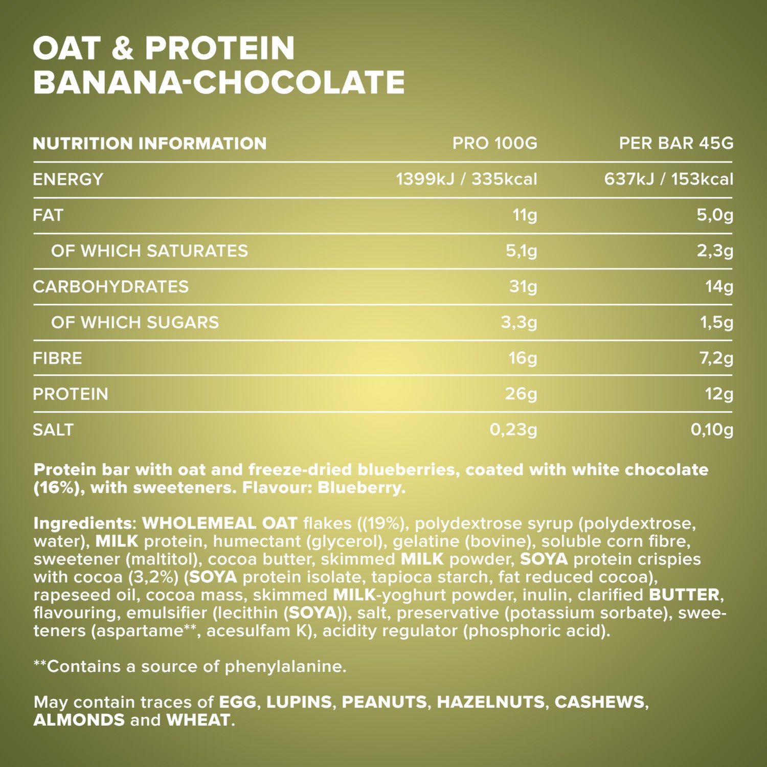 Designation: Protein bar with oats, coated with whole milk chocolate (16%), with sweeteners. Flavor: Chocolate-Banana.