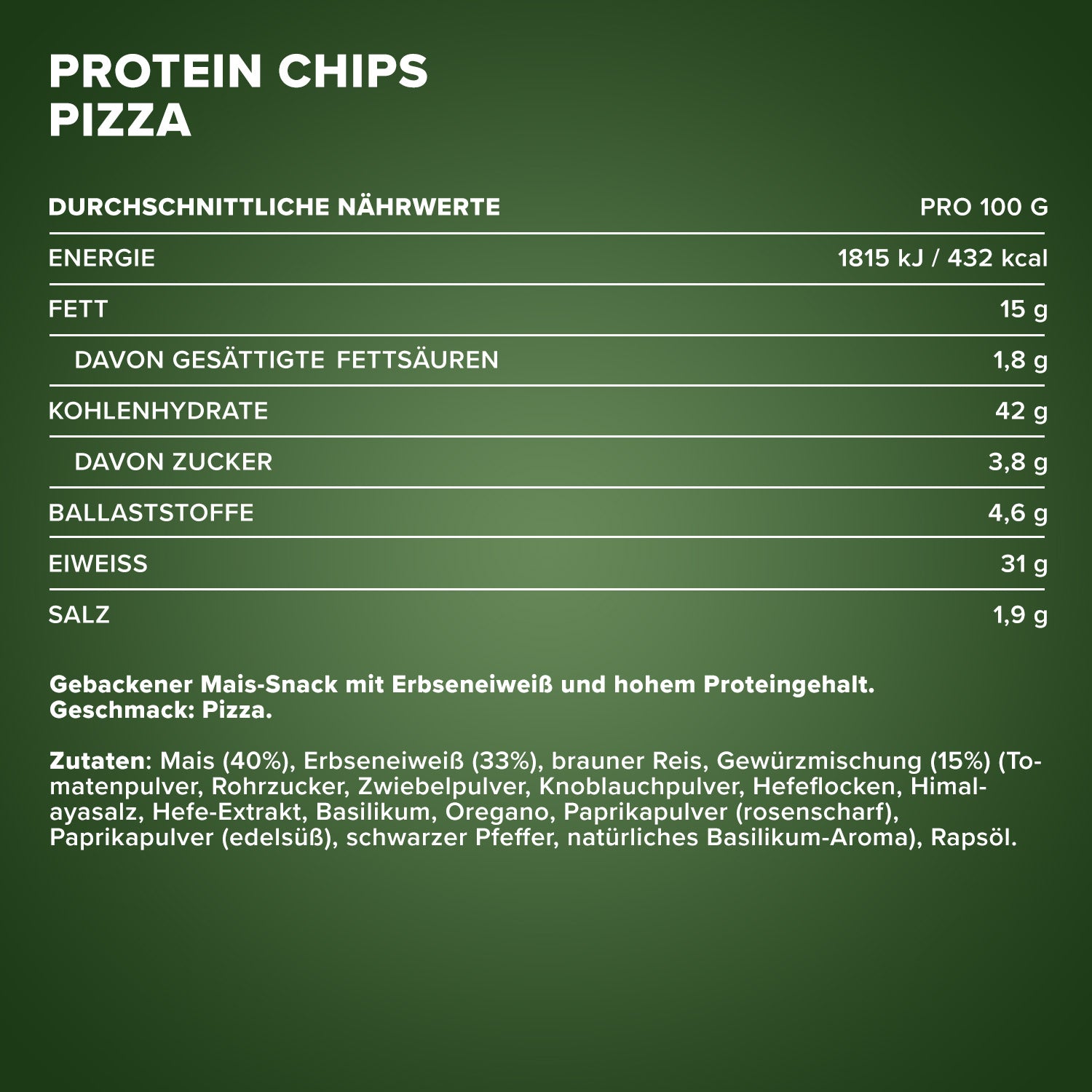 Product Description: Baked corn snack with pea protein and high protein content. Flavour: Pizza.