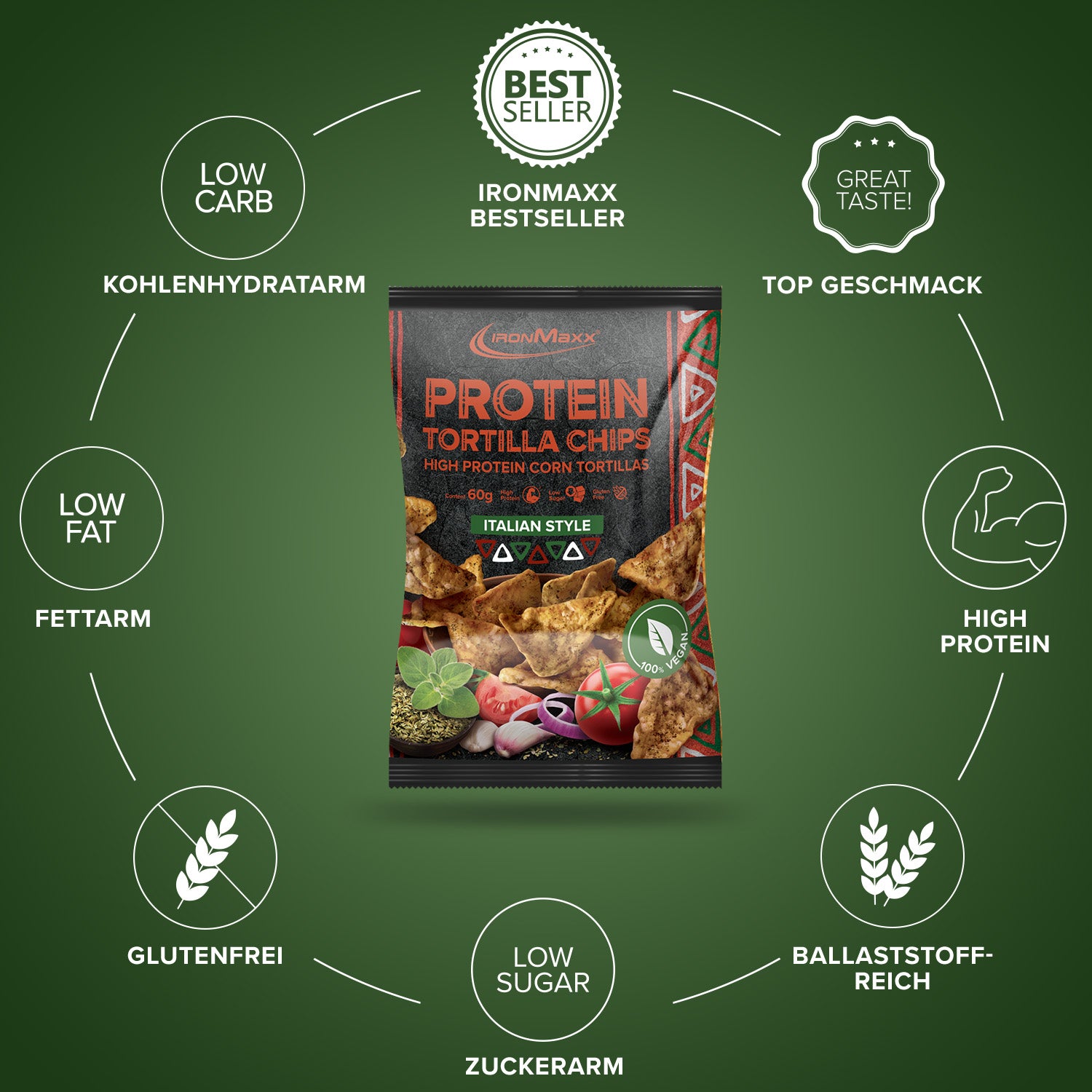 - High-Protein Snack: Crispy IronMaxx® Protein Tortilla Chips made from corn and pea protein – the ideal protein snack for in between meals.