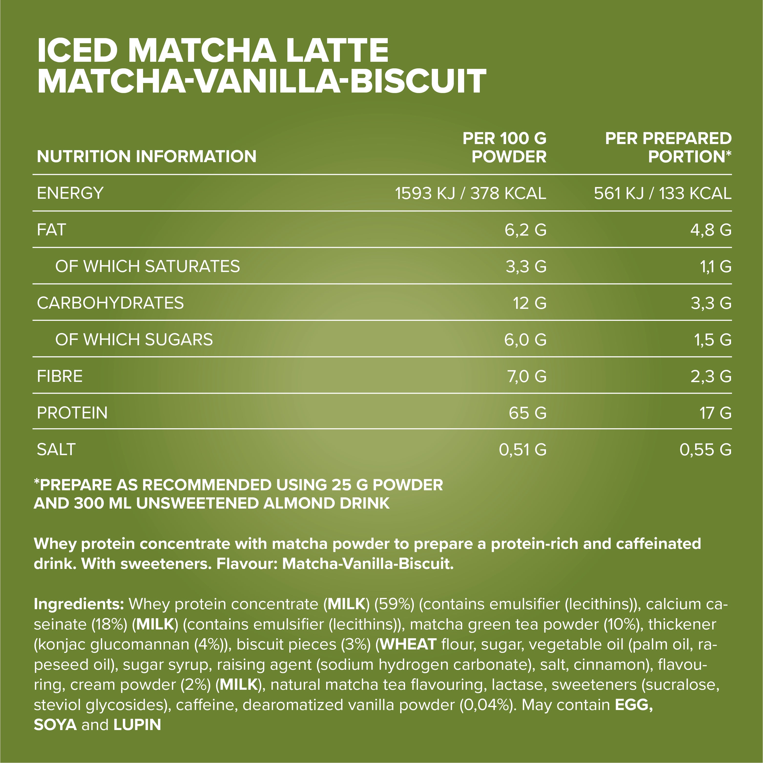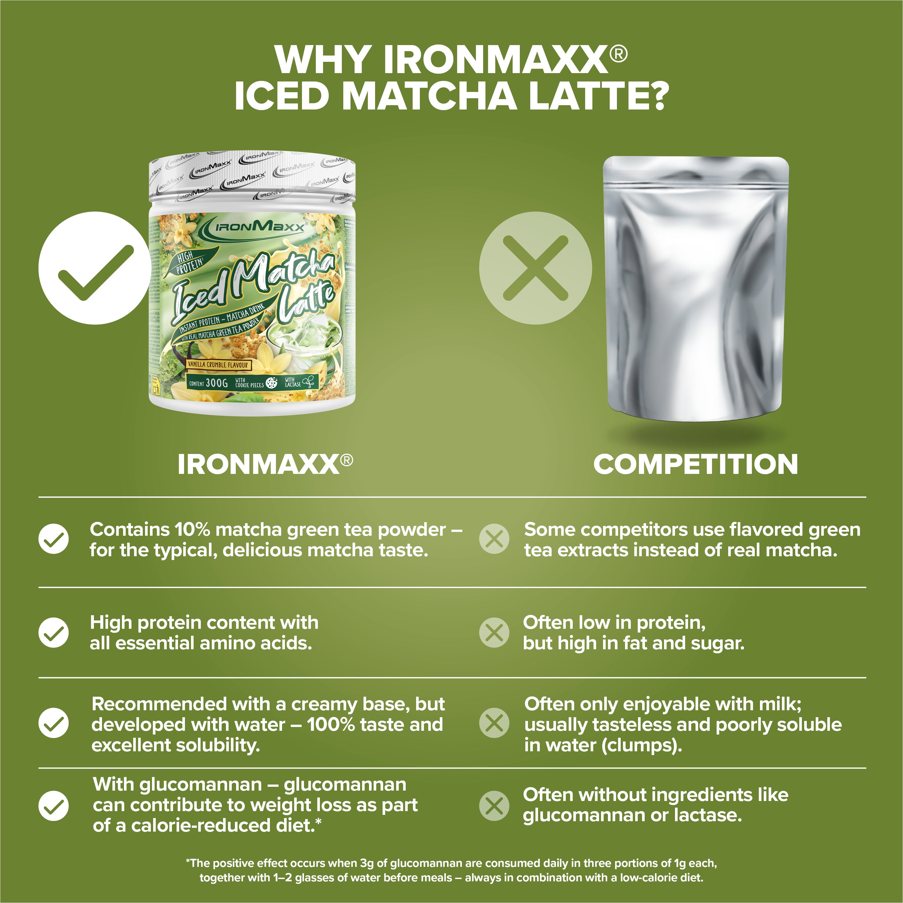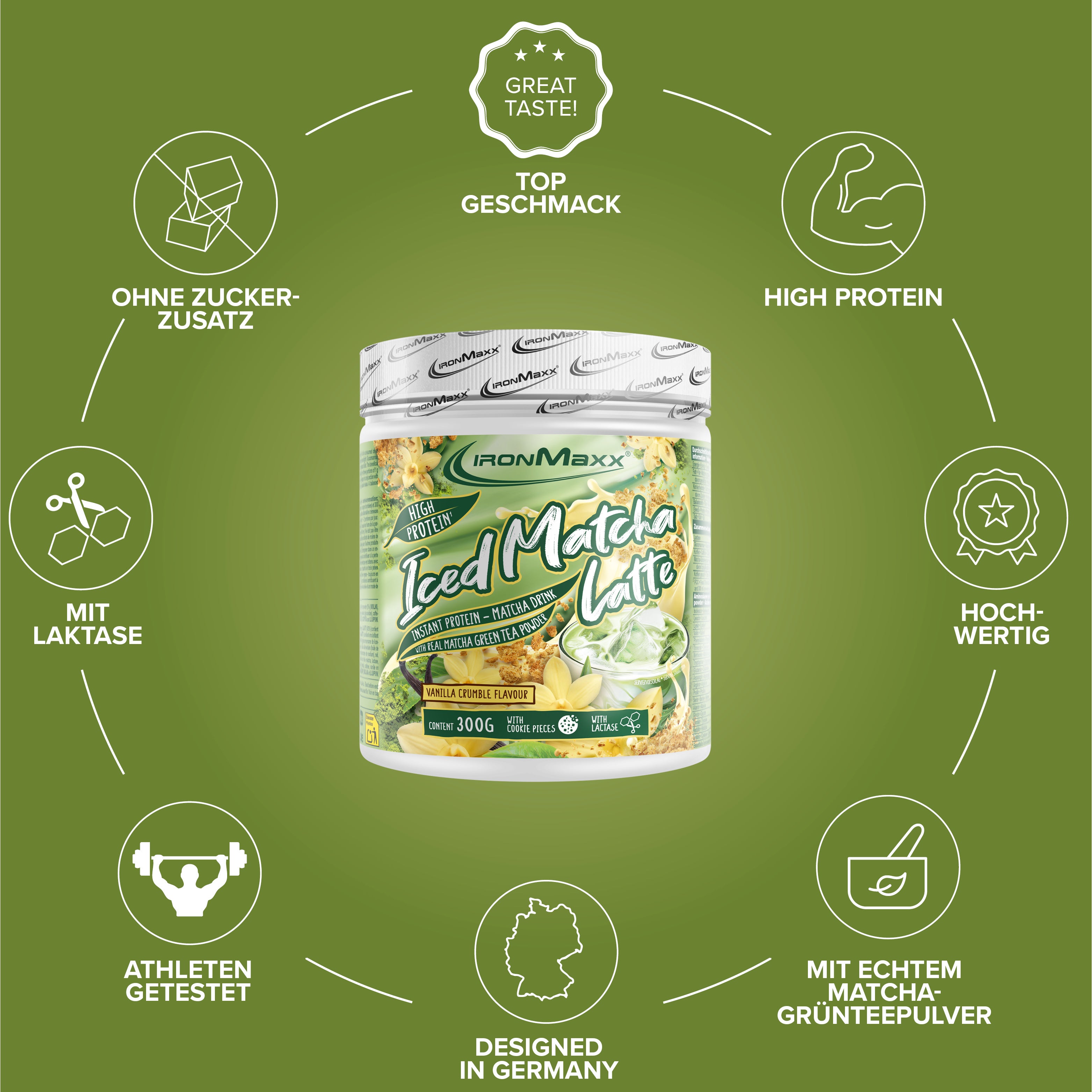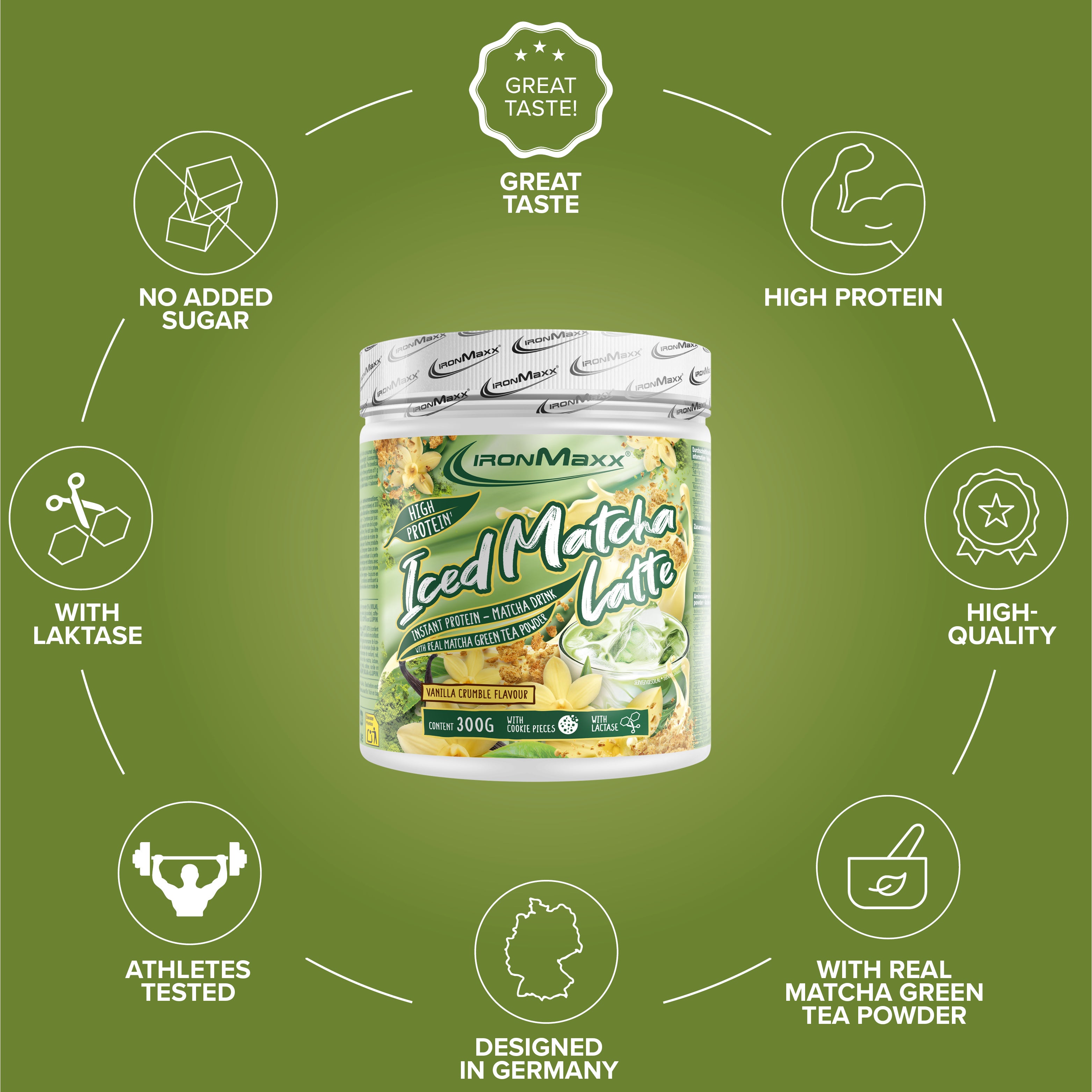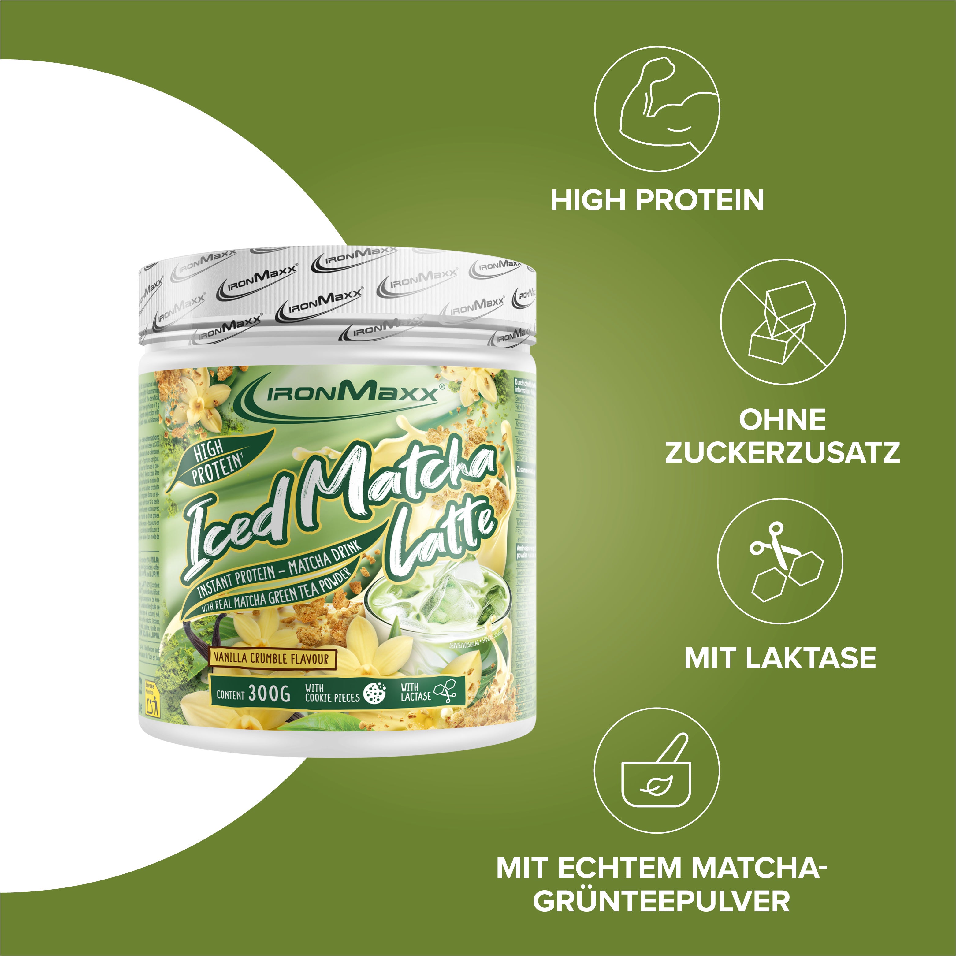 Der High Protein Iced Matcha Latte von IronMaxx® vereint hochwertiges Molkenprotein mit echtem Matcha-Grüntee zu einem erfrischend-cremigen Drink. Einfach mit kaltem Mandeldrink mischen und genießen!