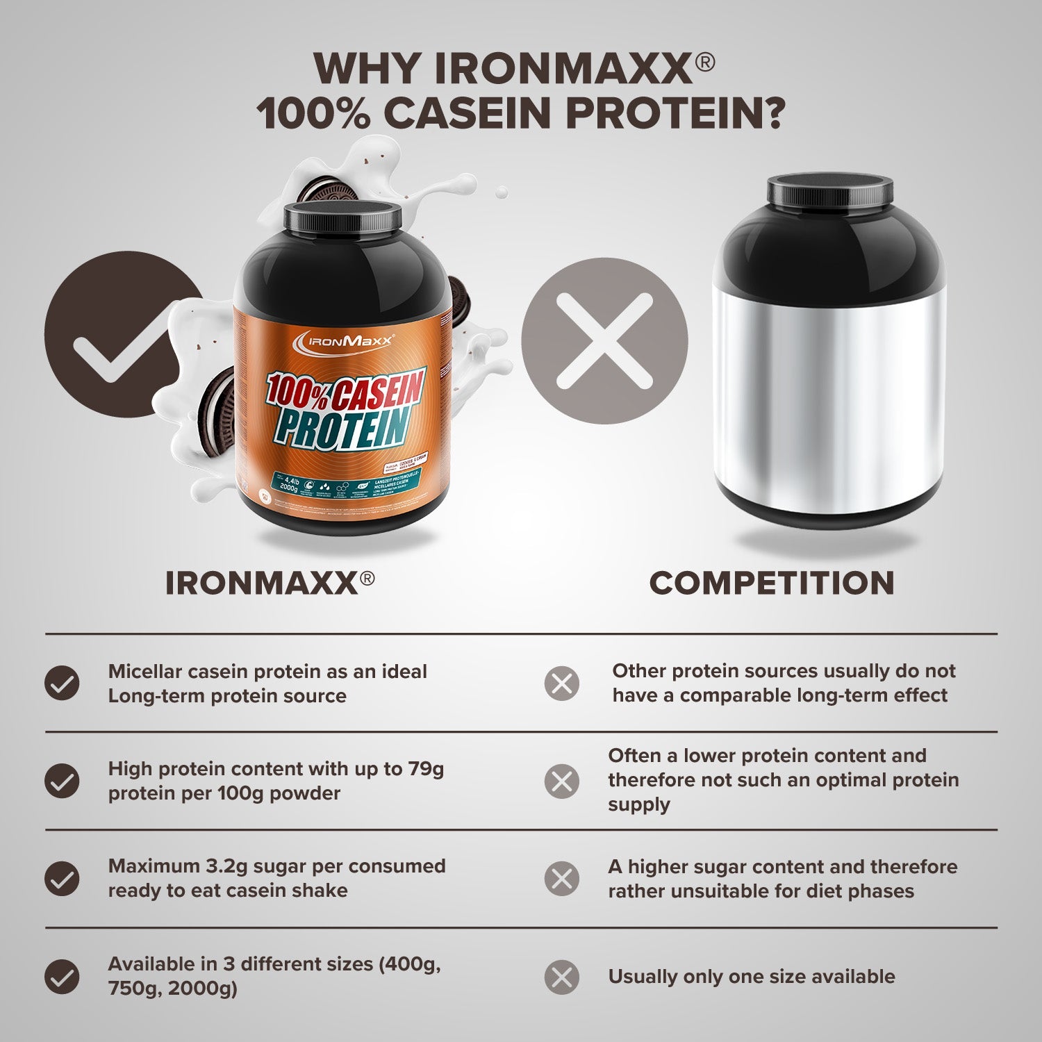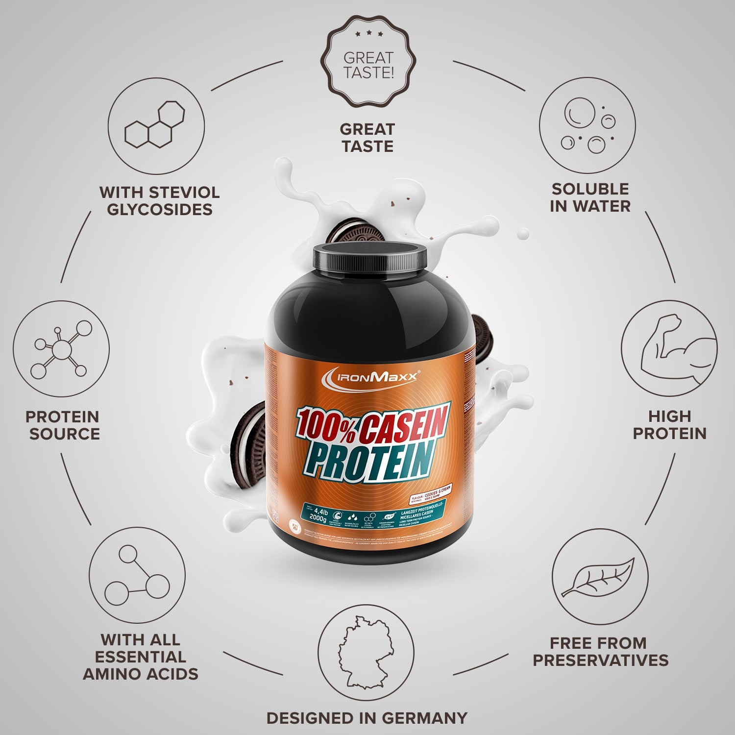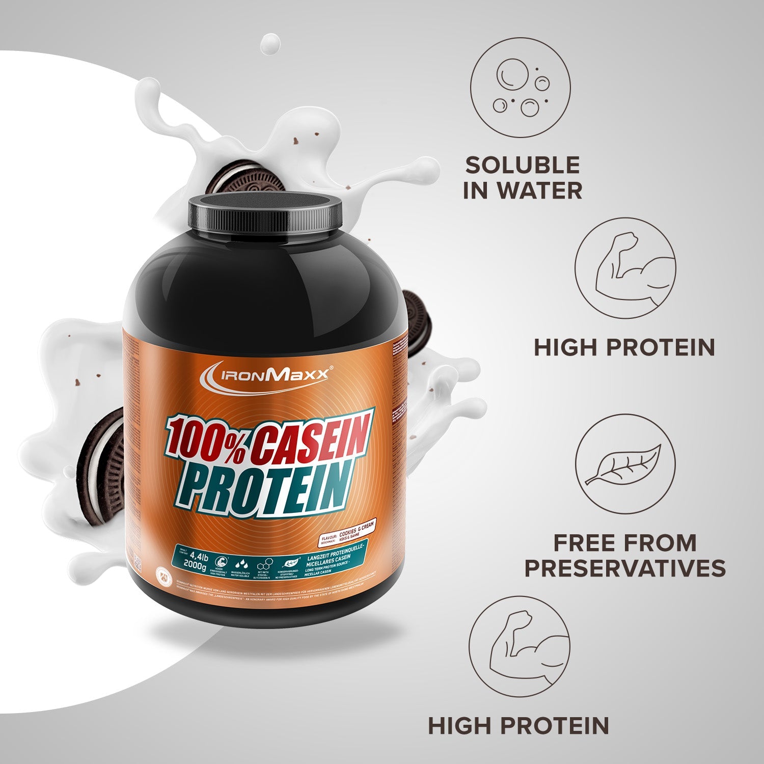 100% Casein Protein von IronMaxx® versorgt deine Muskulatur über viele Stunden mit hochwertigem Eiweiß – ideal vor dem Schlafengehen oder in längeren Fastenphasen. Mit einem Proteingehalt von bis zu 79 % und niedrigem Zuckergehalt ist es die perfekte Wahl für Muskelaufbau und Diätphasen.