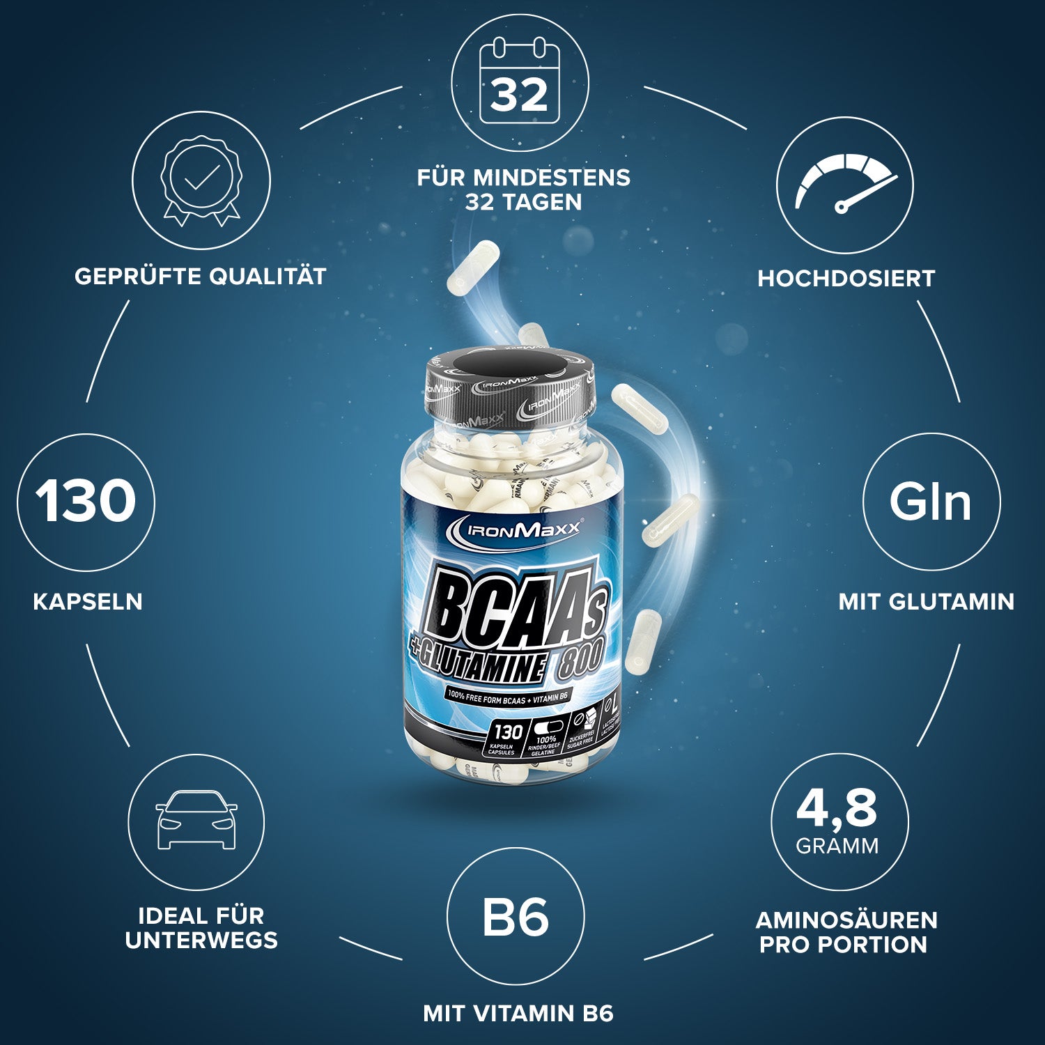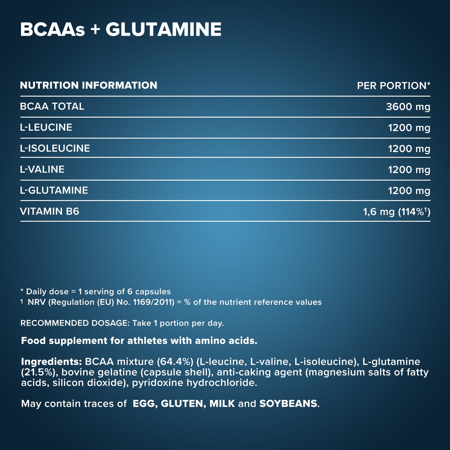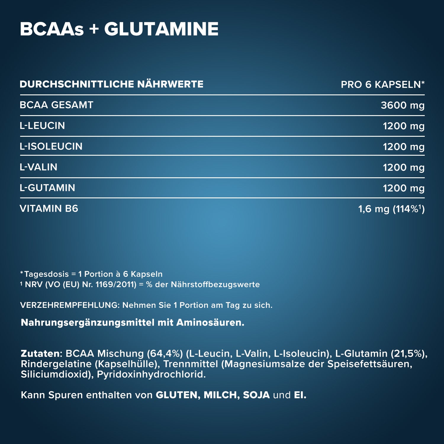 - Aminosäurekapseln, die alle 3 BCAAs + L-Glutamin beinhalten