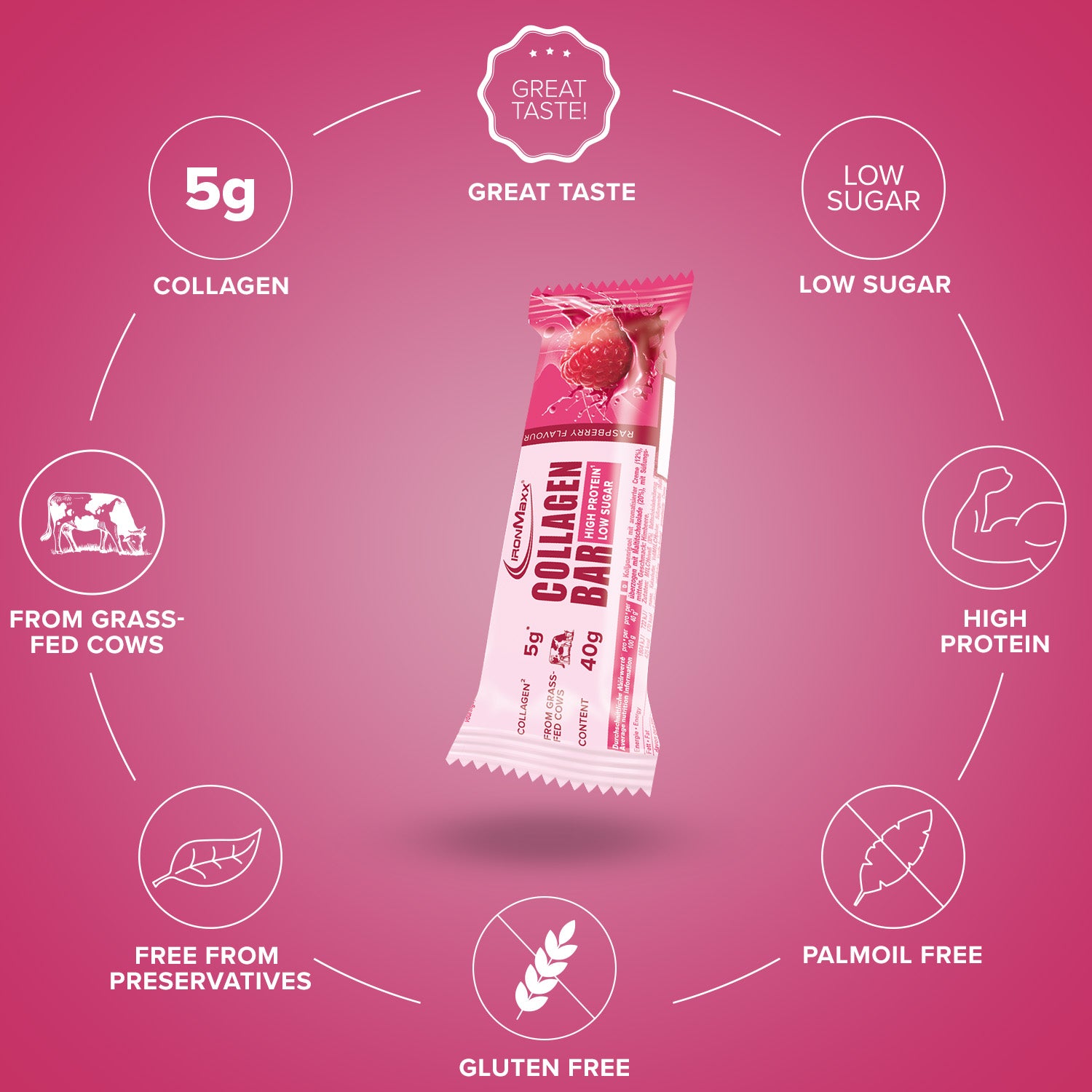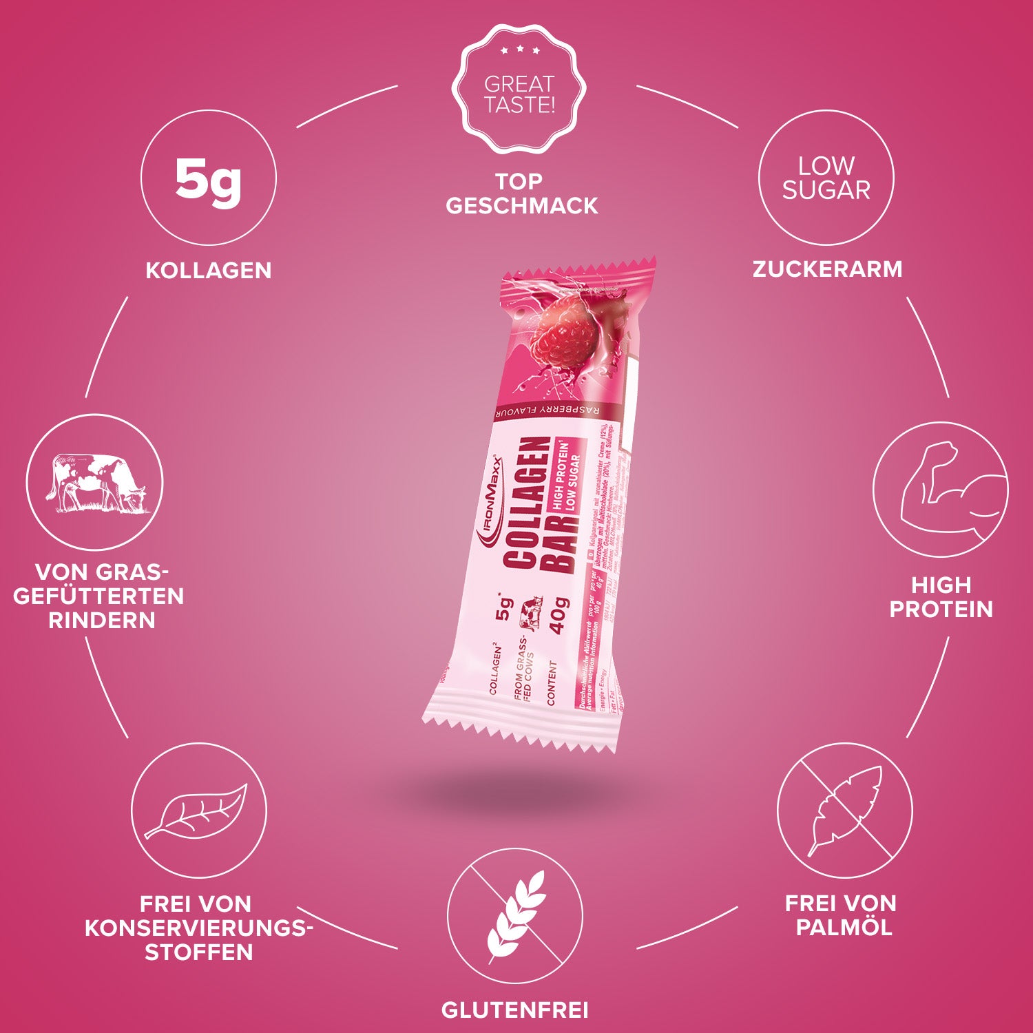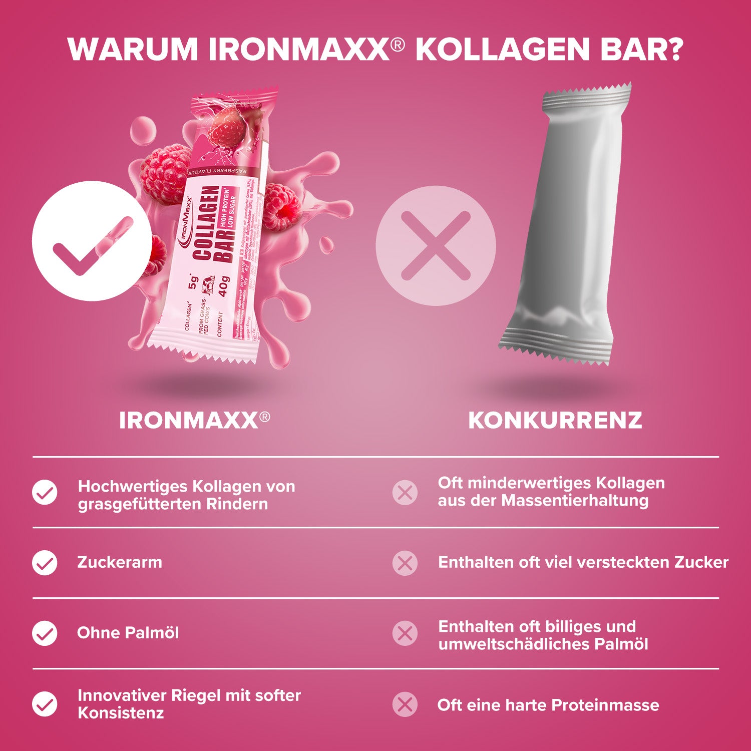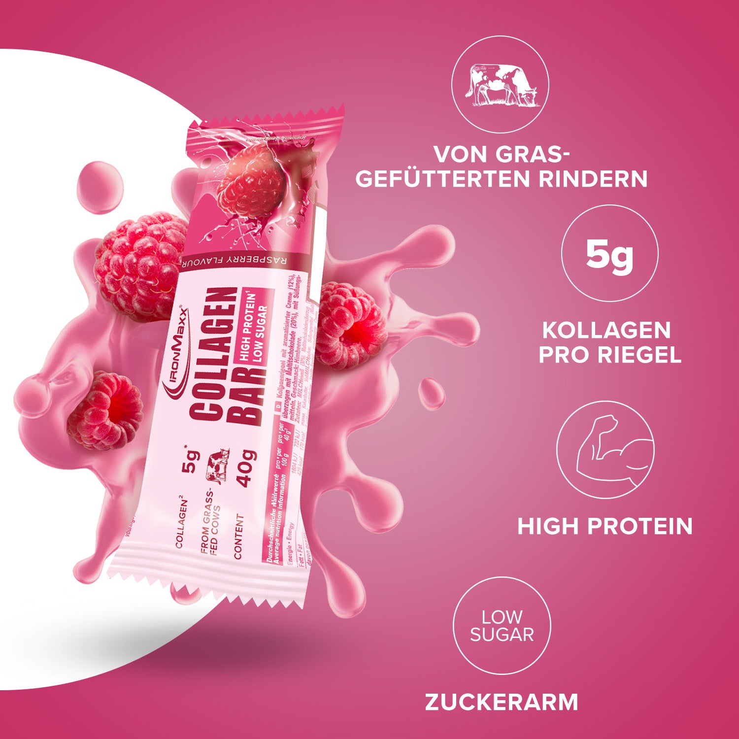 - Ein Tray IronMaxx Collagen Bars beinhaltet 12 Riegel mit à 40g.
