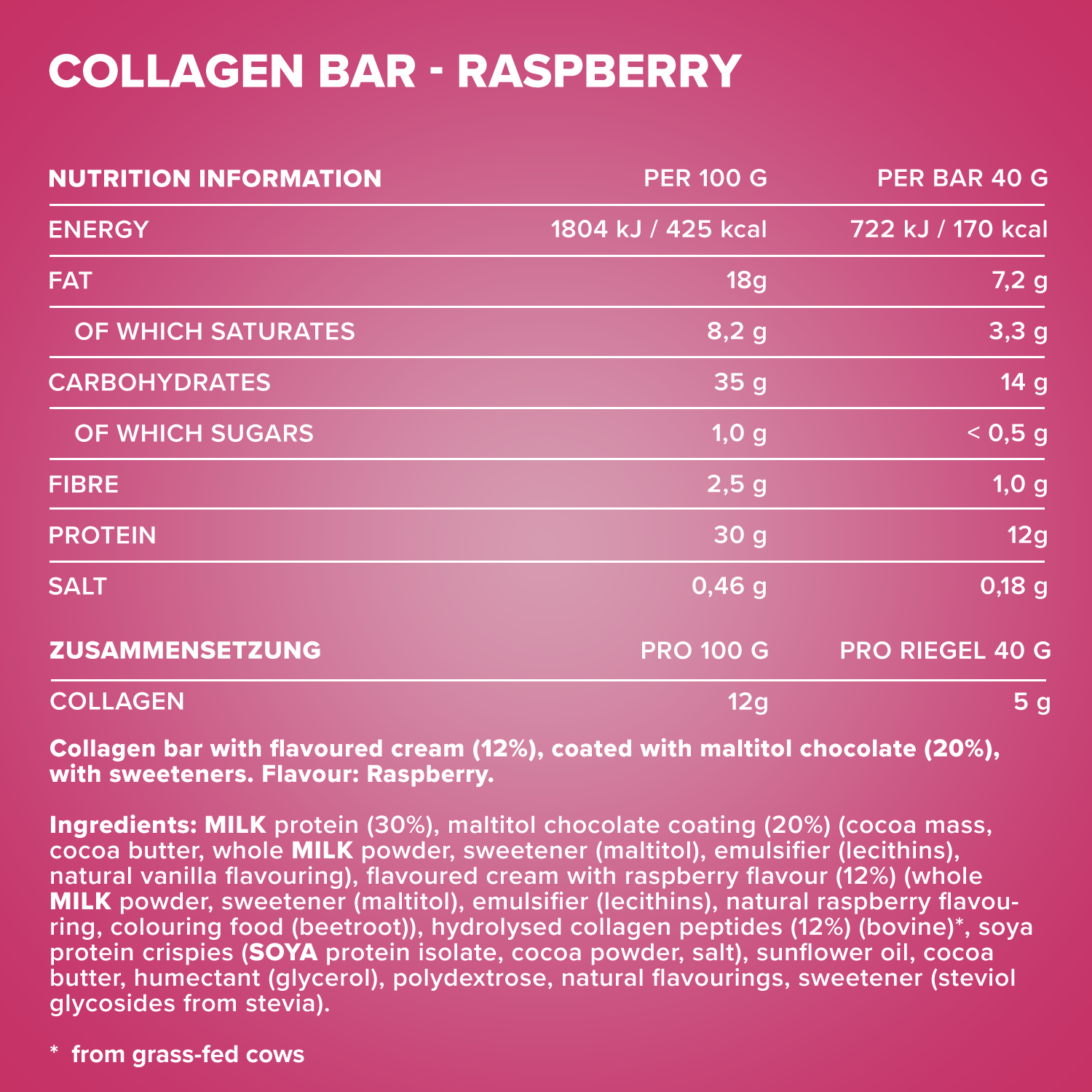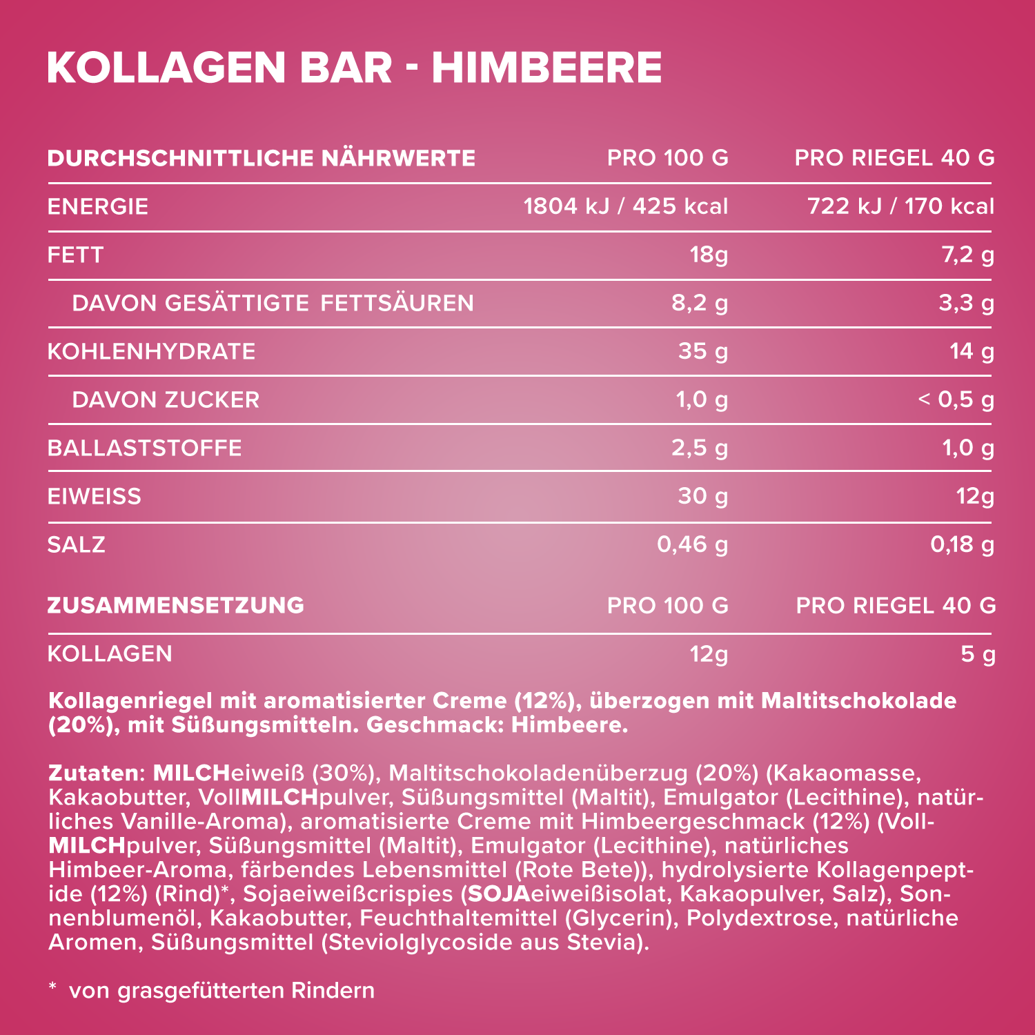 Zutaten: MILCHeiweiß (30%), Maltitschokoladenüberzug (20%) (Kakaomasse, Kakaobutter, VollMILCHpulver, Süßungsmittel (Maltit), Emulgator (Lecithine), natürliches Vanille-Aroma), aromatisierte Creme mit Himbeergeschmack (12%) (VollMILCHpulver, Süßungsmittel (Maltit), Emulgator (Lecithine), natürliches Himbeer-Aroma, färbendes Lebensmittel (Rote Bete)), hydrolysierte Kollagenpeptide (12%) (Rind)2 ,Sojaeiweißcrispies (SOJAeiweißisolat, Kakaopulver, Salz), Sonnen- blumenöl, Kakaobutter, Feuchthaltemittel (Glycerin), Polydextrose, natürliche Aromen, Süßungsmittel (Steviolglycoside aus Stevia).