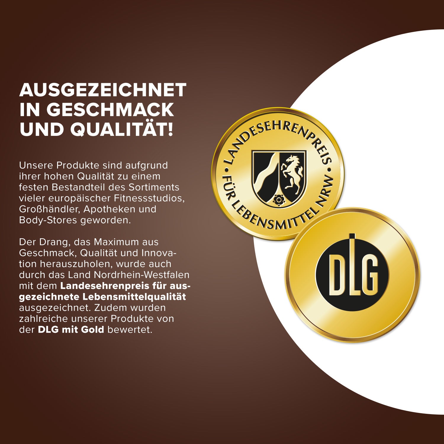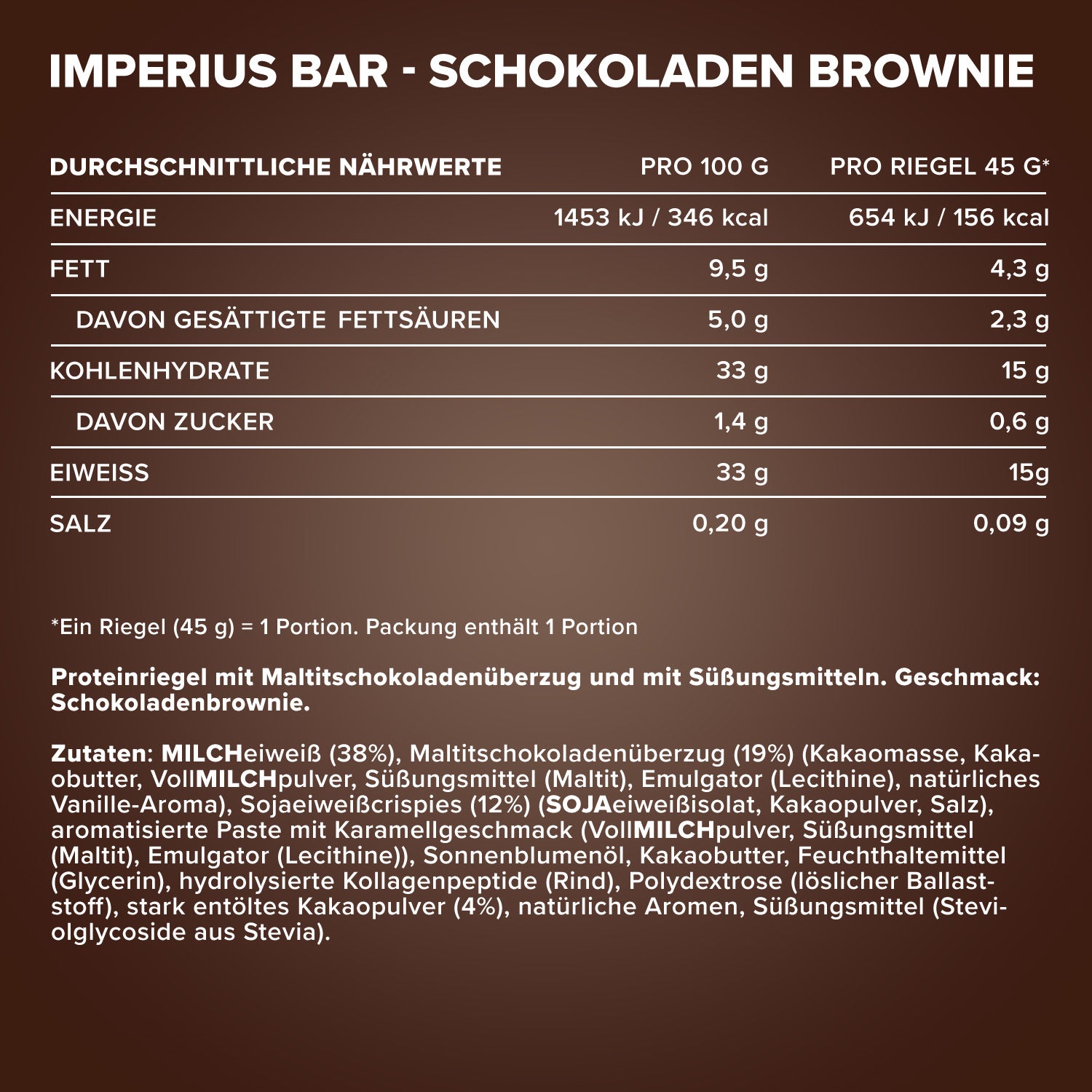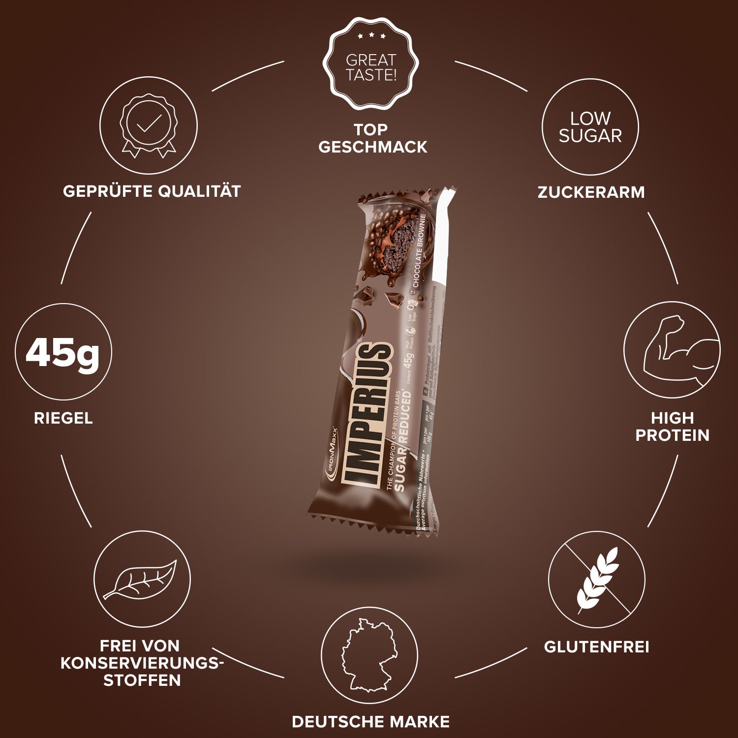 Verkehrsbezeichnung: Proteinriegel mit Maltitschokoladenüberzug und mit Süßungsmitteln. Geschmack: Schokoladenbrownie.