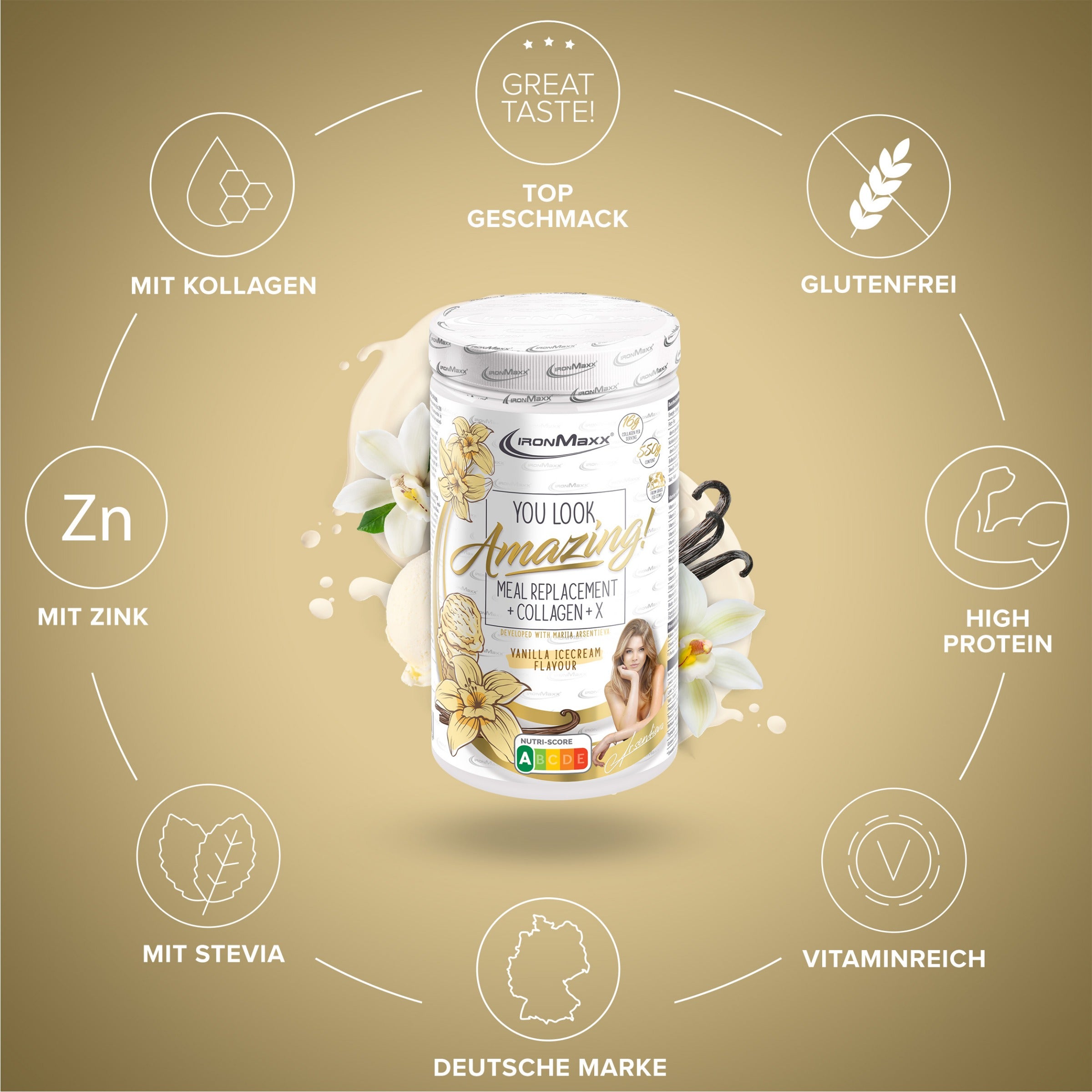 Amazing Food von IronMaxx® ist der ideale Mahlzeitenersatz für alle, die Wert auf bewusste Ernährung, innere Schönheit und hochwertige Nährstoffe legen. Mit 25 g Protein, Kollagen aus Weidehaltung sowie 24 Vitaminen und Mineralstoffen pro Portion unterstützt es deinen Körper optimal – ganz ohne Gluten und mit nur 208 kcal.