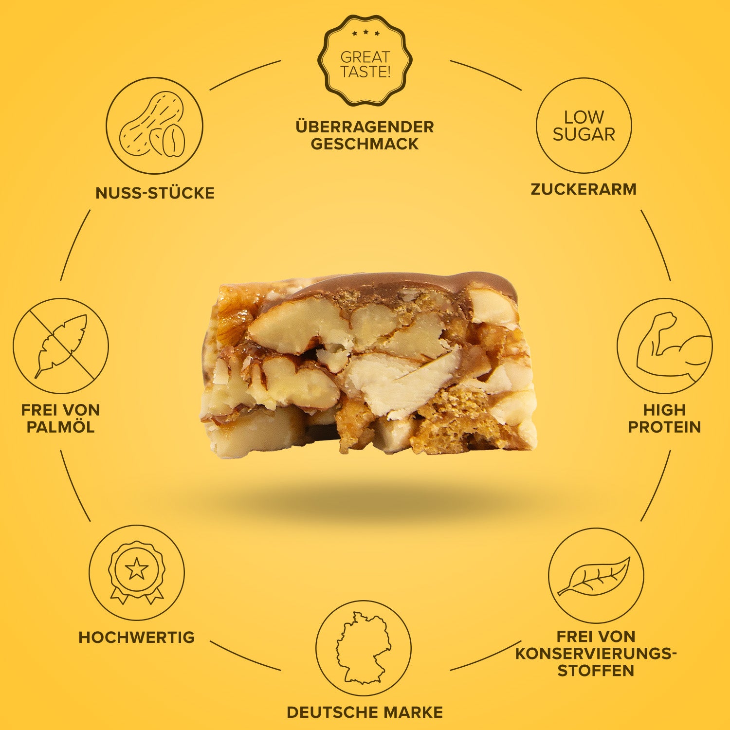 - Besonderer Crunch aufgrund der Kombination aus Nüssen und Eiweißcrispies!