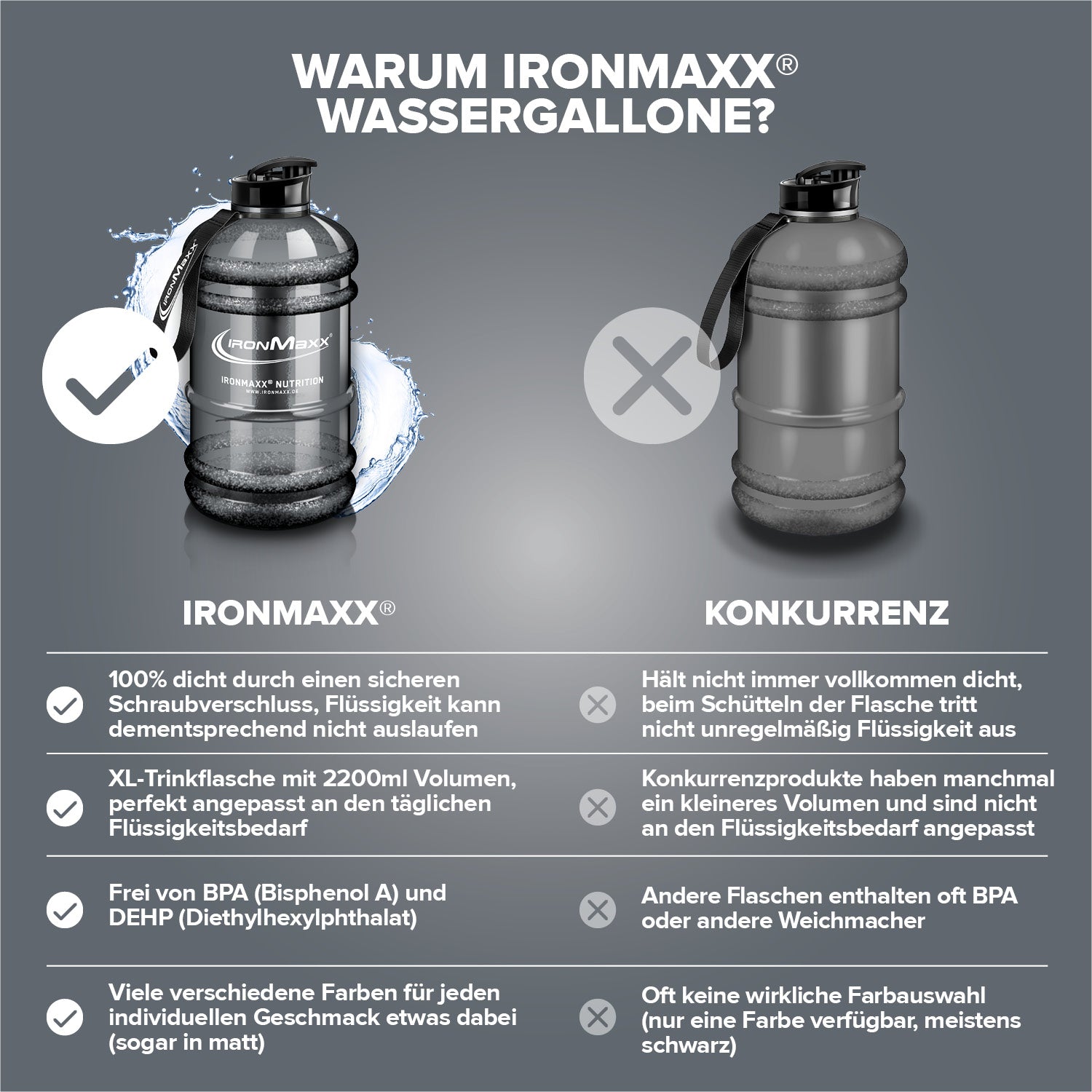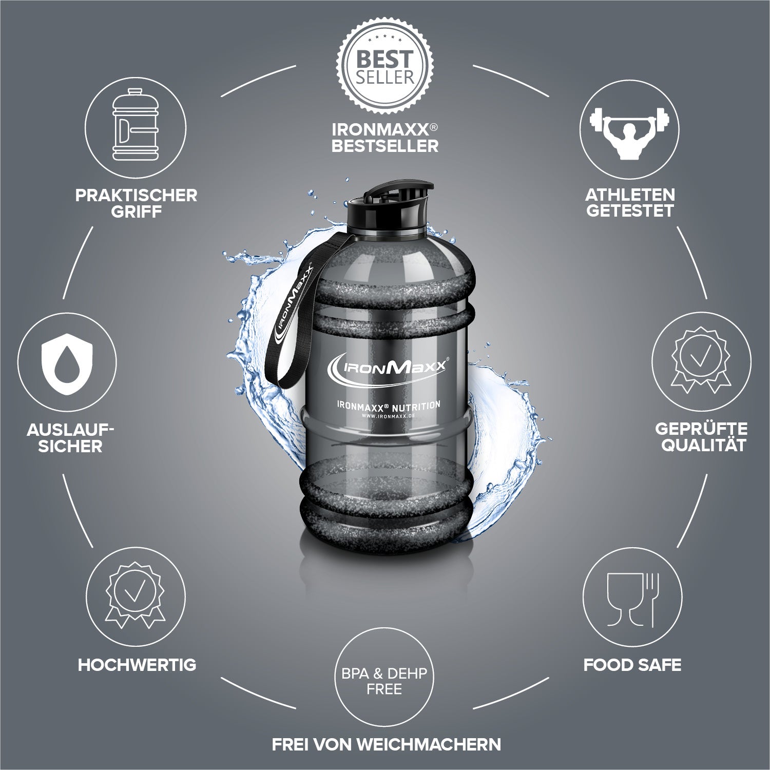 Vergisst du oft, genug Wasser zu trinken? Dann ist die IronMaxx® Water Gallon dein perfekter Begleiter im Alltag. Mit einem Fassungsvermögen von 2,2 Litern hilft dir diese stylische XL-Trinkflasche, deinen Flüssigkeitshaushalt optimal zu decken – egal ob im Gym, im Büro oder unterwegs.