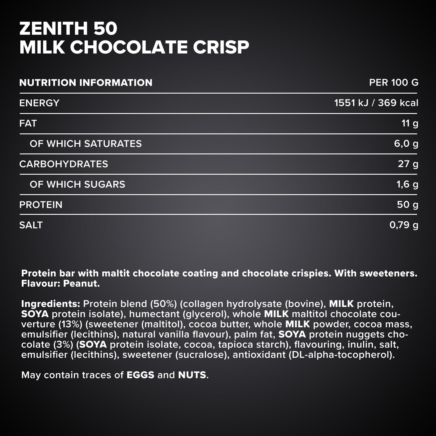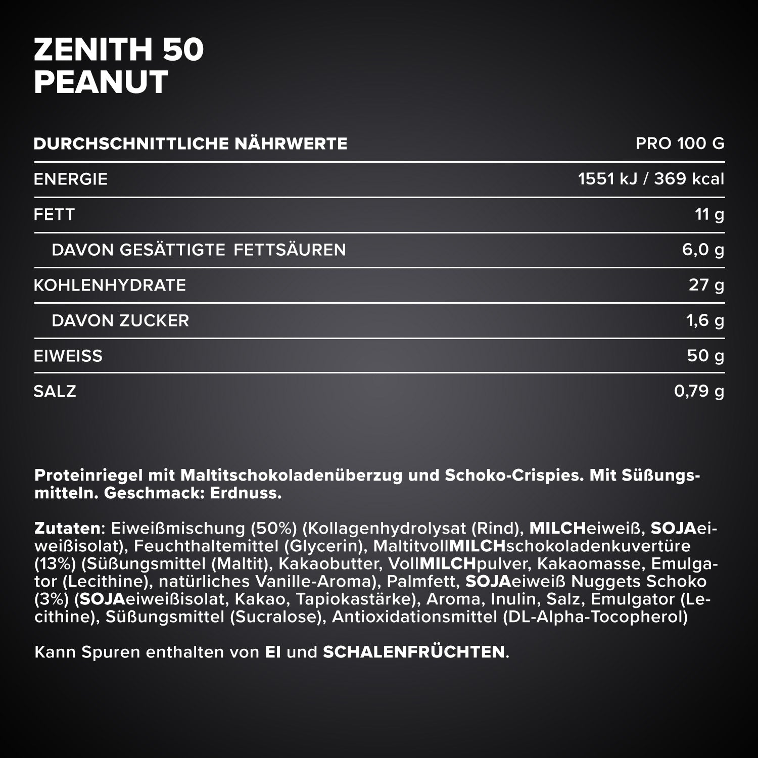 - High Protein Riegel: Der ZENITH® 50 High Protein Bar von IronMaxx® überzeugt mit 50 % Eiweiß – der höchste Proteingehalt in unserem Sortiment.