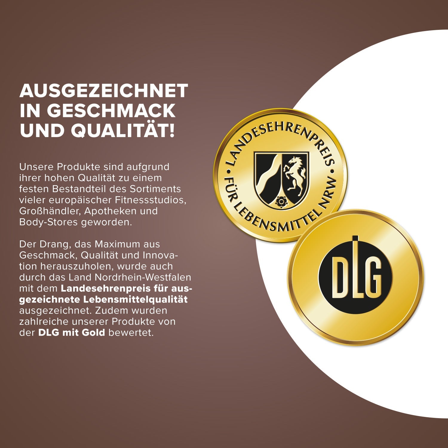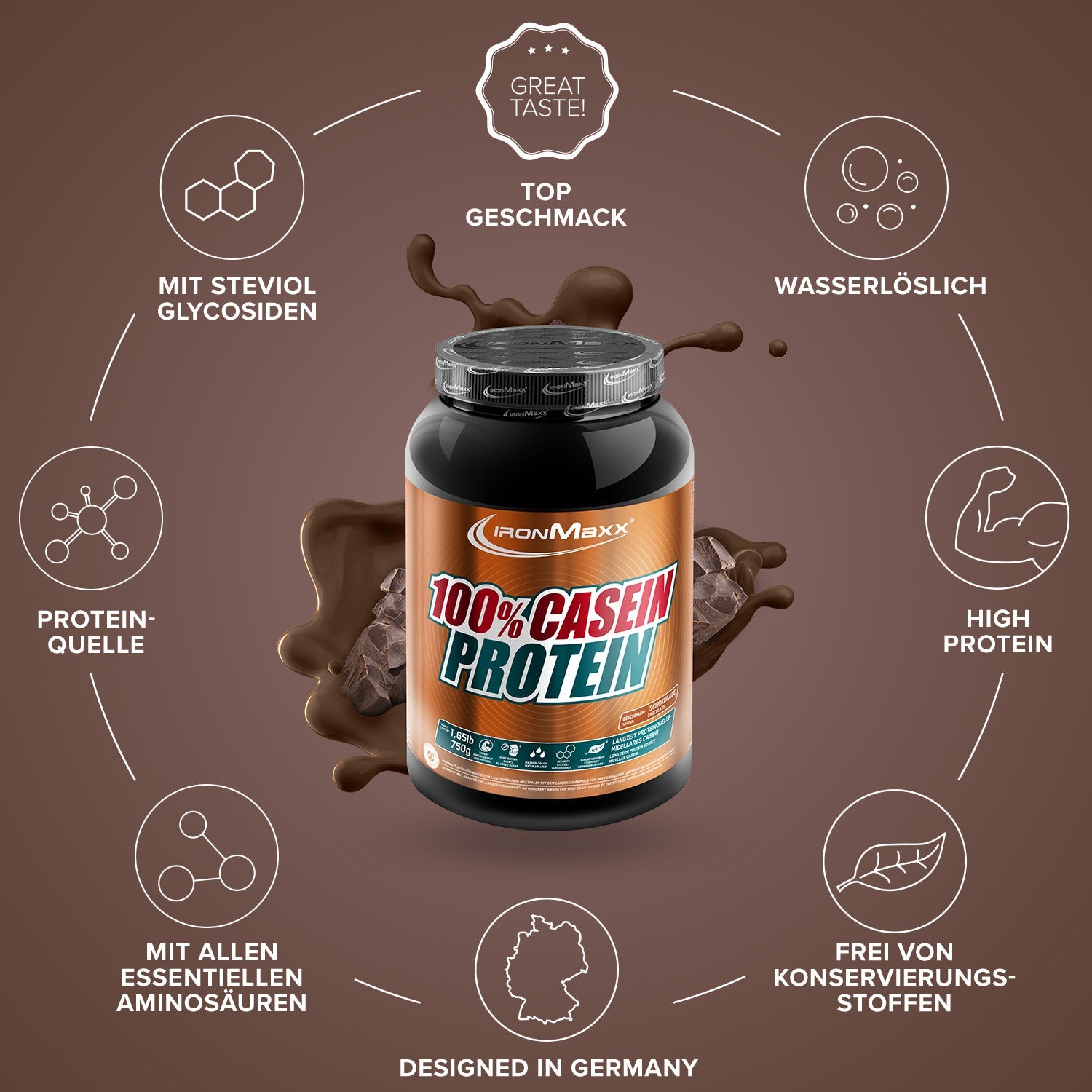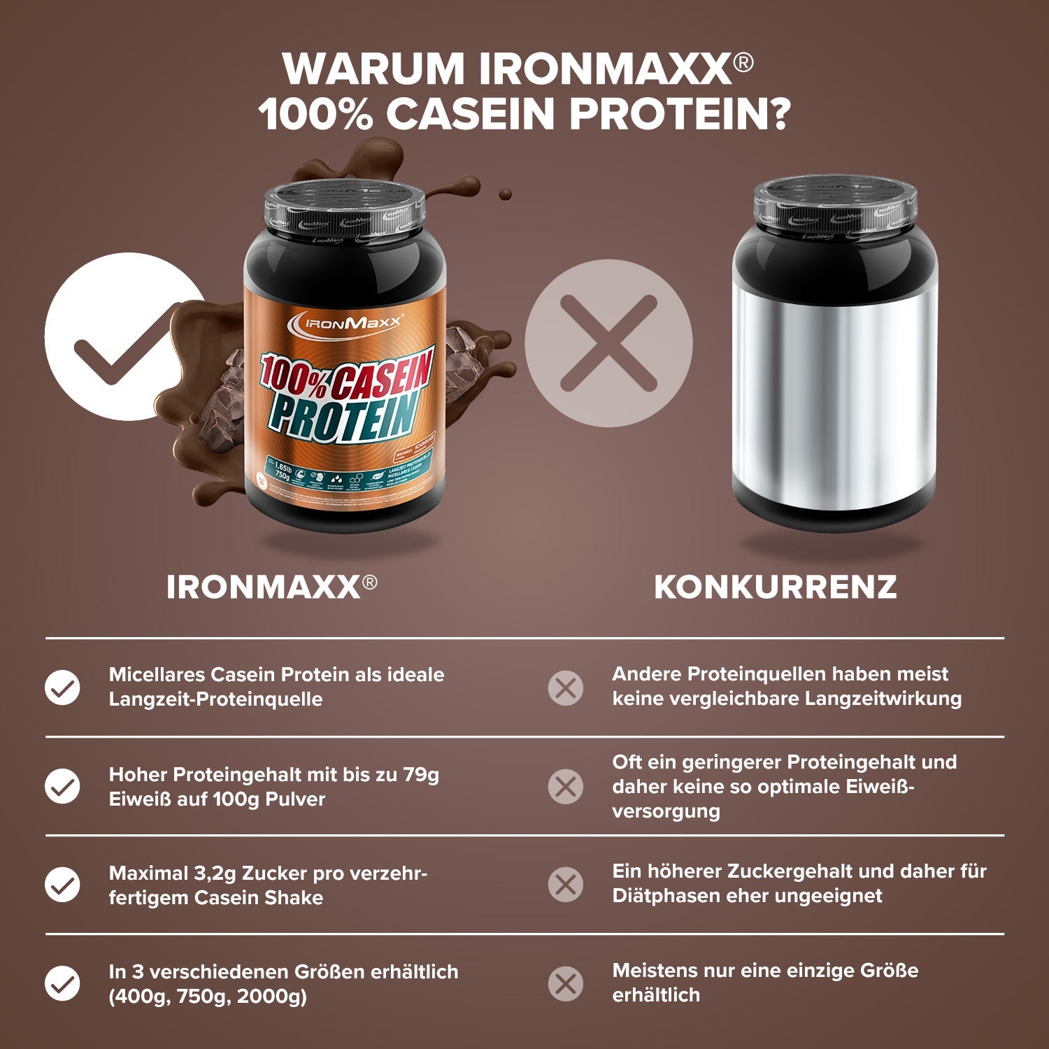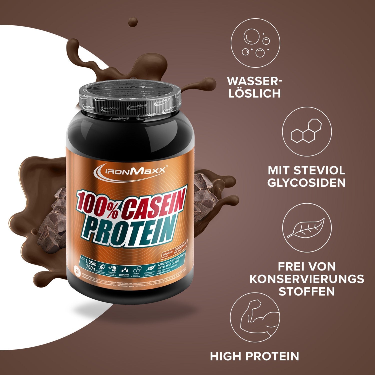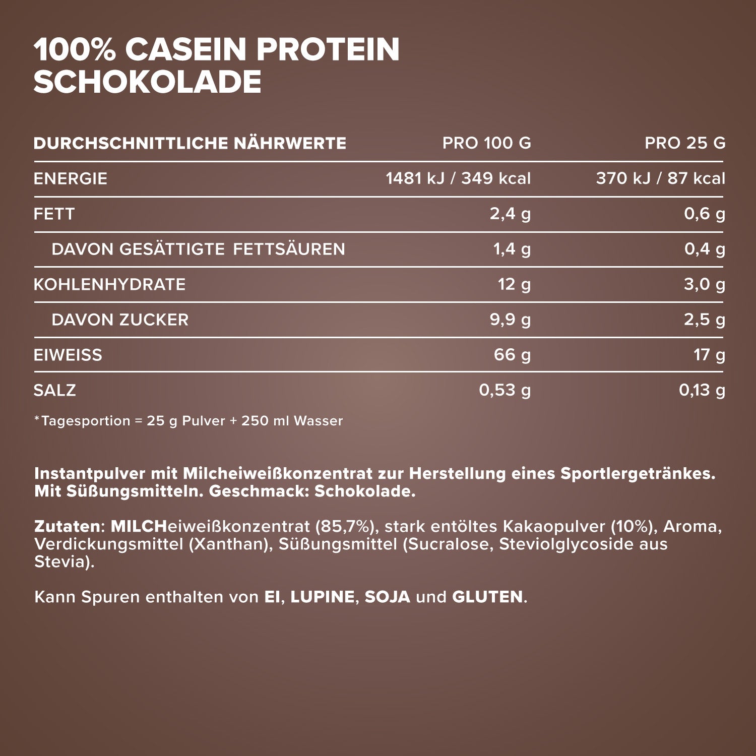 - The 100% casein protein is highly dosed with up to 70g protein per 100g powder!