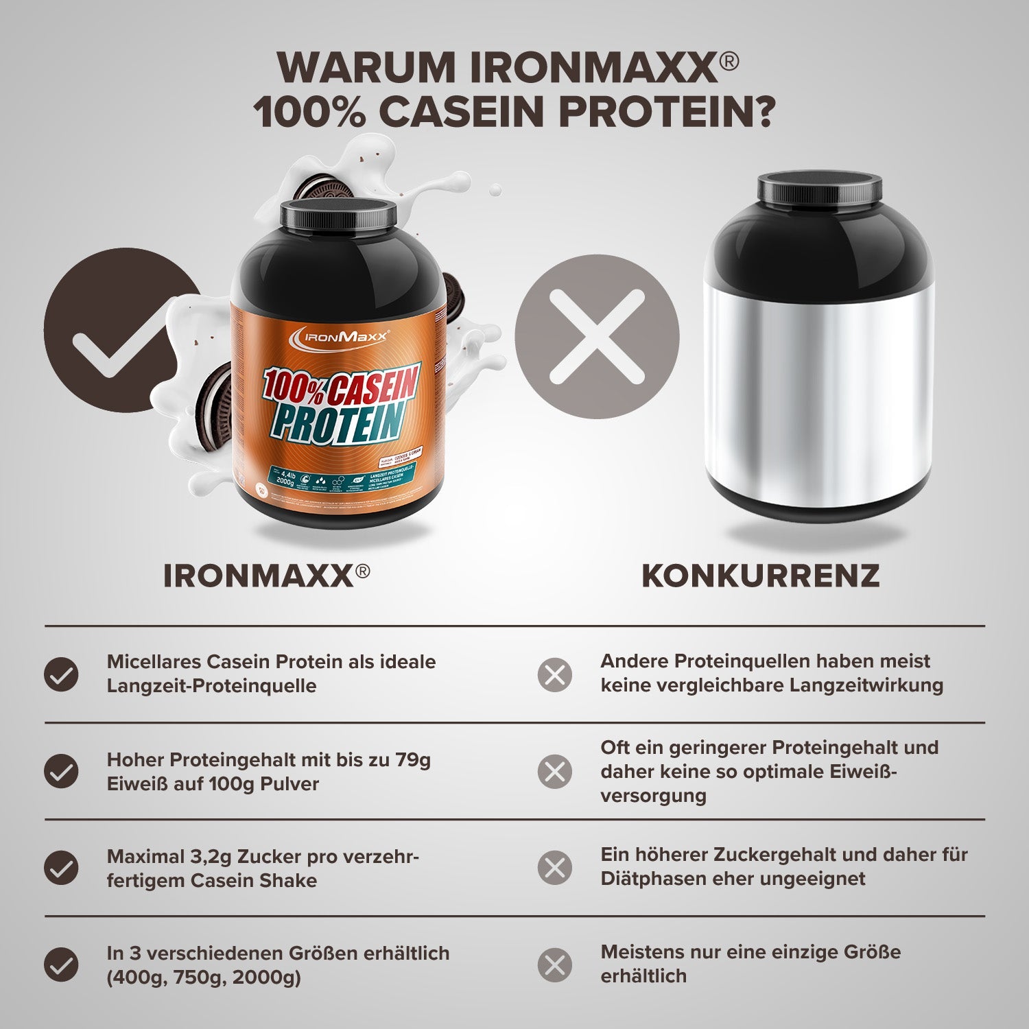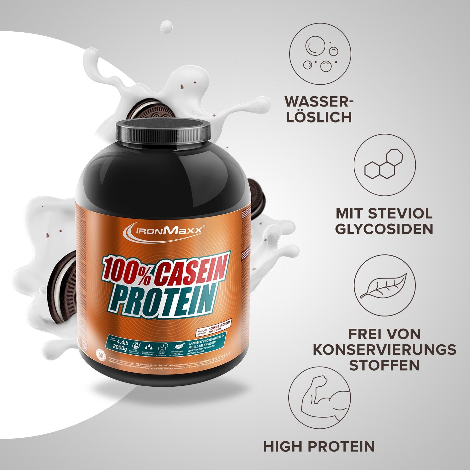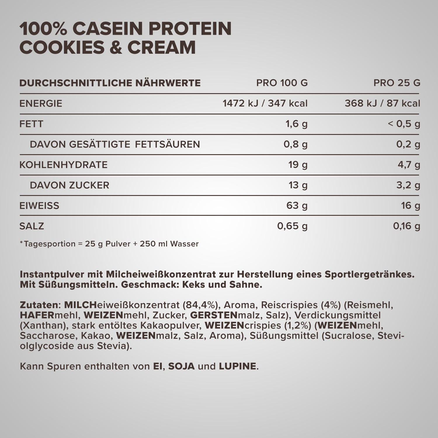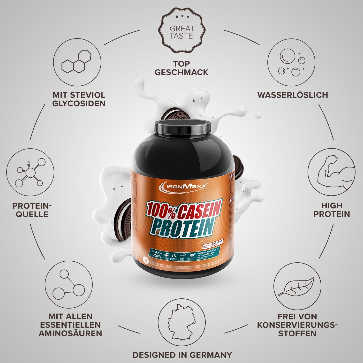 - The 100% Casein Protein is highly dosed with up to 70g of protein per 100g of powder!