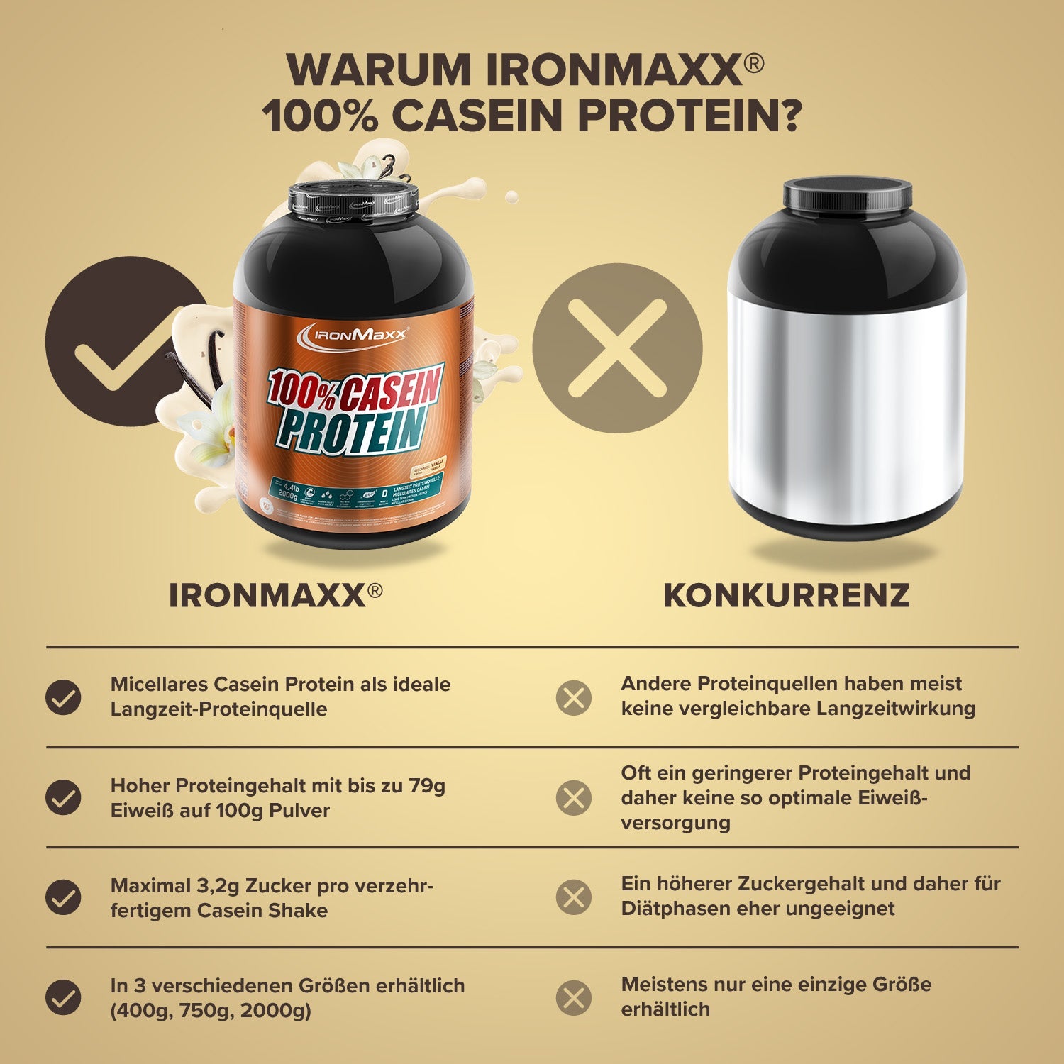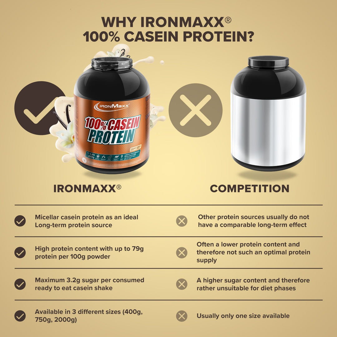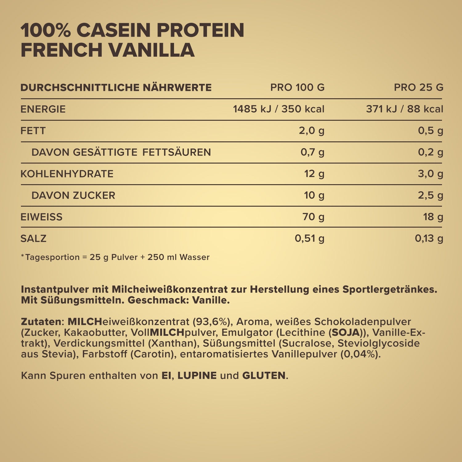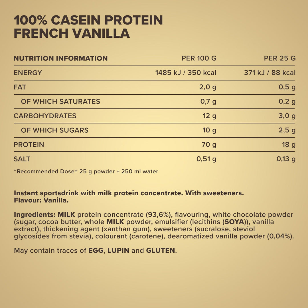 - The 100% Casein Protein is highly dosed with up to 70g of protein per 100g of powder!