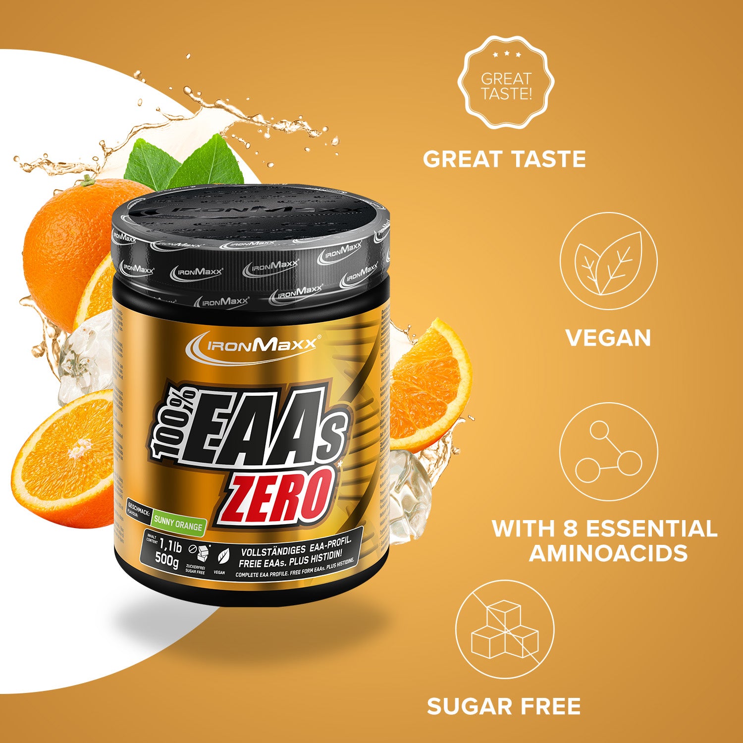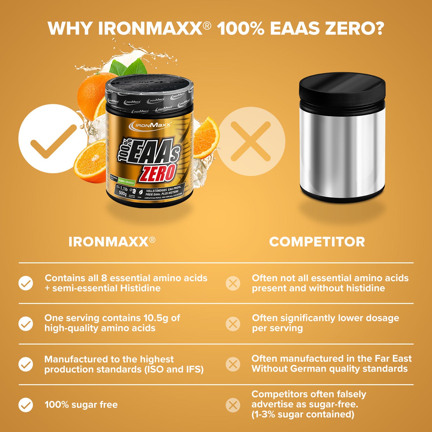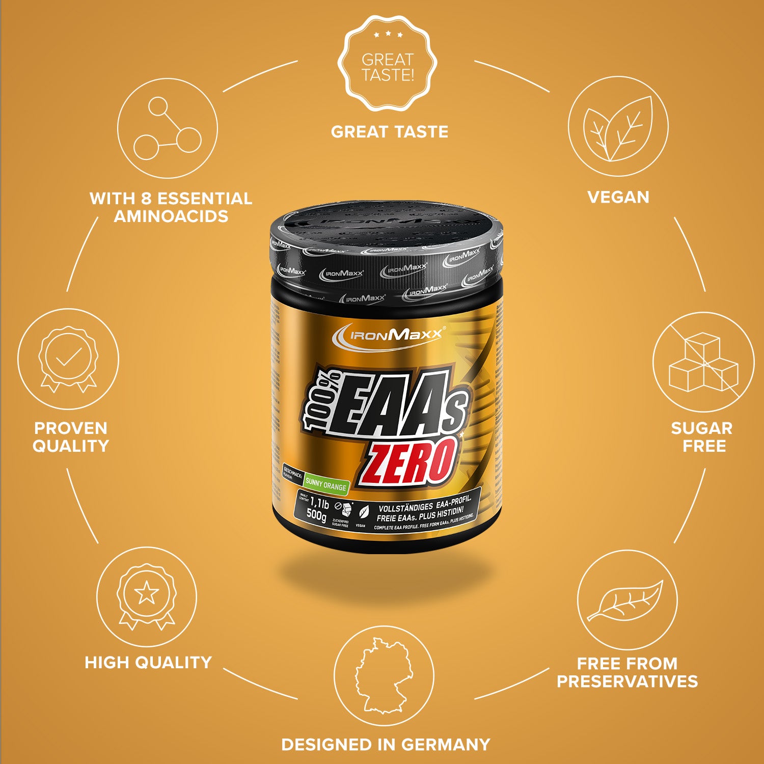 With 100% EAAs Zero + Protein from IronMaxx®, you combine essential amino acids and premium-quality protein in one product – ideal for supporting muscle function and recovery. This EAA powder impresses with its fruity flavour, ultra-fine solubility, and rapid absorption – perfect before, during, or after your workout.