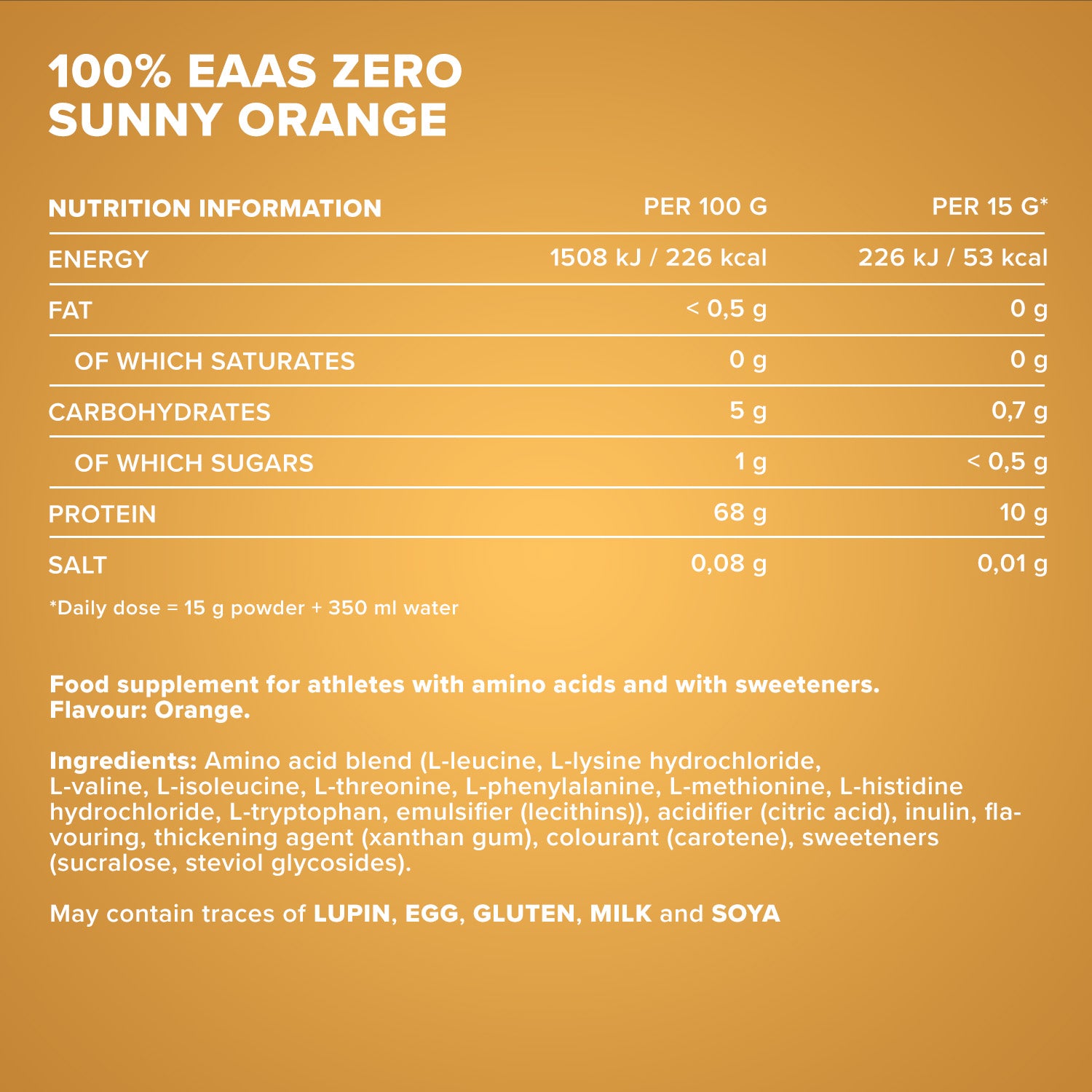 Amino acid mixture (L-Leucine, L-Lysine hydrochloride, L-Valine, L-Isoleucine, L-Threonine, L-Phenylalanine, L-Methionine, L-Histidine hydrochloride, L-Tryptophan, Emulsifier (Lecithins)), Acidifier (Citric acid), Inulin, Flavoring, Thickening agent (Xanthan), Colorant (Carotene), Sweeteners (Sucralose, Steviol glycosides). May contain traces of LUPINS,EGG,GLUTEN,MILK and SOY.