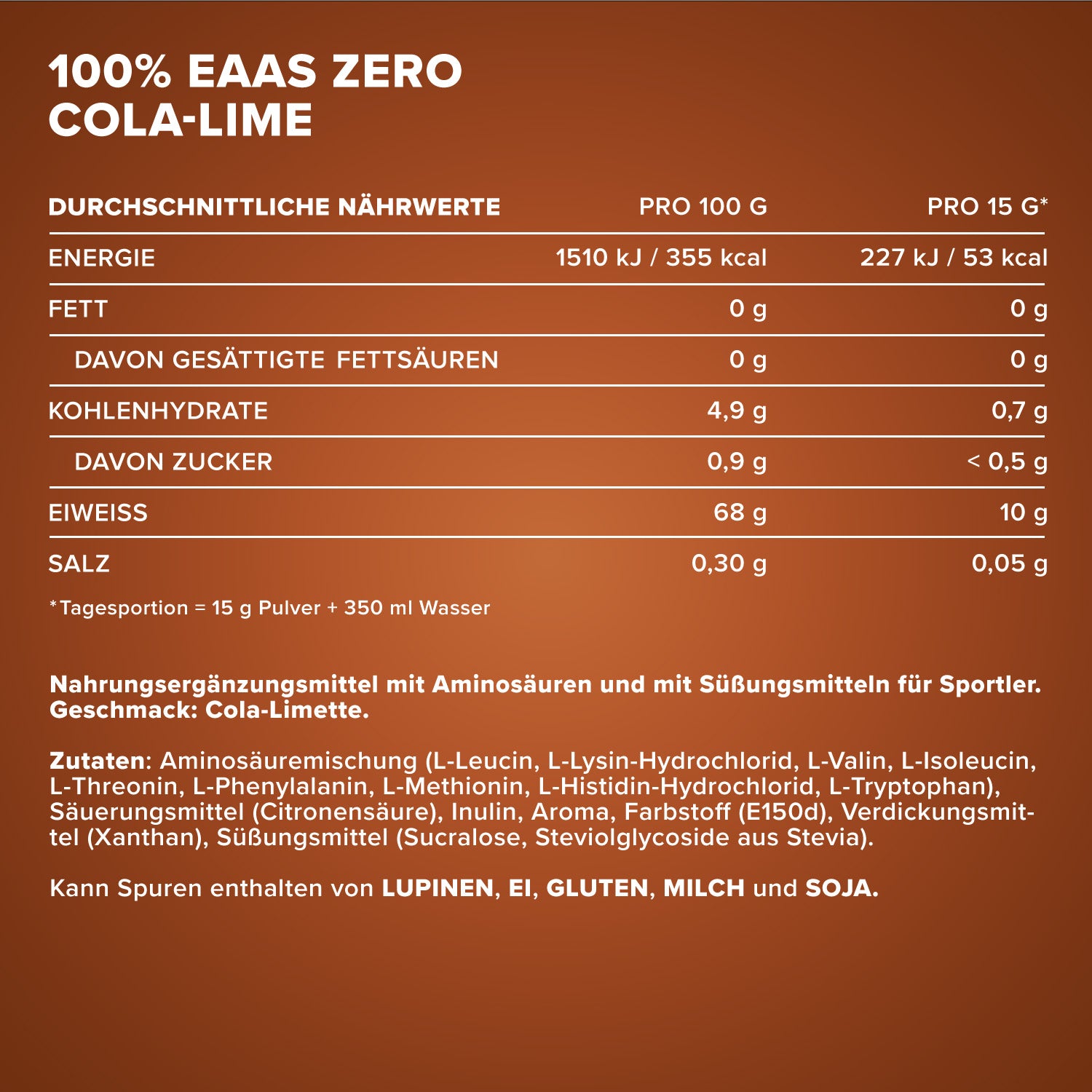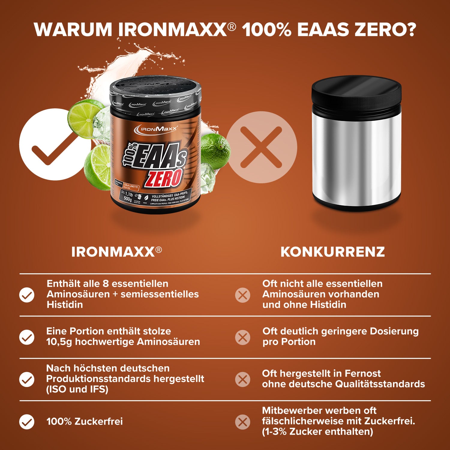 - Our recommendation: Combine our 100% EAAs Zero sensibly with our 100% Whey Protein with high protein content!