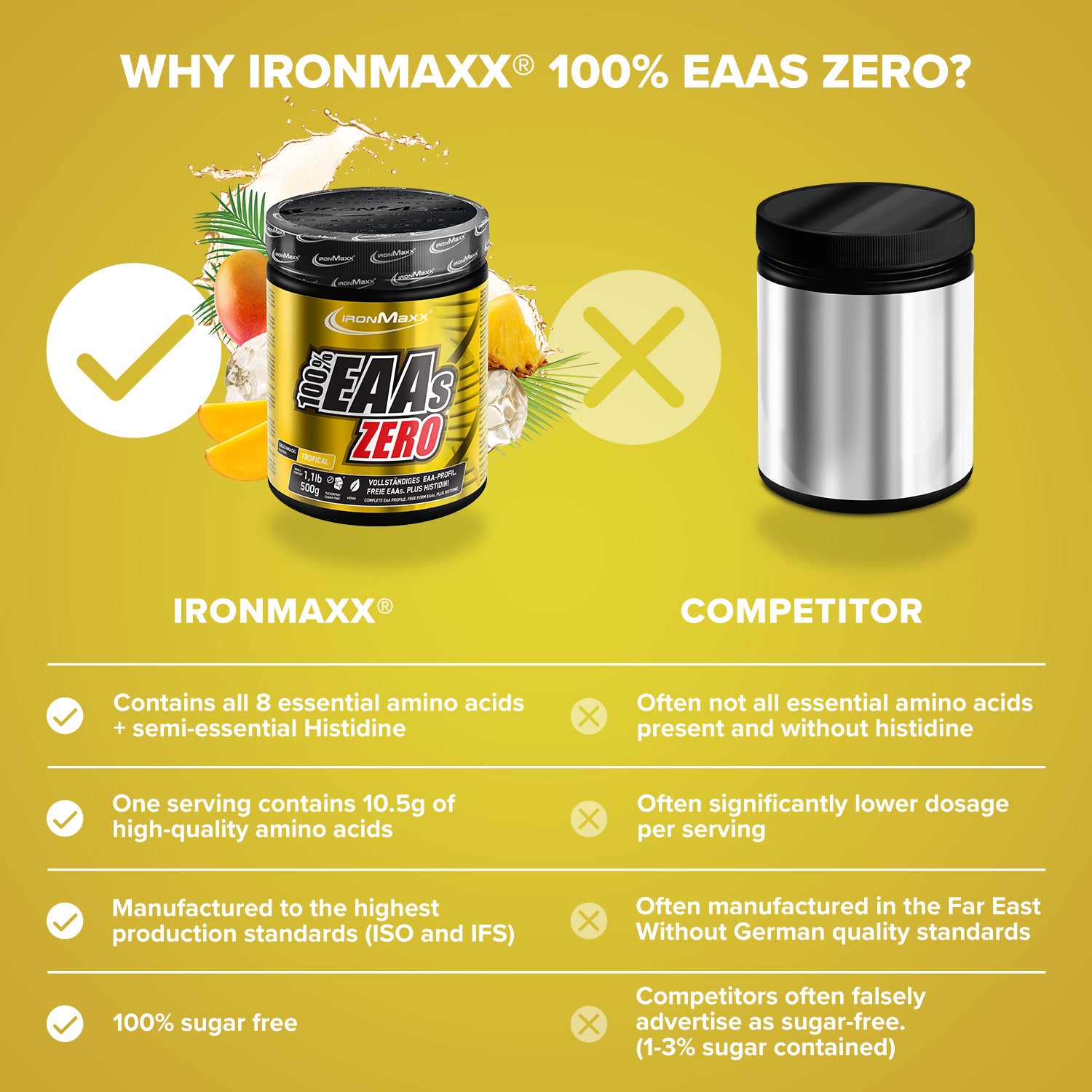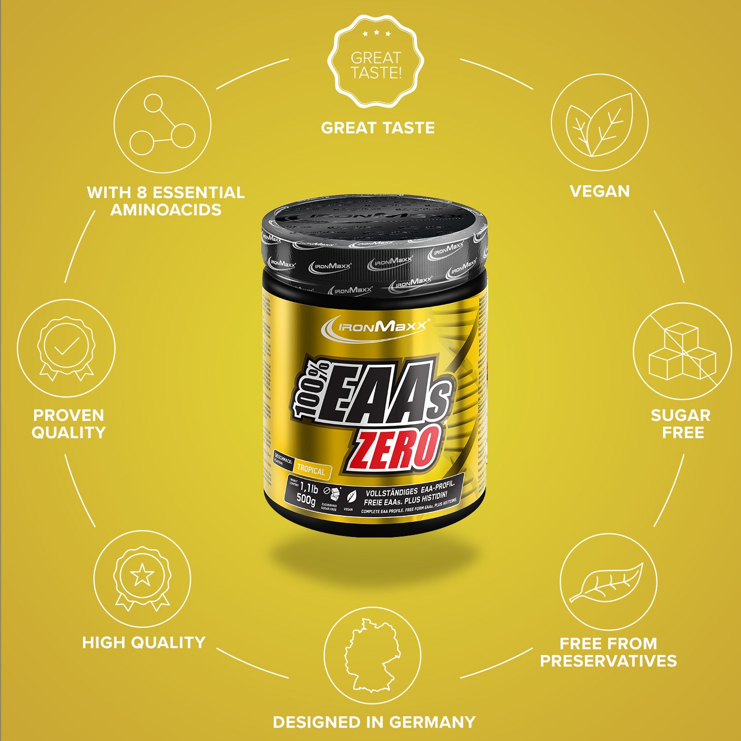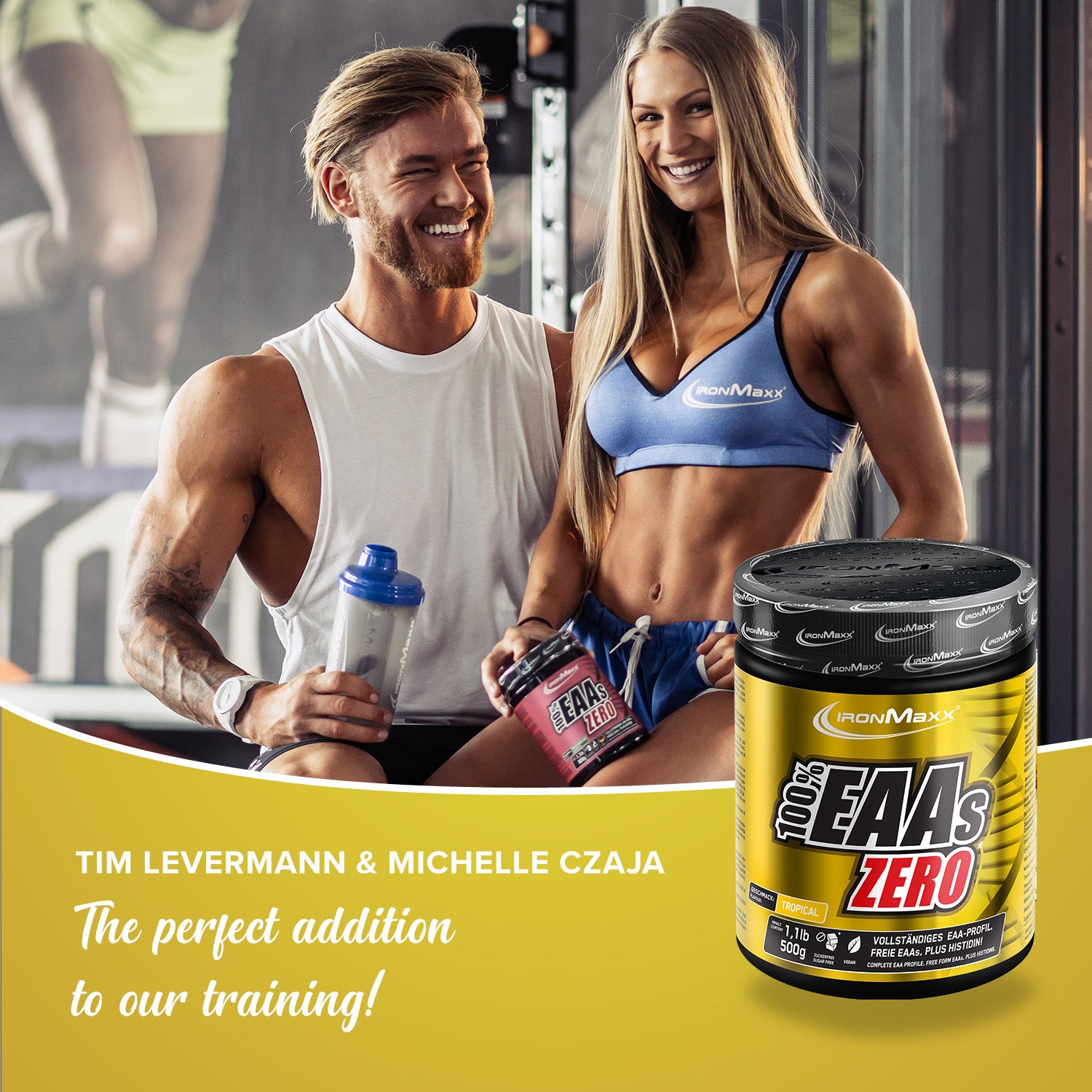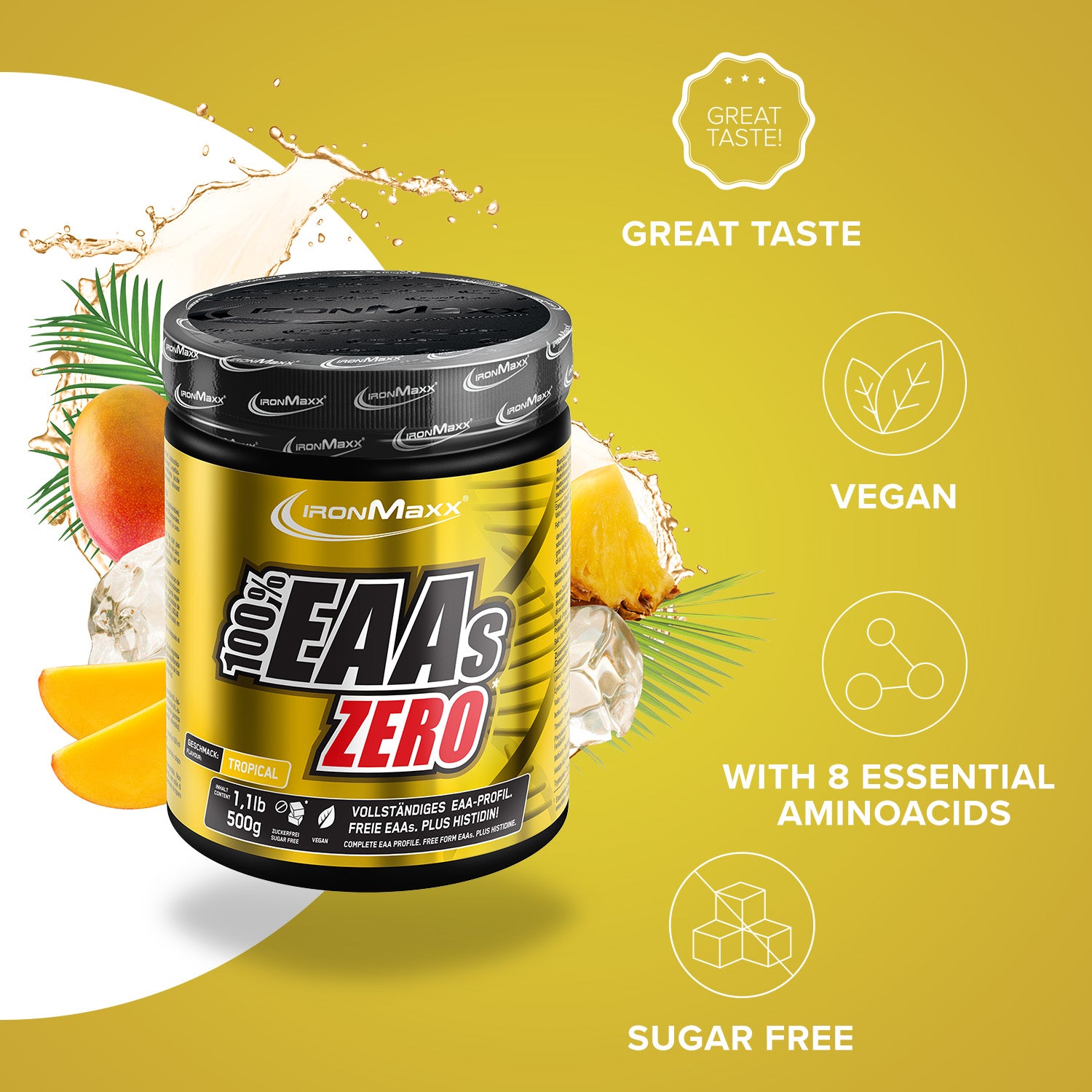 With 100% EAAs Zero + Protein from IronMaxx®, you combine essential amino acids and premium-quality protein in one product – ideal for supporting muscle function and recovery. This EAA powder impresses with its fruity flavour, ultra-fine solubility, and rapid absorption – perfect before, during, or after your workout.