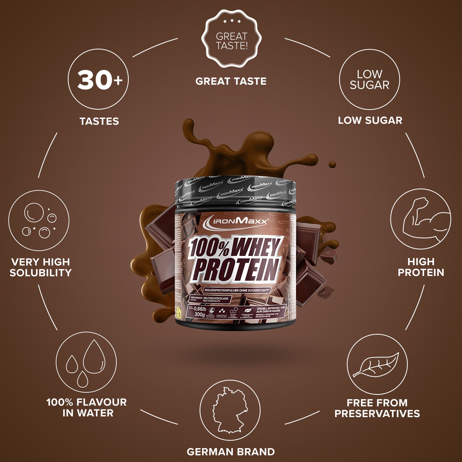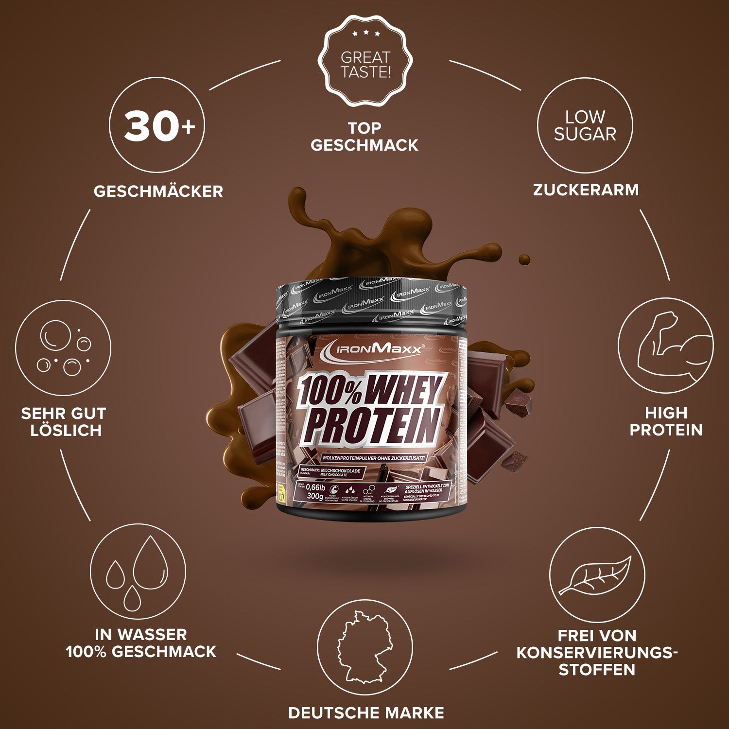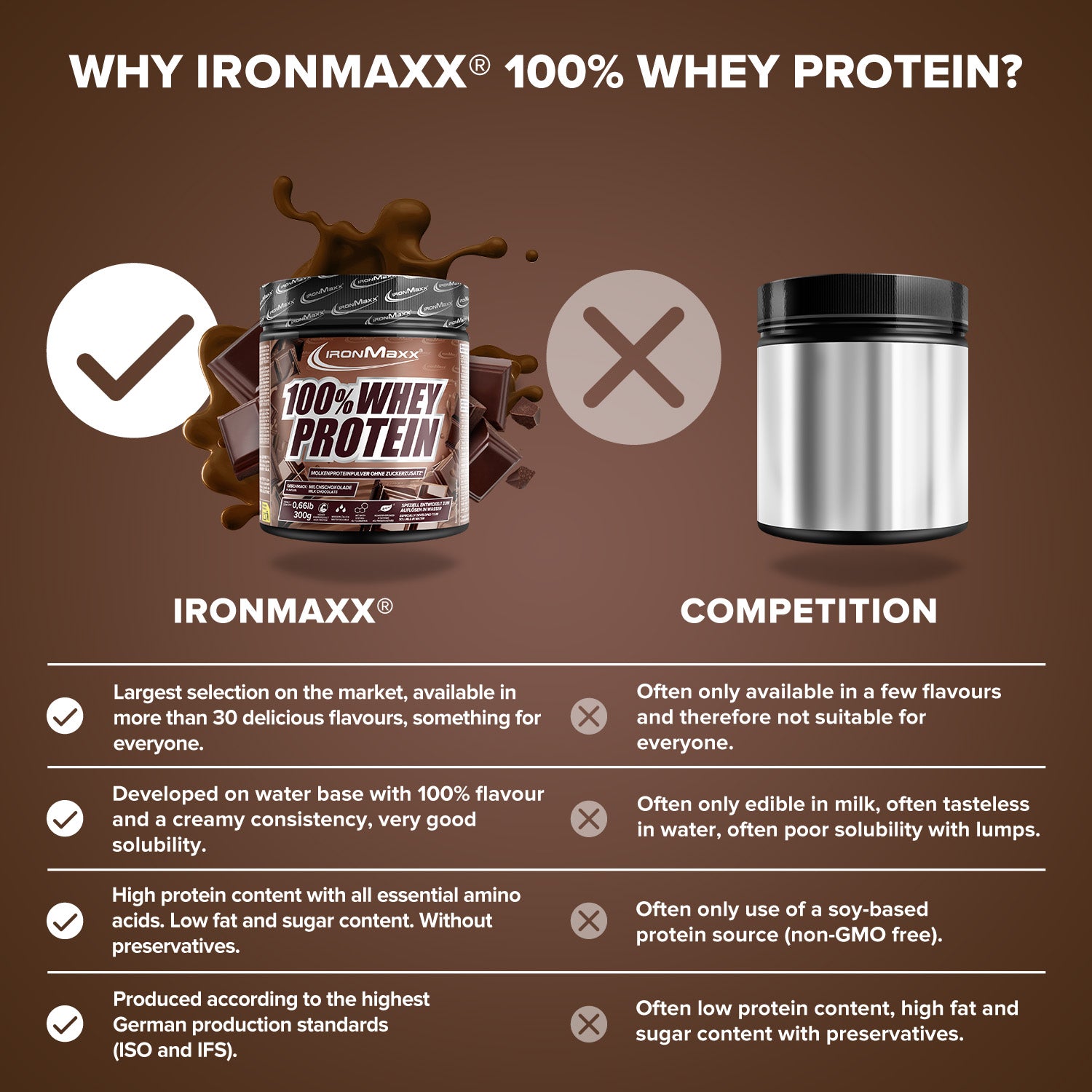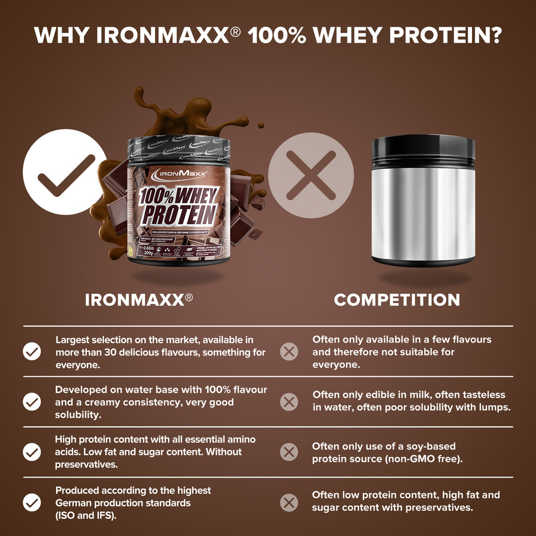 IronMaxx® 100% Whey Protein is one of the most popular protein shakes for muscle growth, recovery and cutting phases. With up to 80% protein, a complete amino acid profile (including BCAAs and EAAs) and a creamy, delicious taste, it is the perfect companion for your fitness lifestyle.