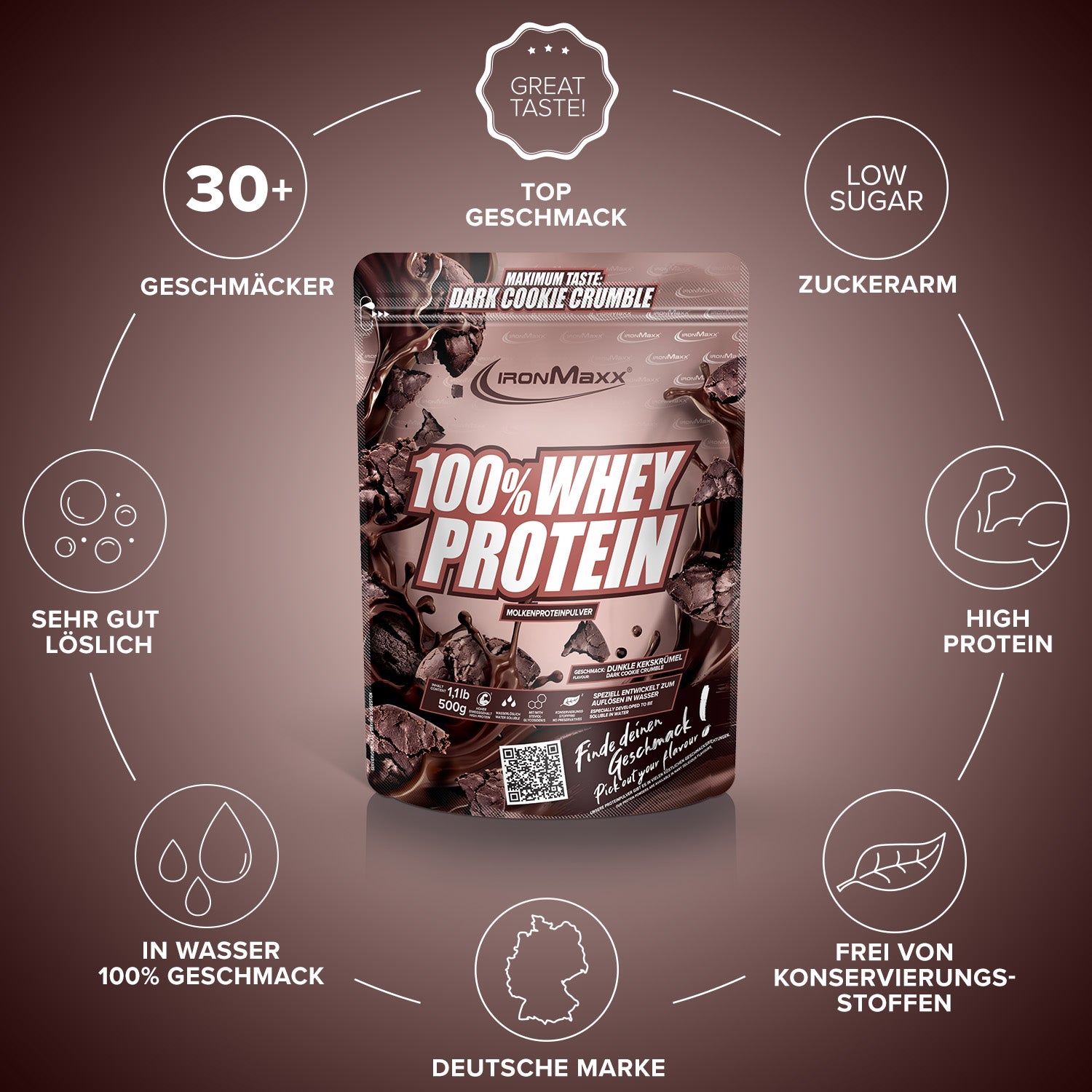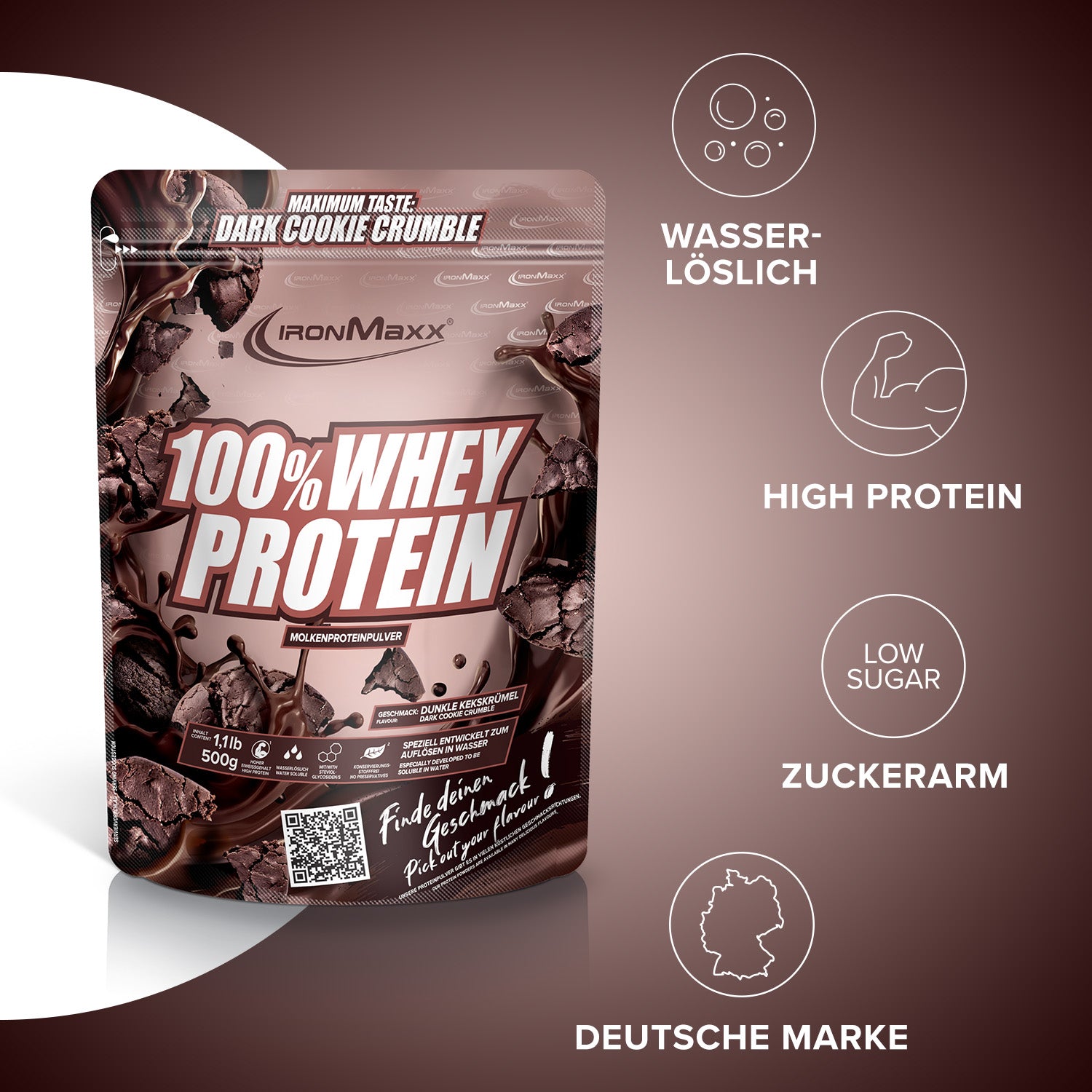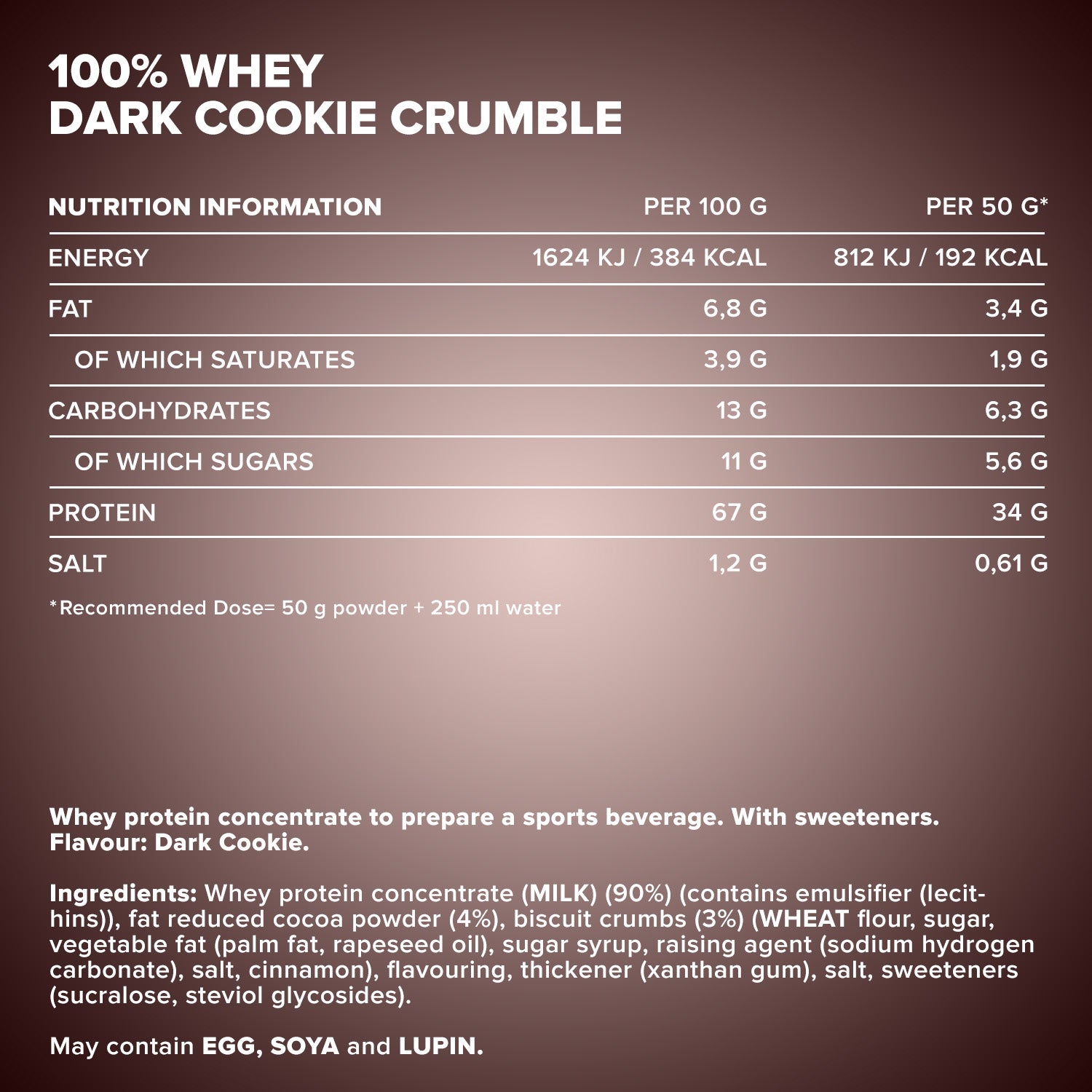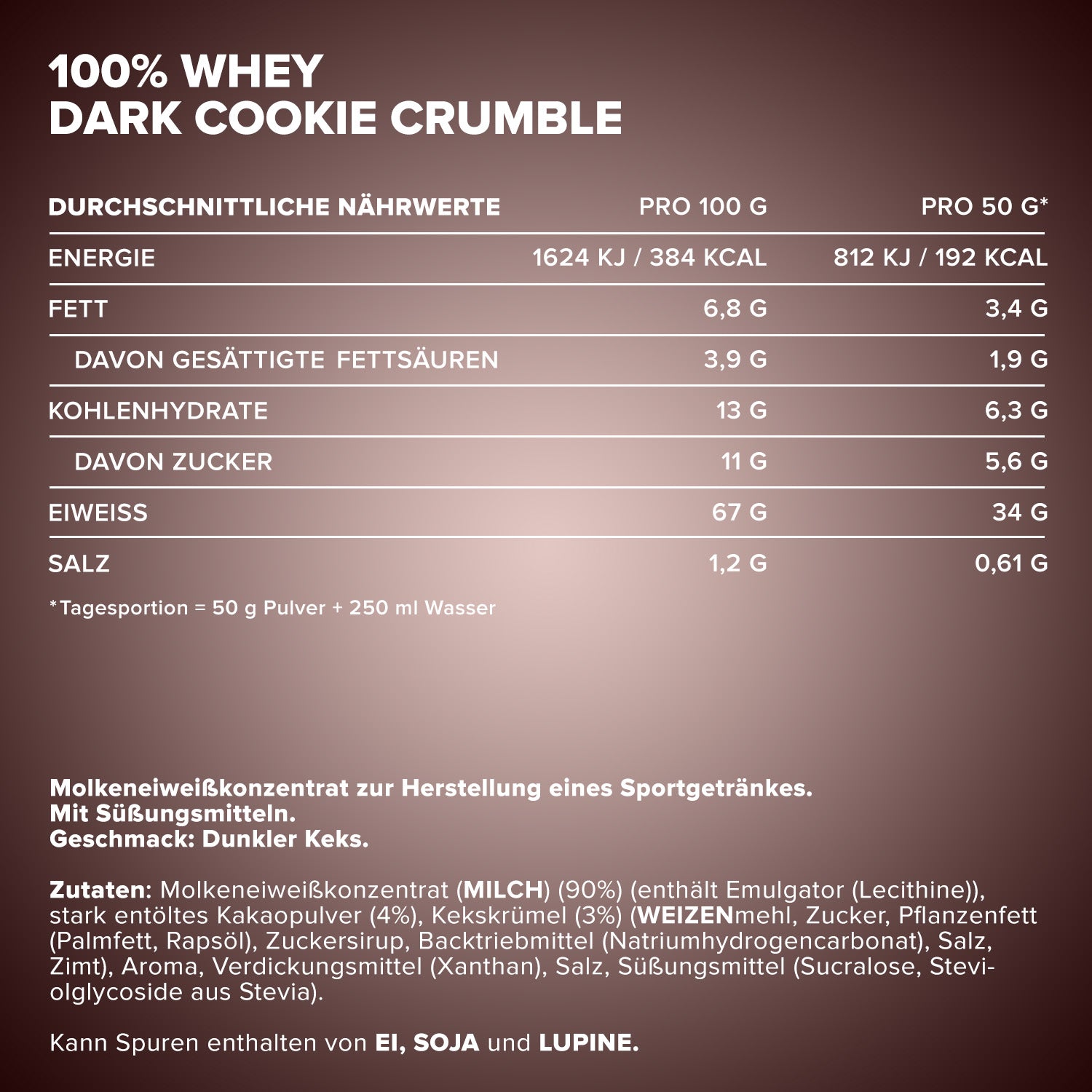 Whey protein concentrate (MILK) (90%) (contains emulsifier (lecithins)), low-fat cocoa powder (4%), cookie crumble (3%) (WHEAT flour, sugar, vegetable fat (palm fat, rapeseed oil), sugar syrup, raising agent (sodium bicarbonate), salt, cinnamon), flavoring, thickener (xanthan), salt, sweeteners (sucralose, steviol glycosides from stevia).
