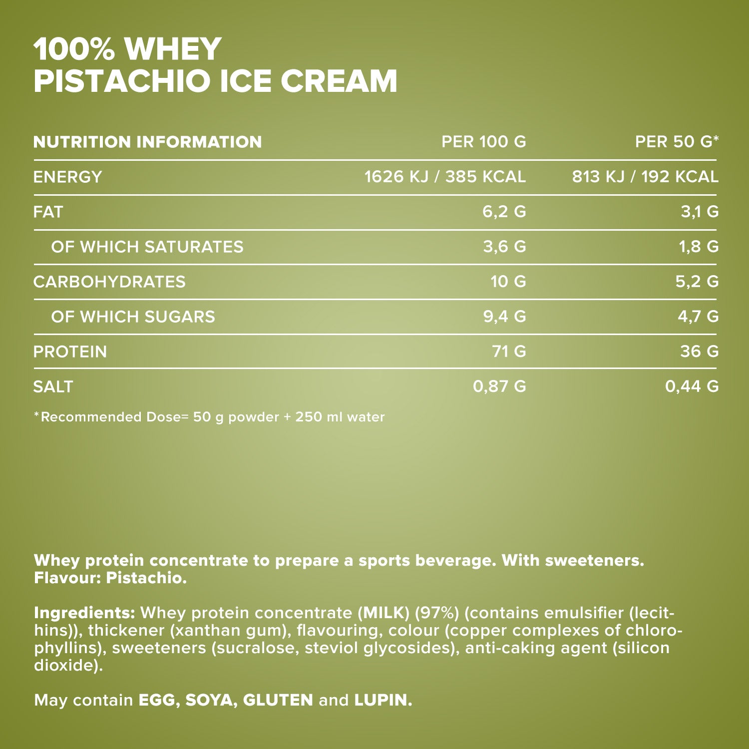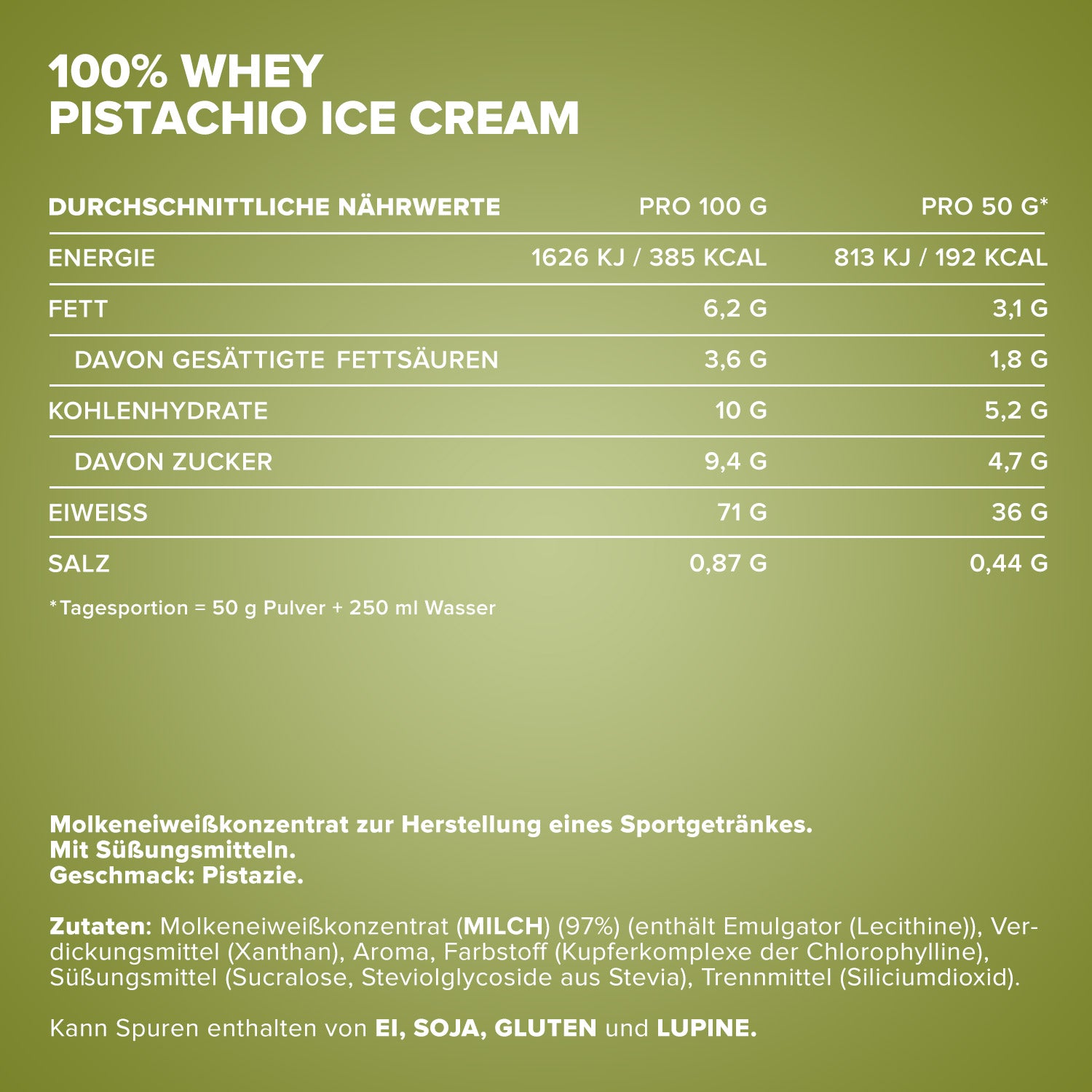 Molkeneiweißkonzentrat (MILCH) (97%) (enthält Emulgator (Lecithine)), Verdickungsmittel (Xanthan), Aroma, Farbstoff (Kupferkomplexe der Chlorophylle und Chlorophylline), Süßungsmittel (Sucralose, Steviolglycoside aus Stevia), Trennmittel (Siliciumdioxid).