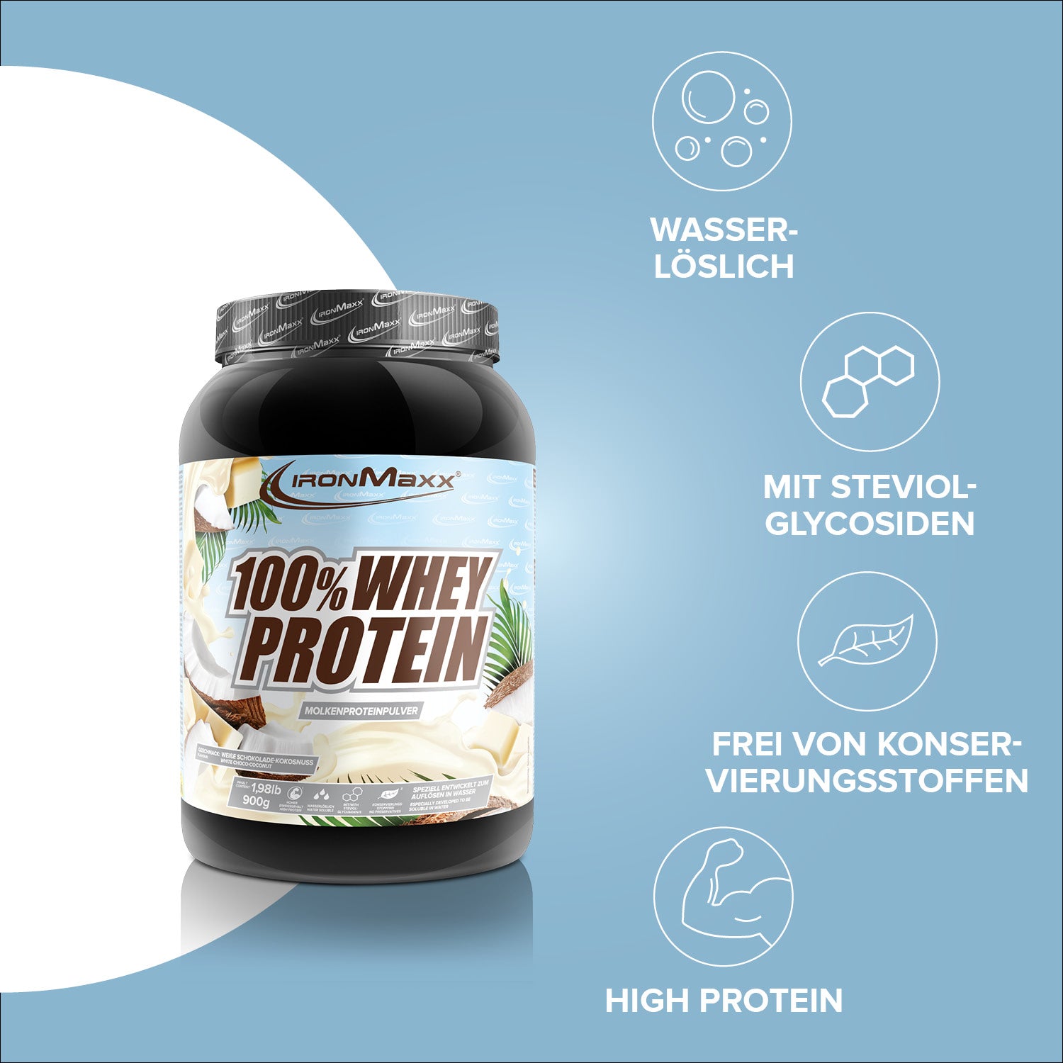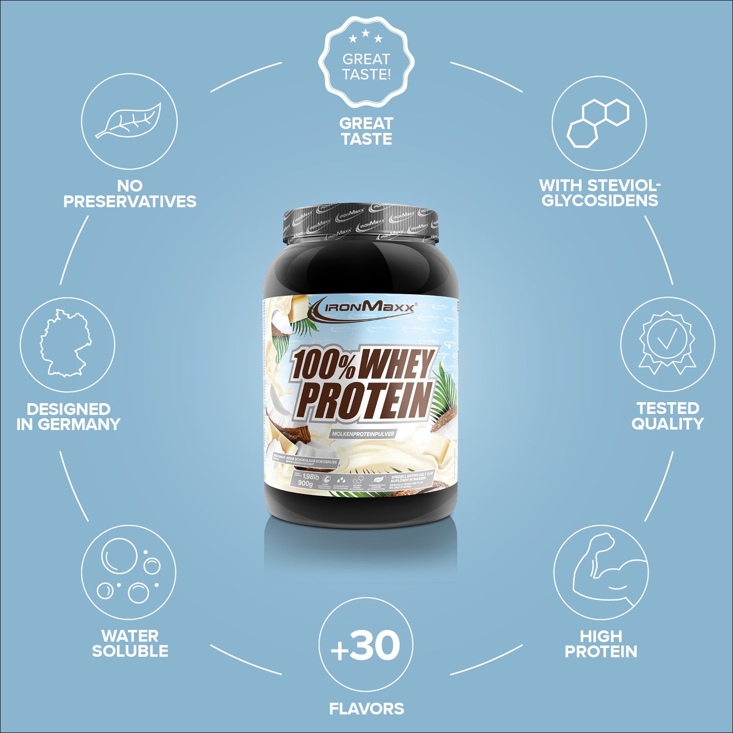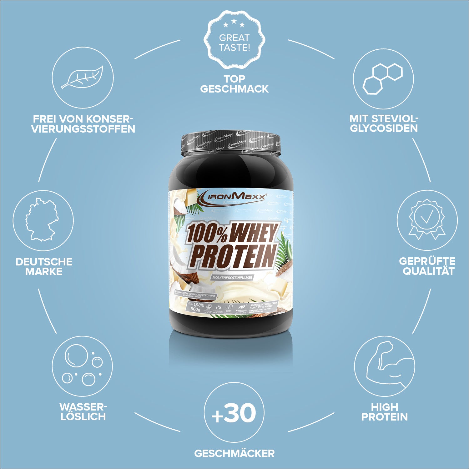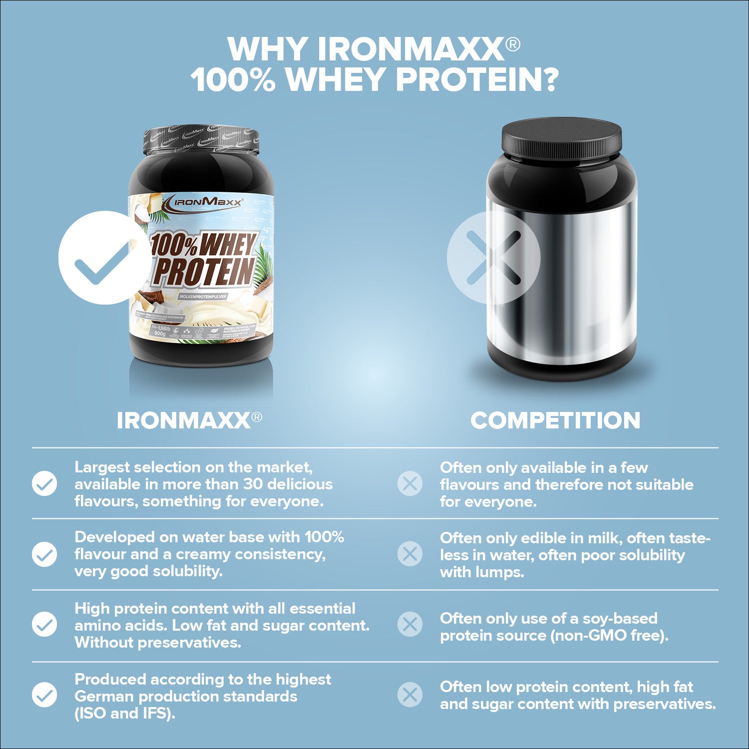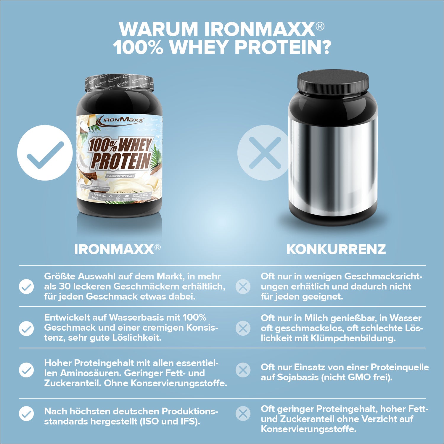 IronMaxx® 100% Whey Protein is one of the most popular protein shakes for muscle growth, recovery and cutting phases. With up to 80% protein, a complete amino acid profile (including BCAAs & EAAs) and a creamy, delicious taste, it is the perfect partner for your fitness routine.