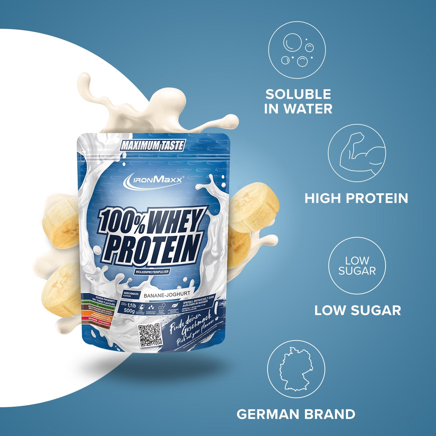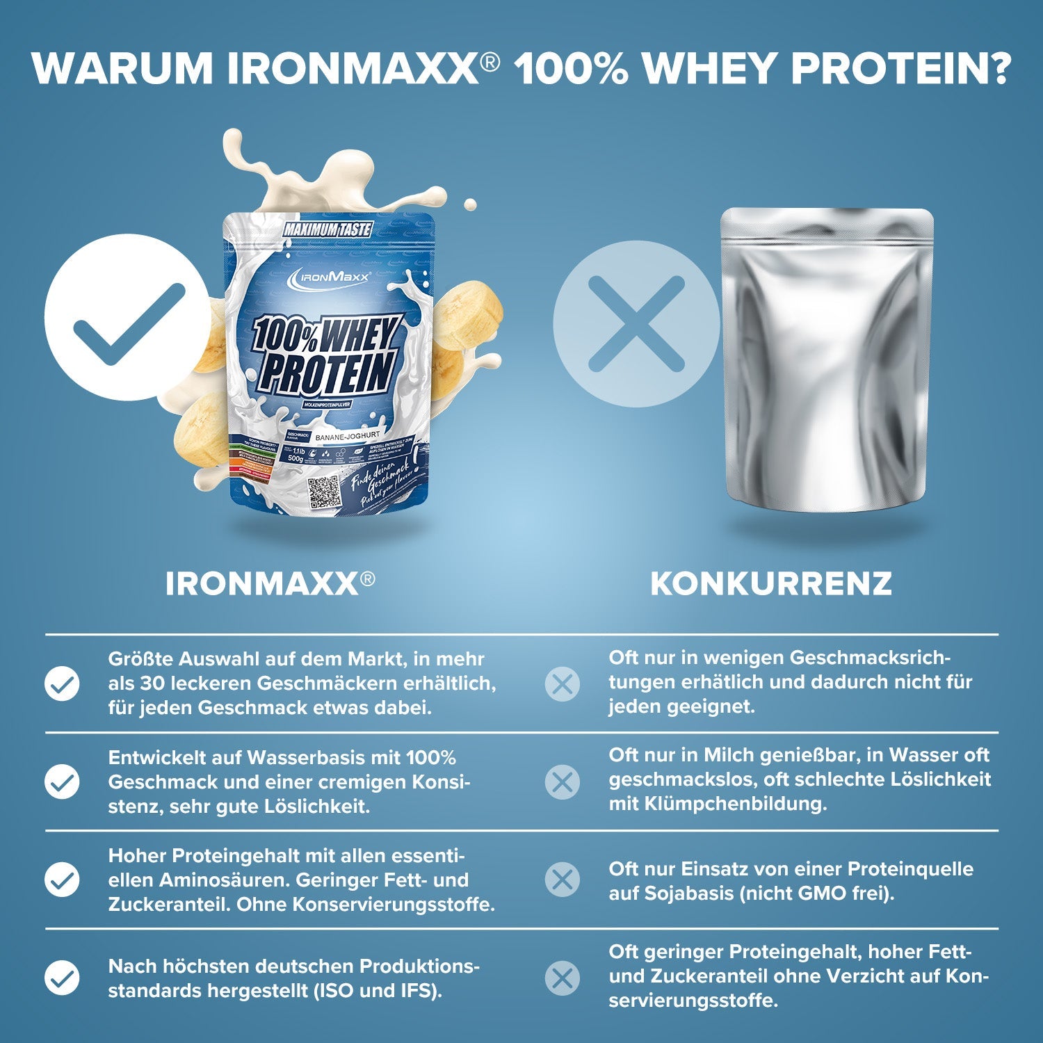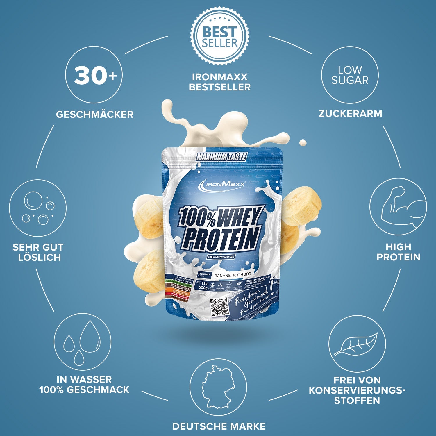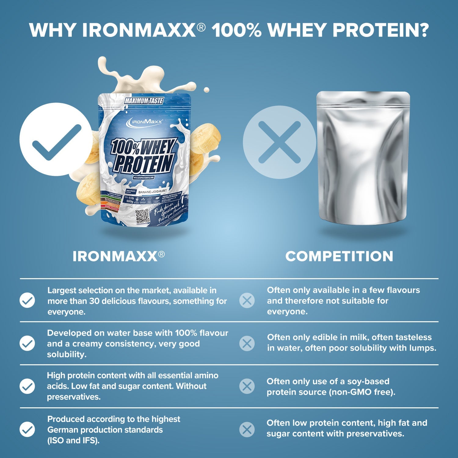 IronMaxx® 100% Whey Protein is one of the most popular protein shakes for muscle growth, recovery and cutting phases. With up to 80% protein, a complete amino acid profile (including BCAAs and EAAs) and a creamy, delicious taste, it is the perfect companion for your fitness lifestyle.