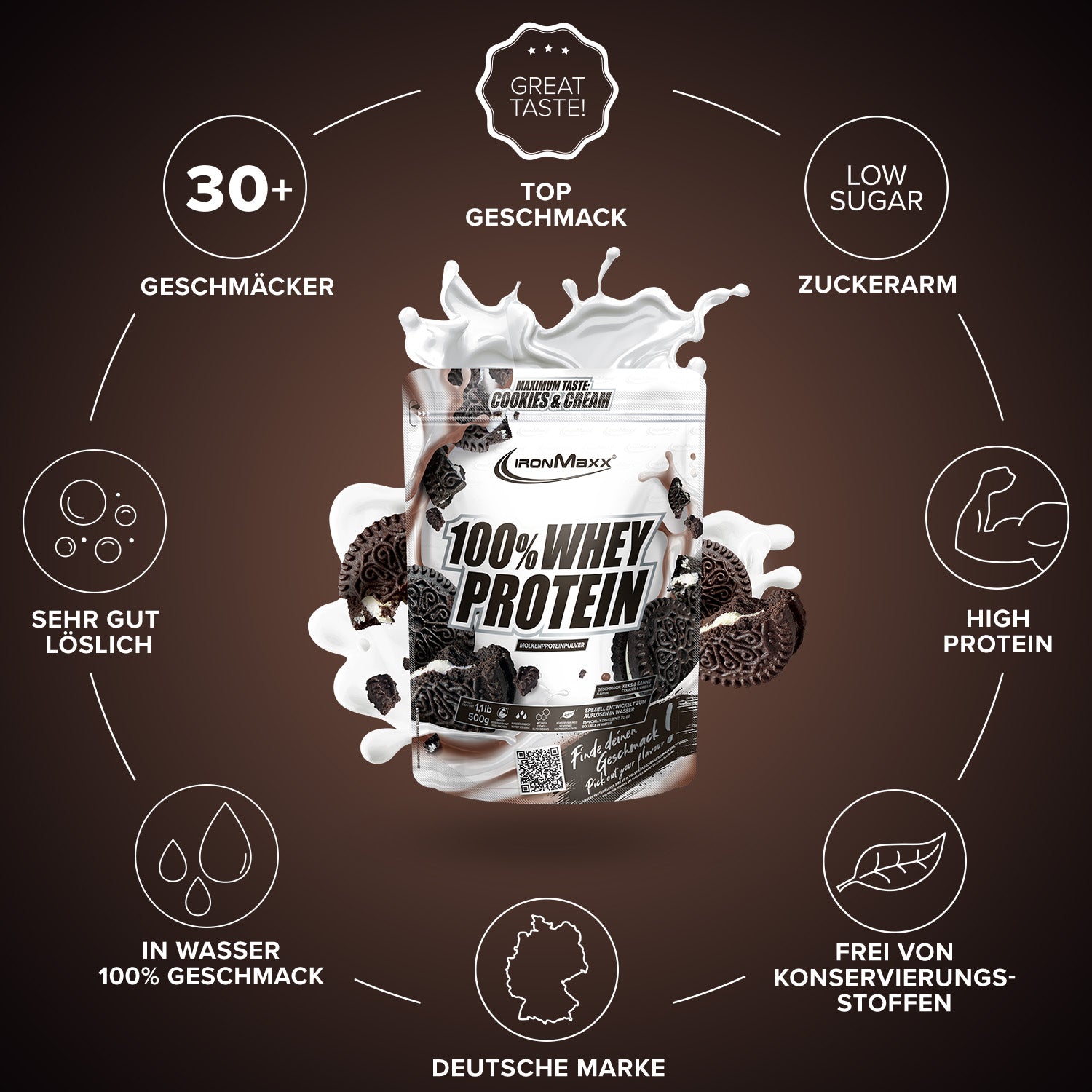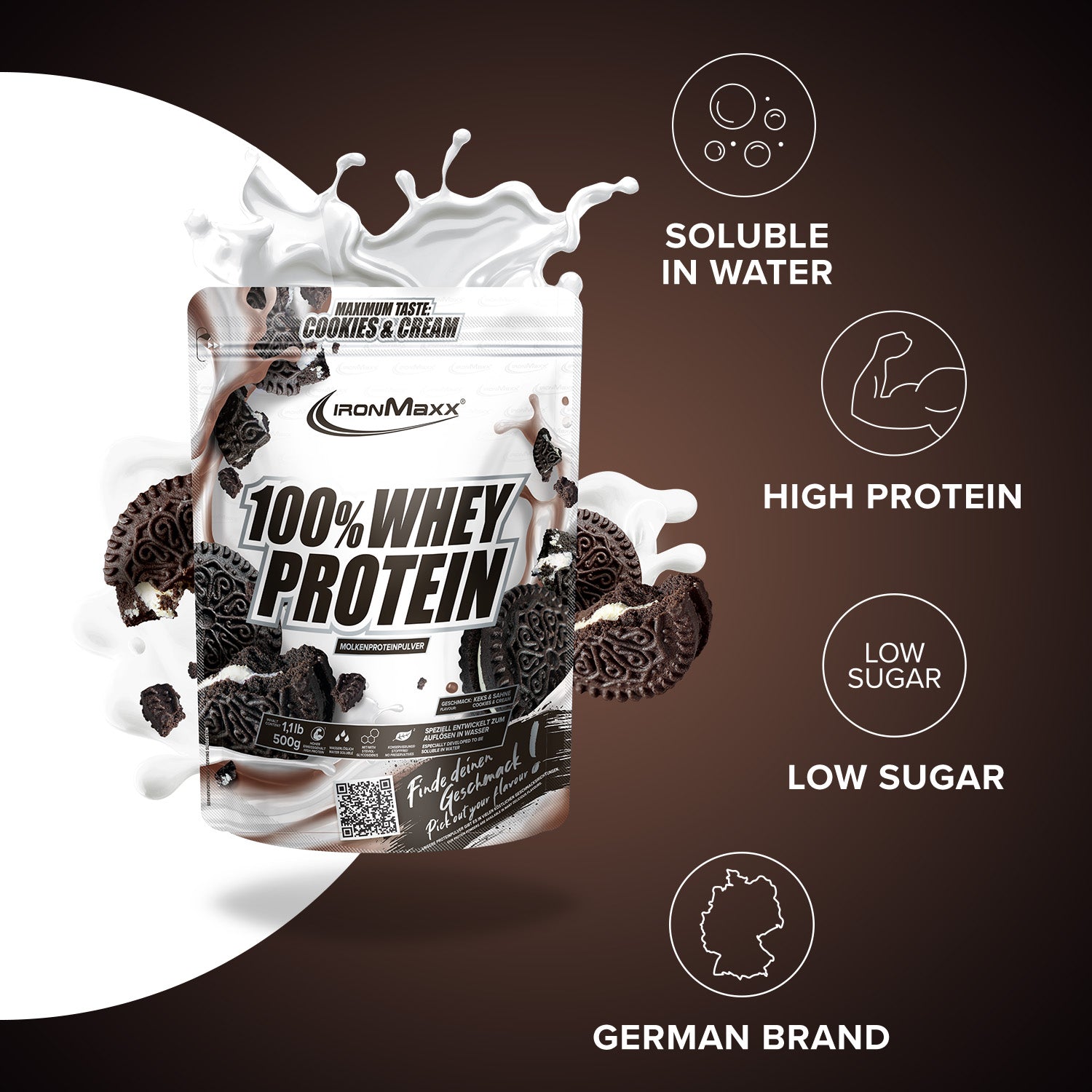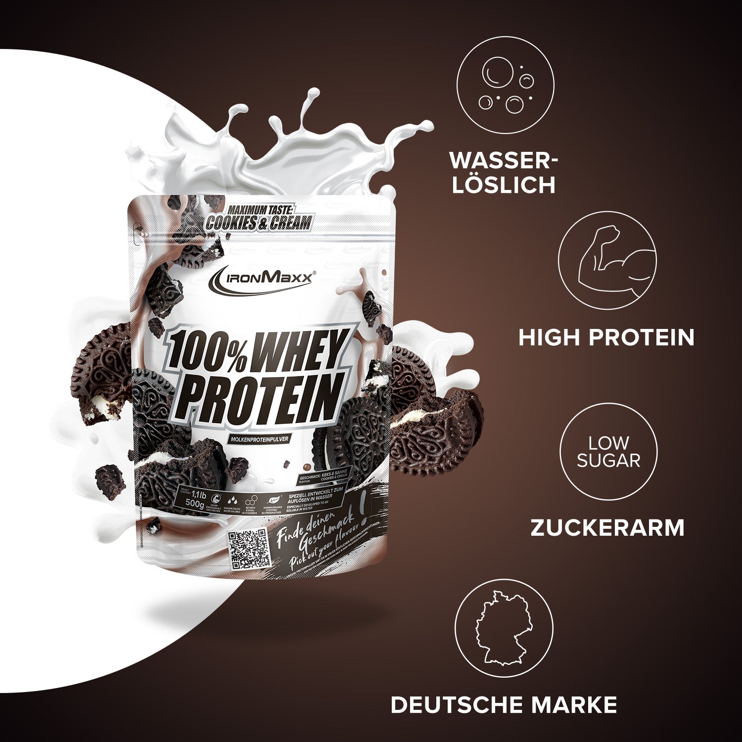 IronMaxx® 100% Whey Protein is one of the most popular protein shakes for muscle growth, recovery and cutting phases. With up to 80% protein, a complete amino acid profile (including BCAAs and EAAs) and a creamy, delicious taste, it is the perfect companion for your fitness lifestyle.