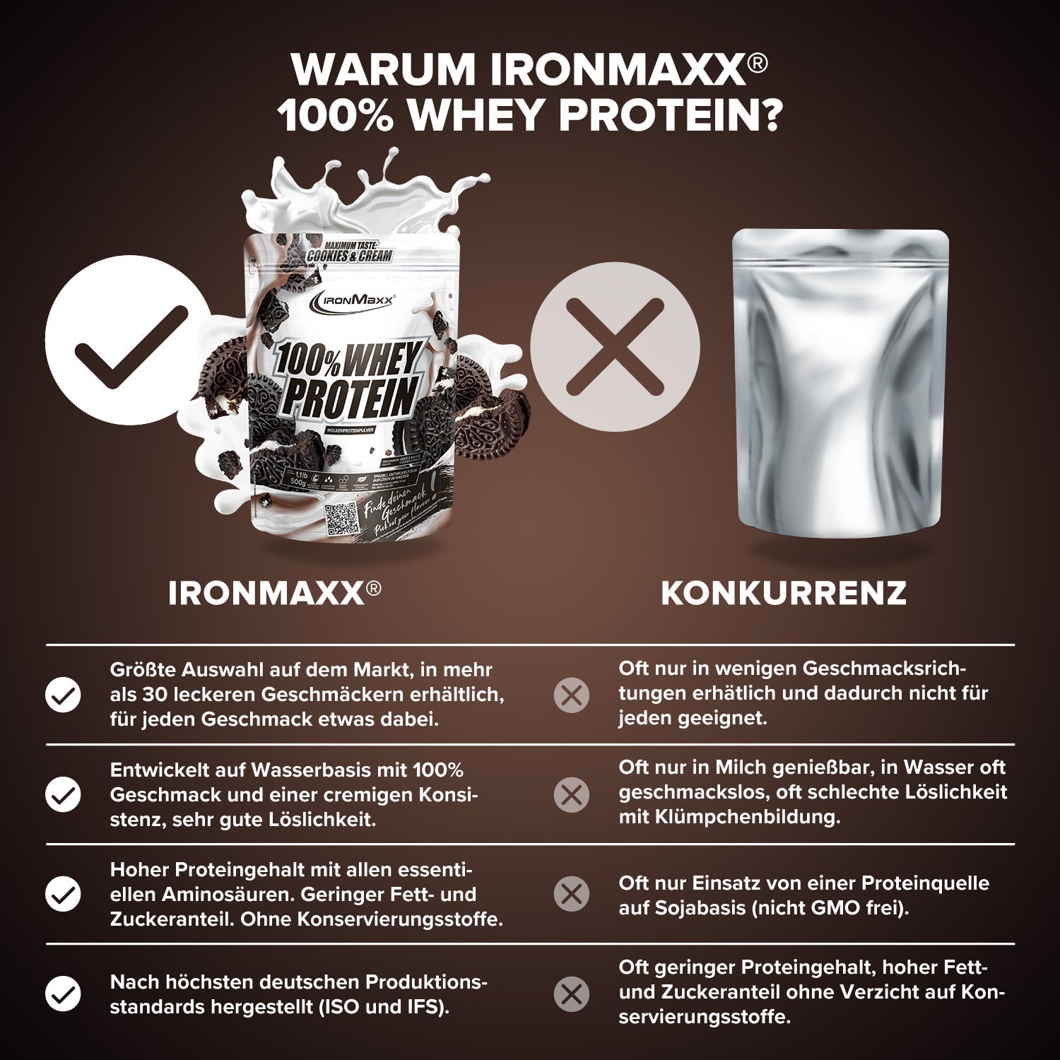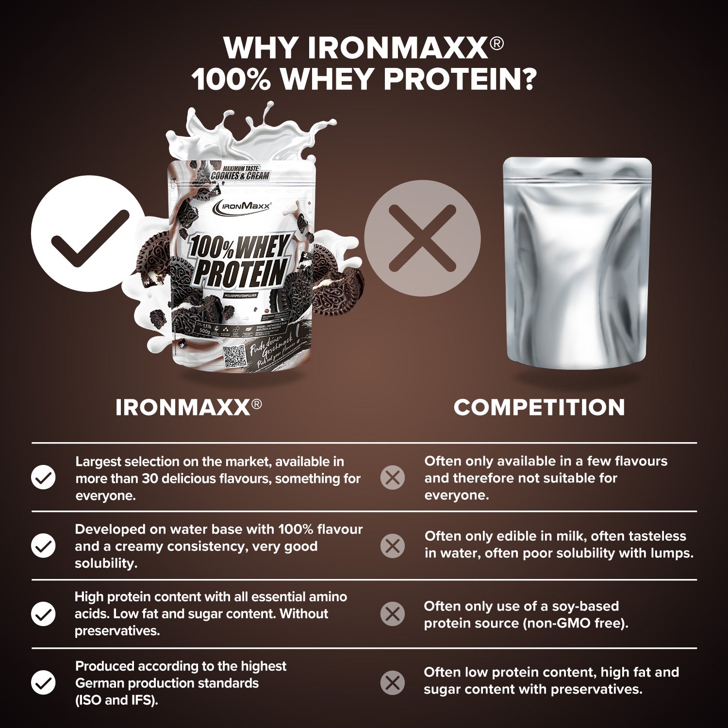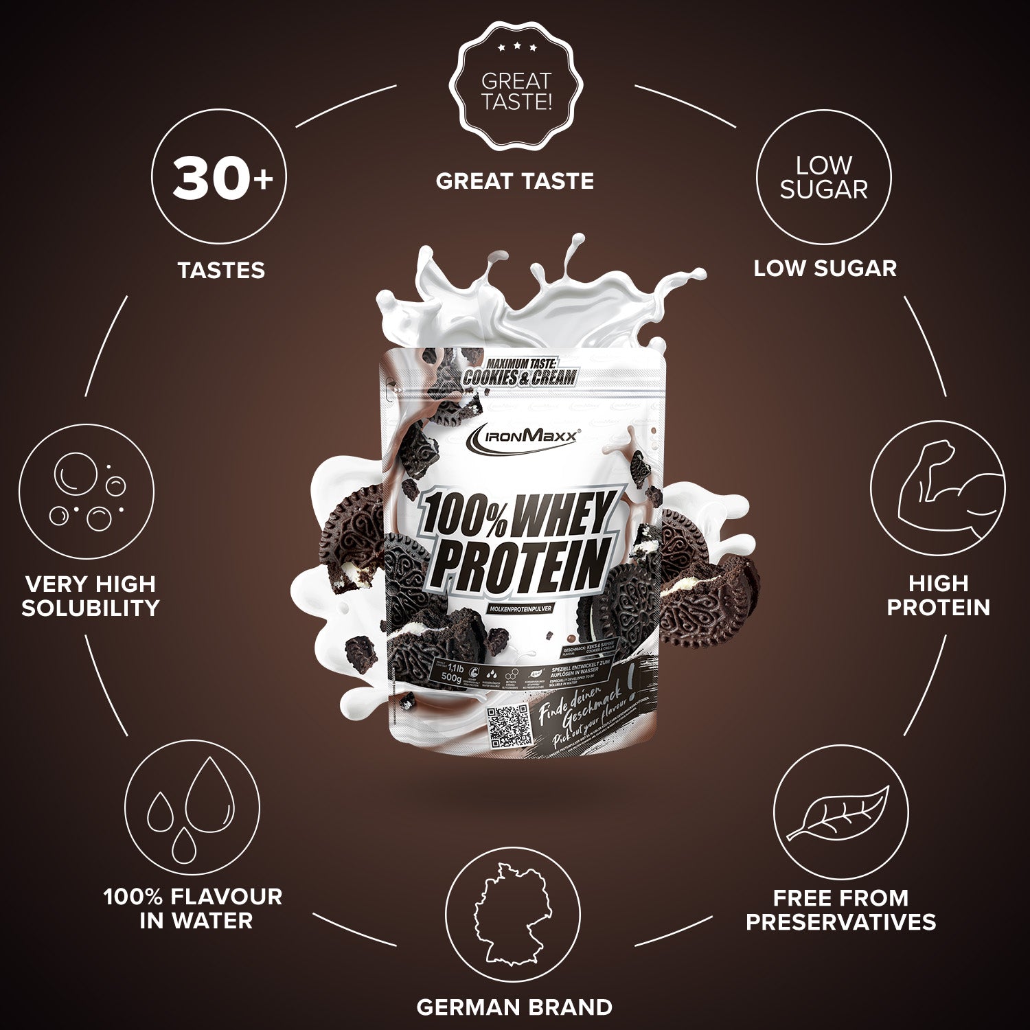 IronMaxx® 100% Whey Protein is one of the most popular protein shakes for muscle growth, recovery and cutting phases. With up to 80% protein, a complete amino acid profile (including BCAAs and EAAs) and a creamy, delicious taste, it is the perfect companion for your fitness lifestyle.