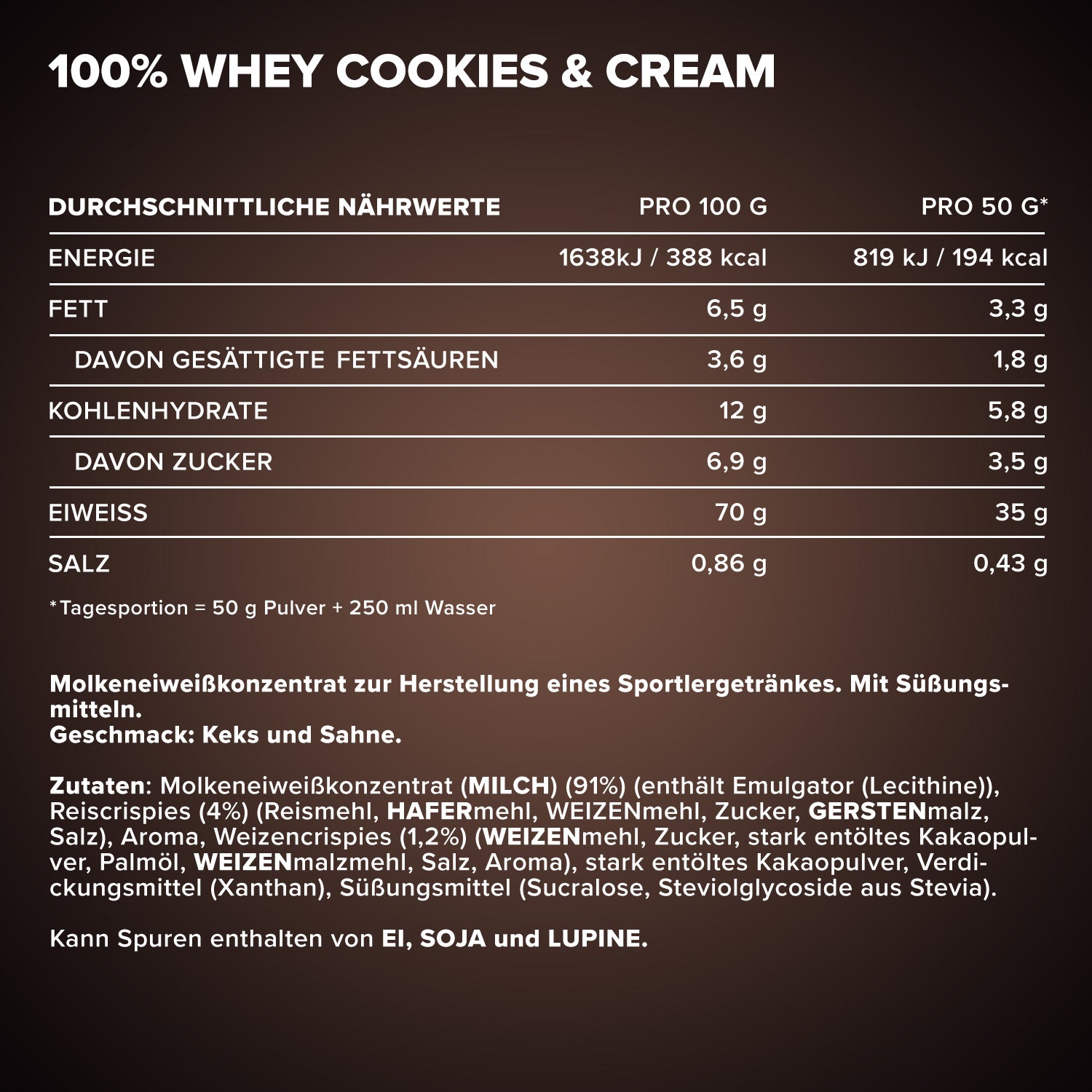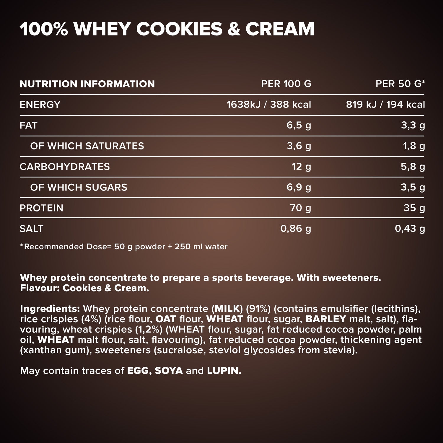 ²One serving contains 30 g of powder and 200 ml of water or milk.³In our Designer Whey, we do not use added sugar, but rely on safe