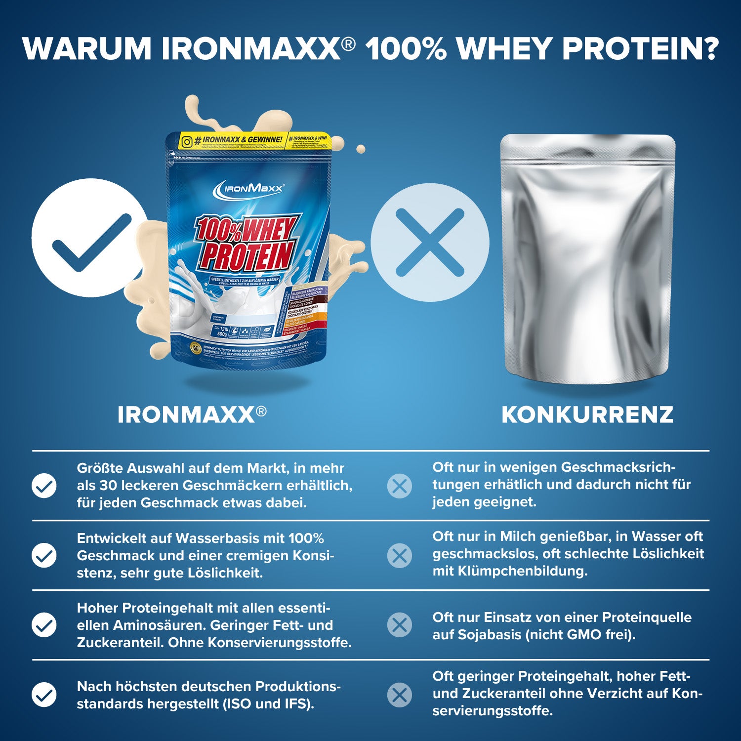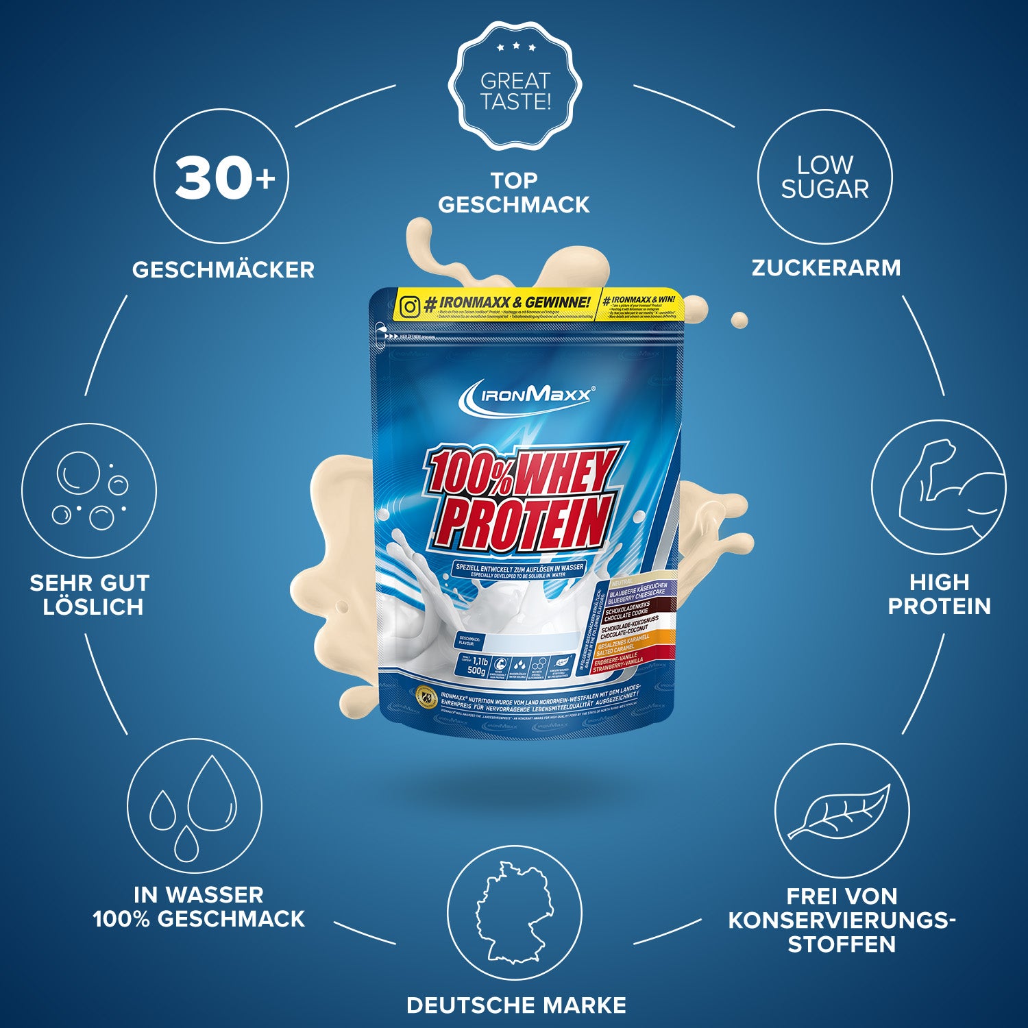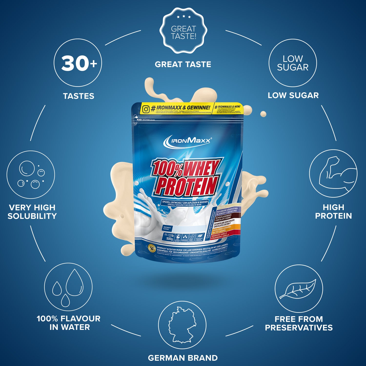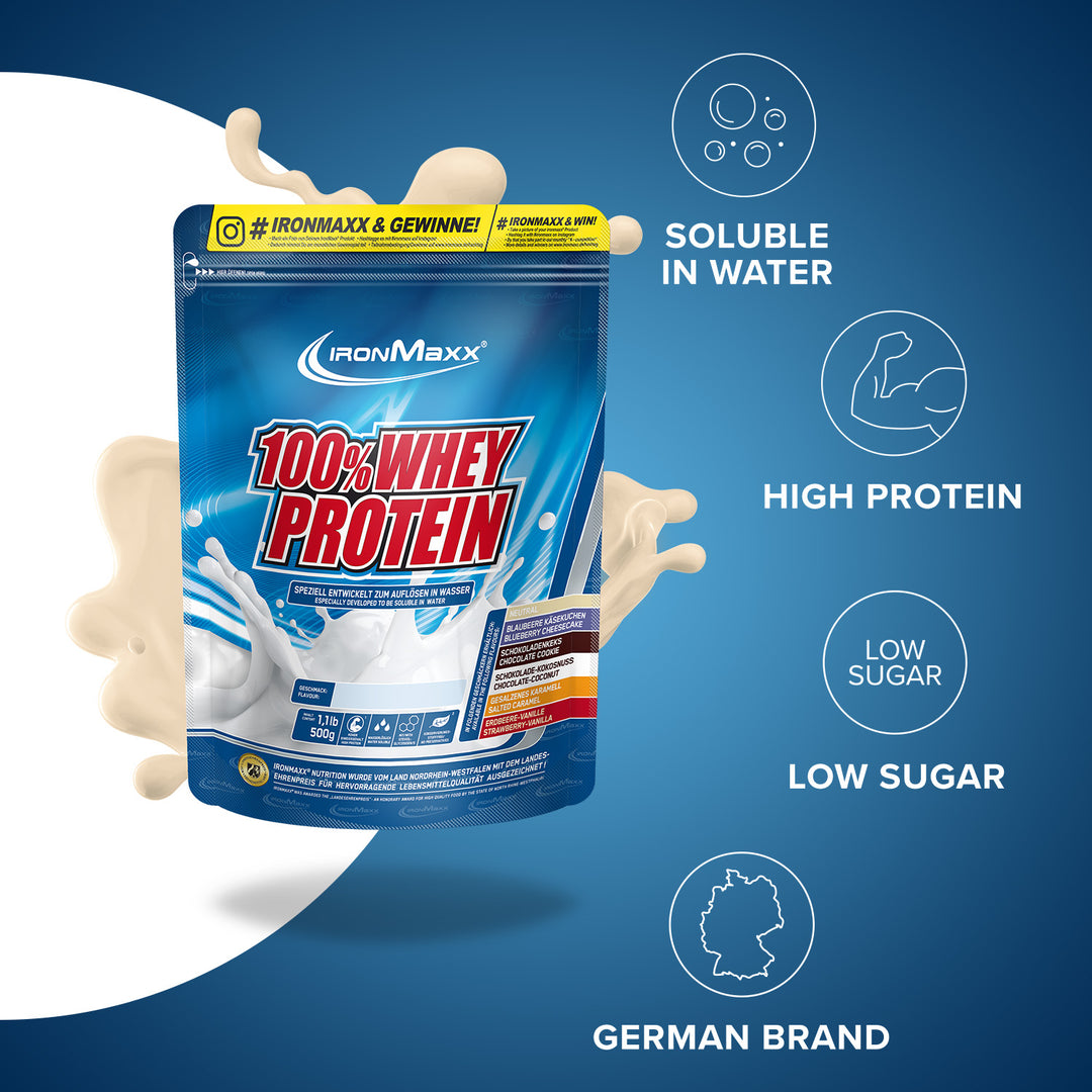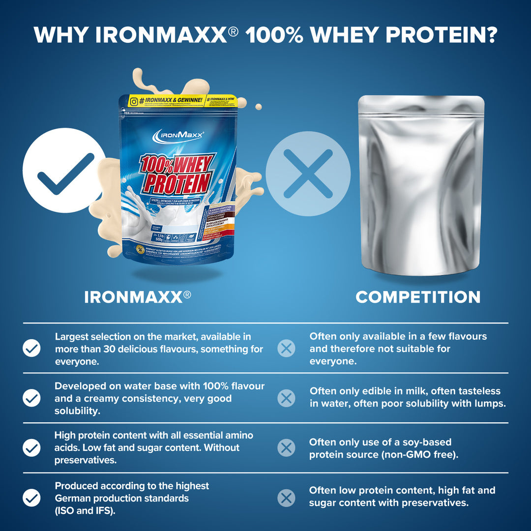 IronMaxx® 100% Whey Protein is one of the most popular protein shakes for muscle growth, recovery and cutting phases. With up to 80% protein, a complete amino acid profile (including BCAAs and EAAs) and a creamy, delicious taste, it is the perfect companion for your fitness lifestyle.
