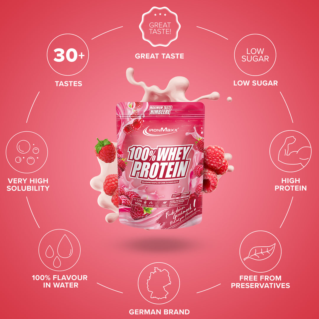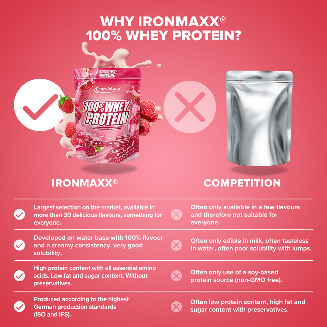 IronMaxx® 100% Whey Protein is one of the most popular protein shakes for muscle growth, recovery and cutting phases. With up to 80% protein, a complete amino acid profile (including BCAAs and EAAs) and a creamy, delicious taste, it is the perfect companion for your fitness lifestyle.