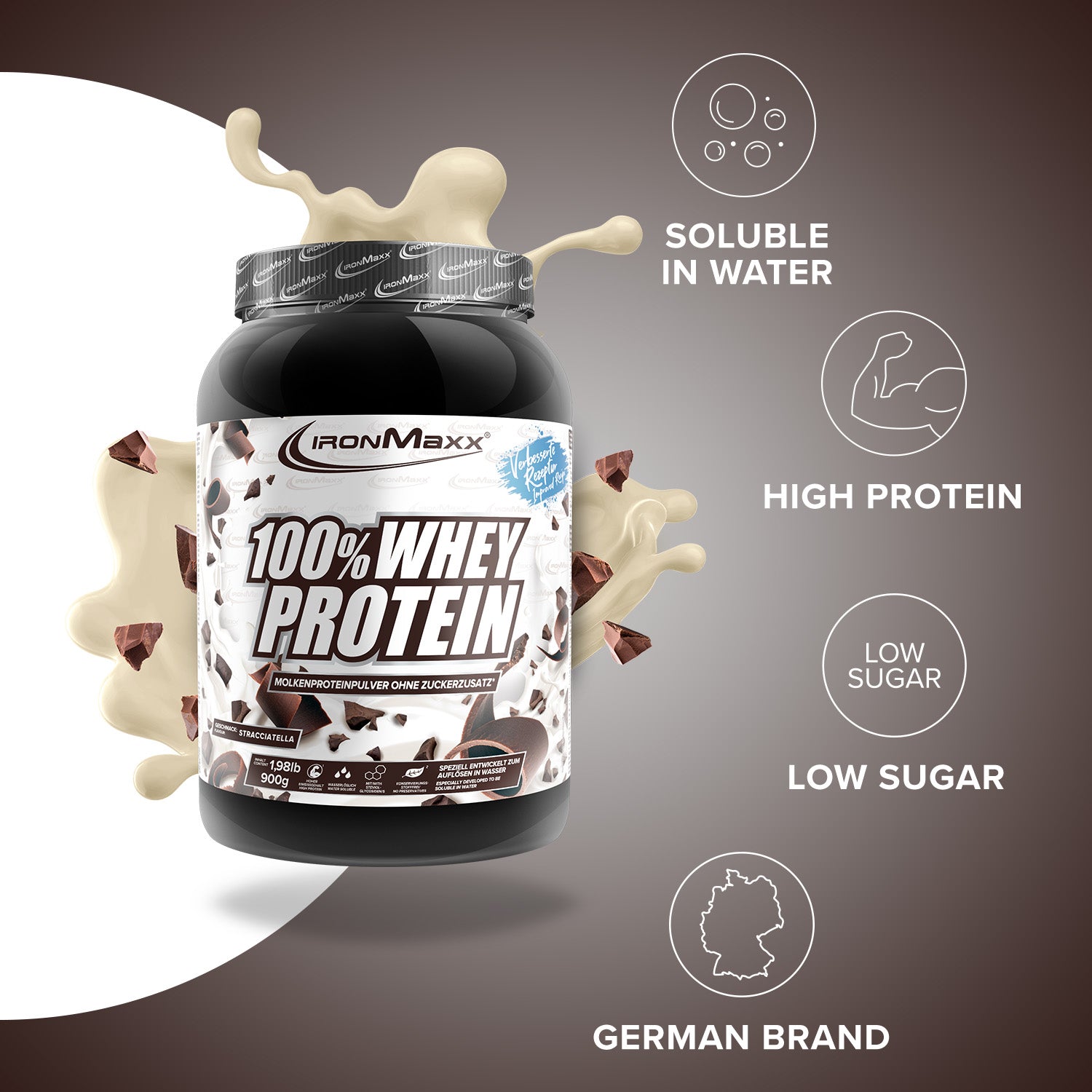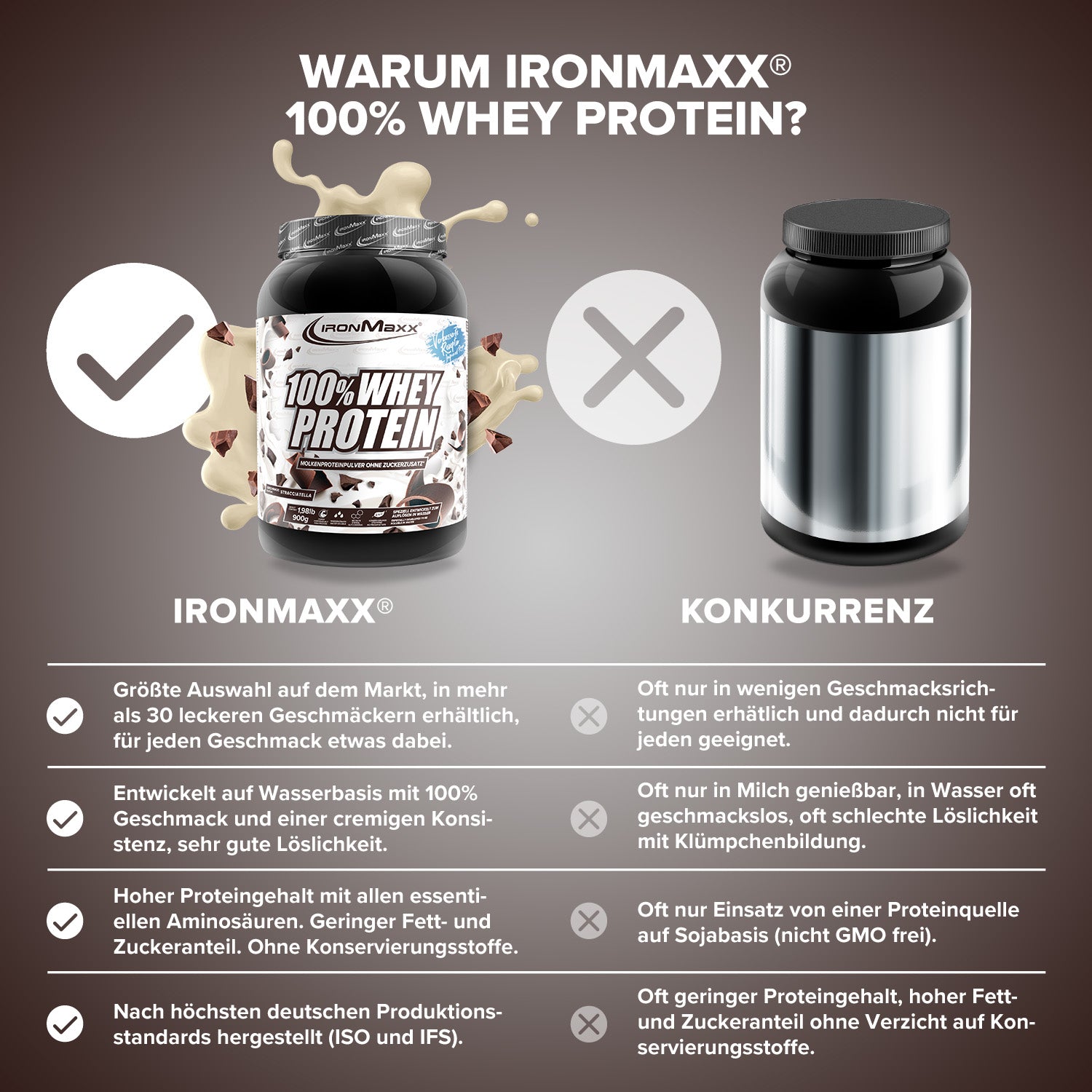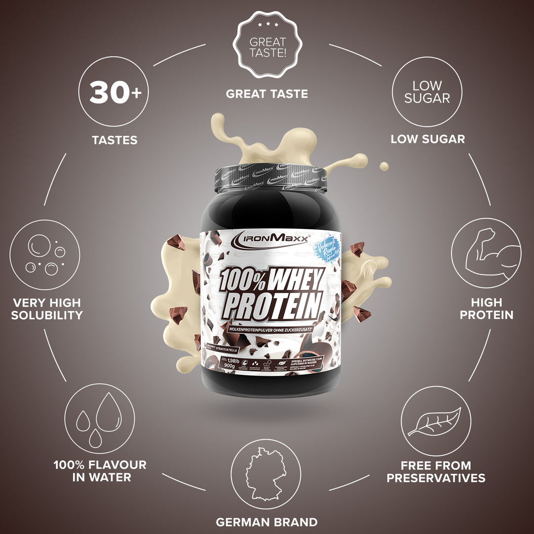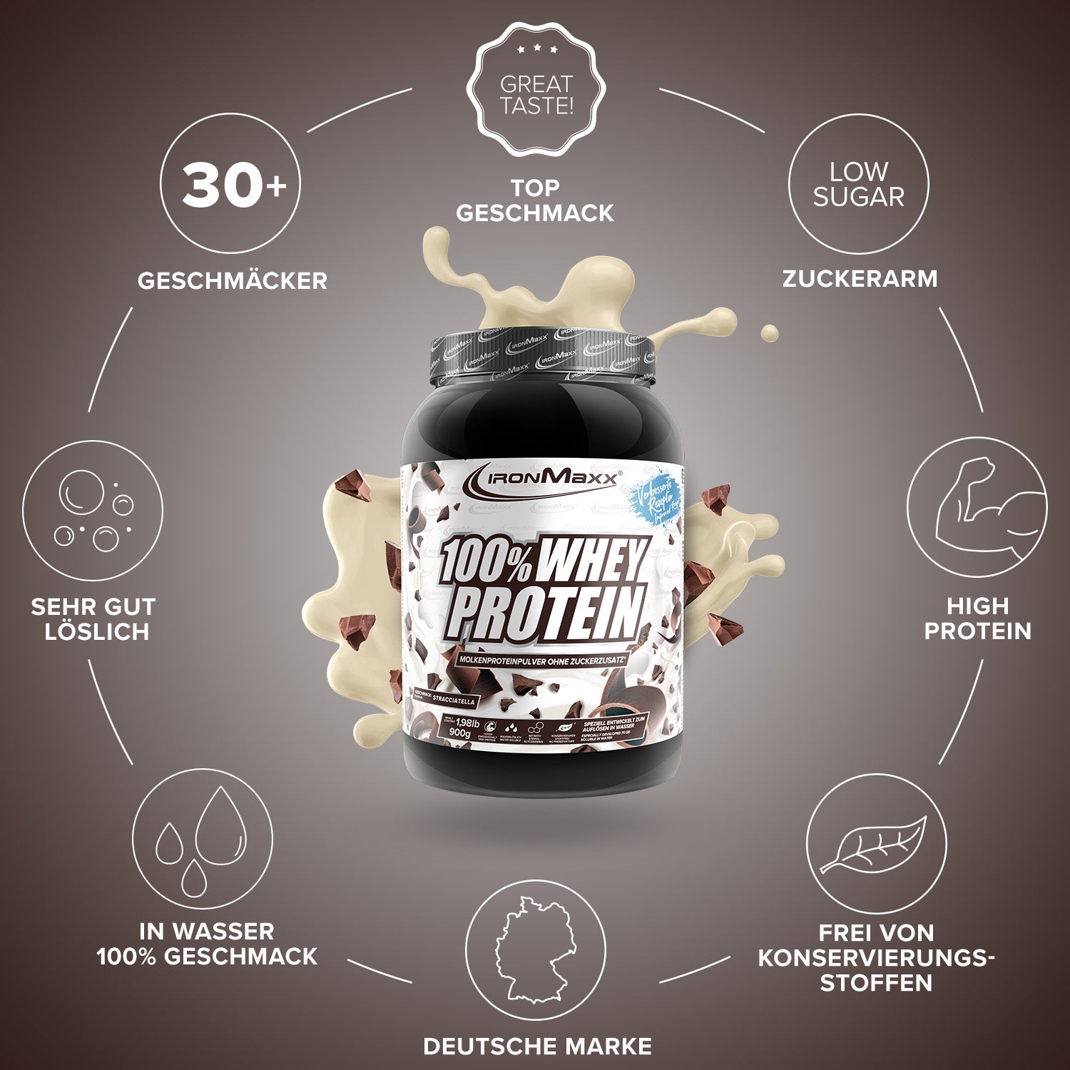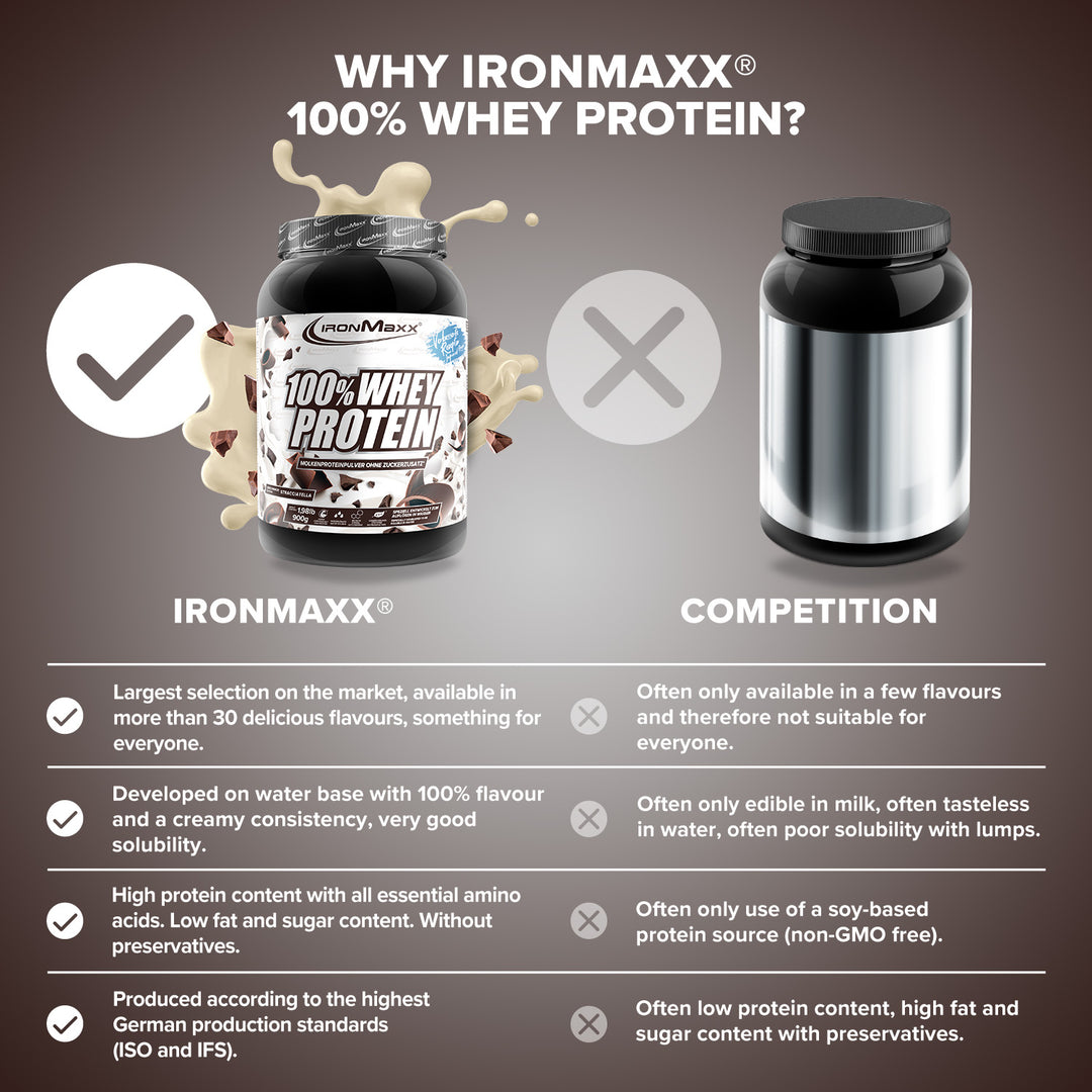 IronMaxx® 100% Whey Protein is one of the most popular protein shakes for muscle growth, recovery and cutting phases. With up to 80% protein, a complete amino acid profile (including BCAAs & EAAs) and a creamy, delicious taste, it is the perfect partner for your fitness routine.