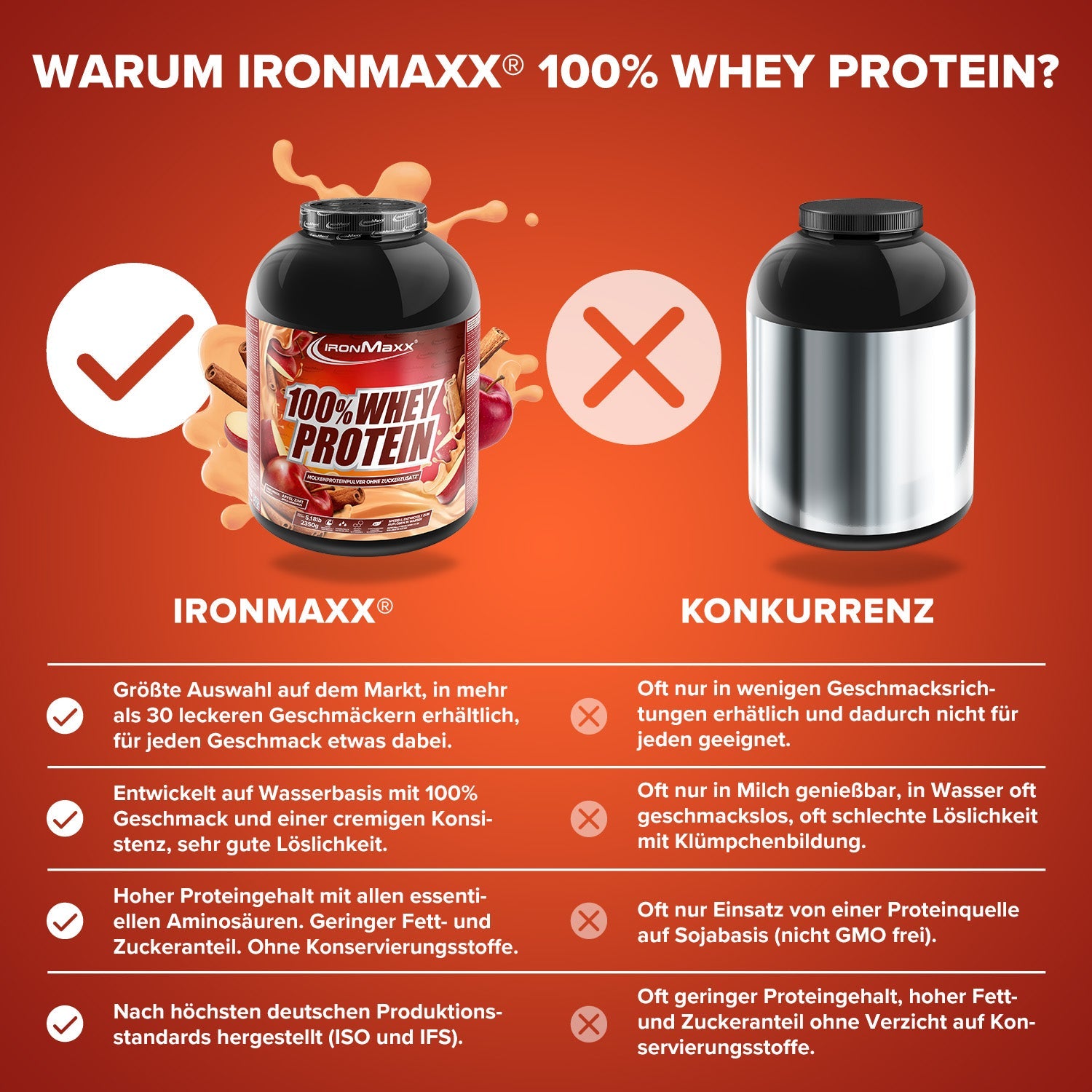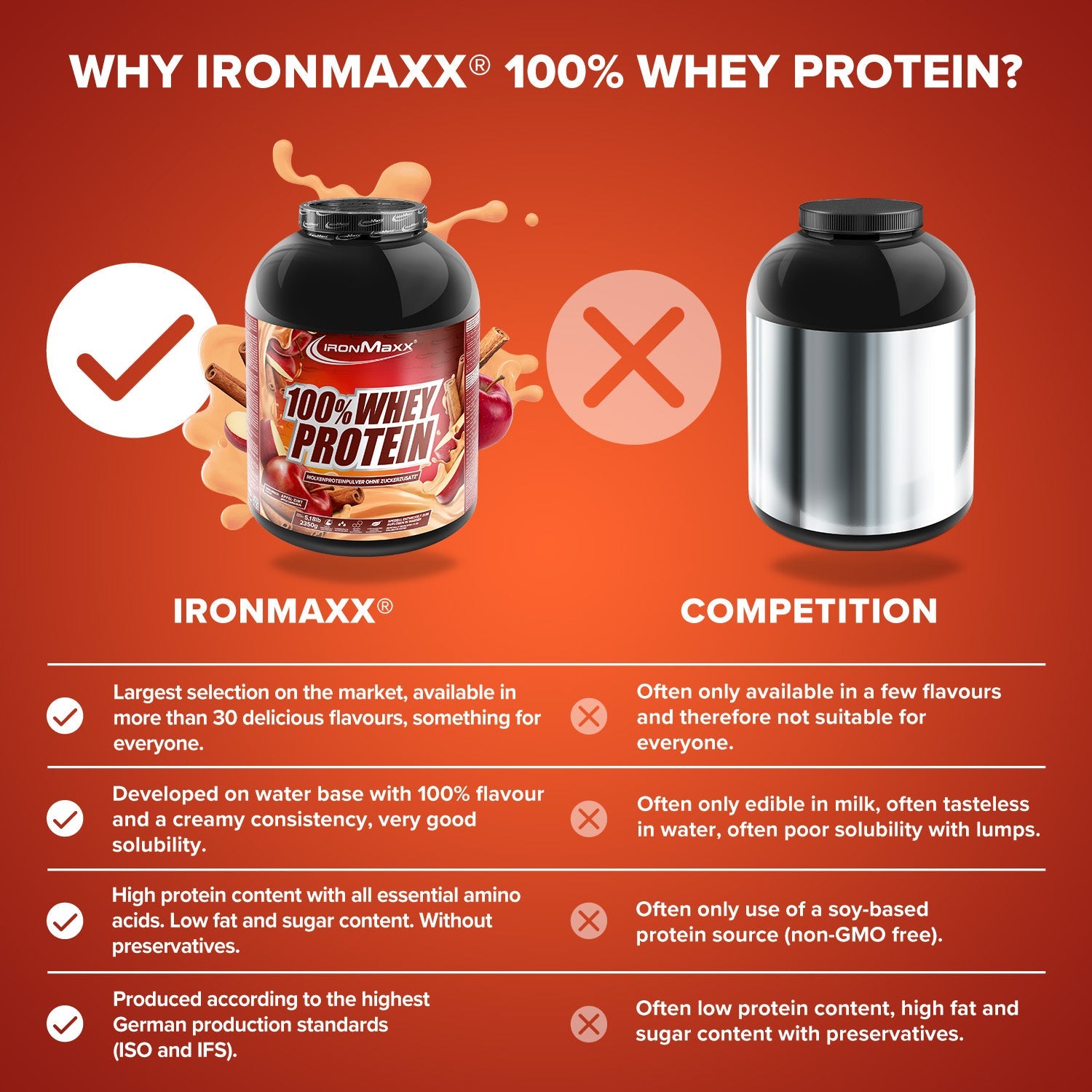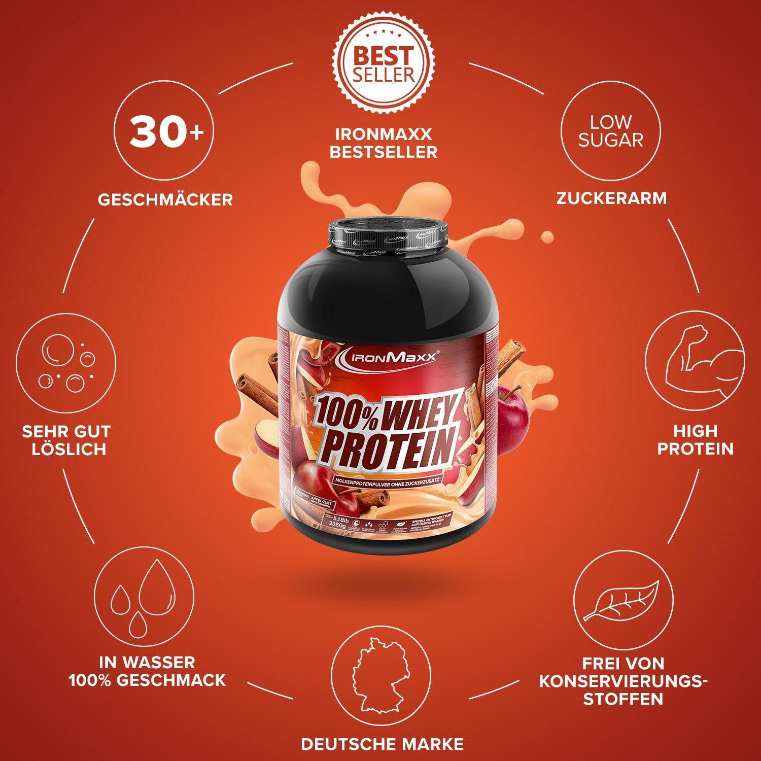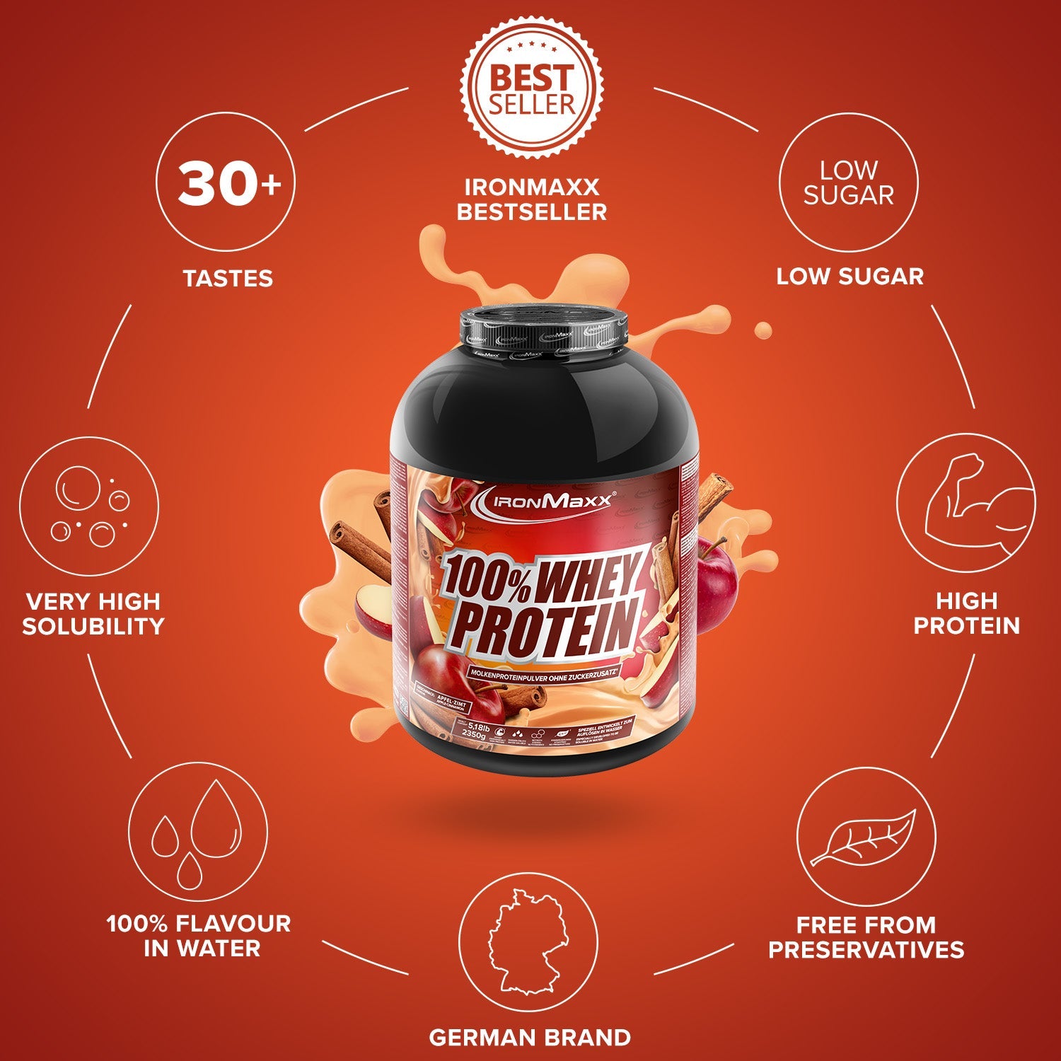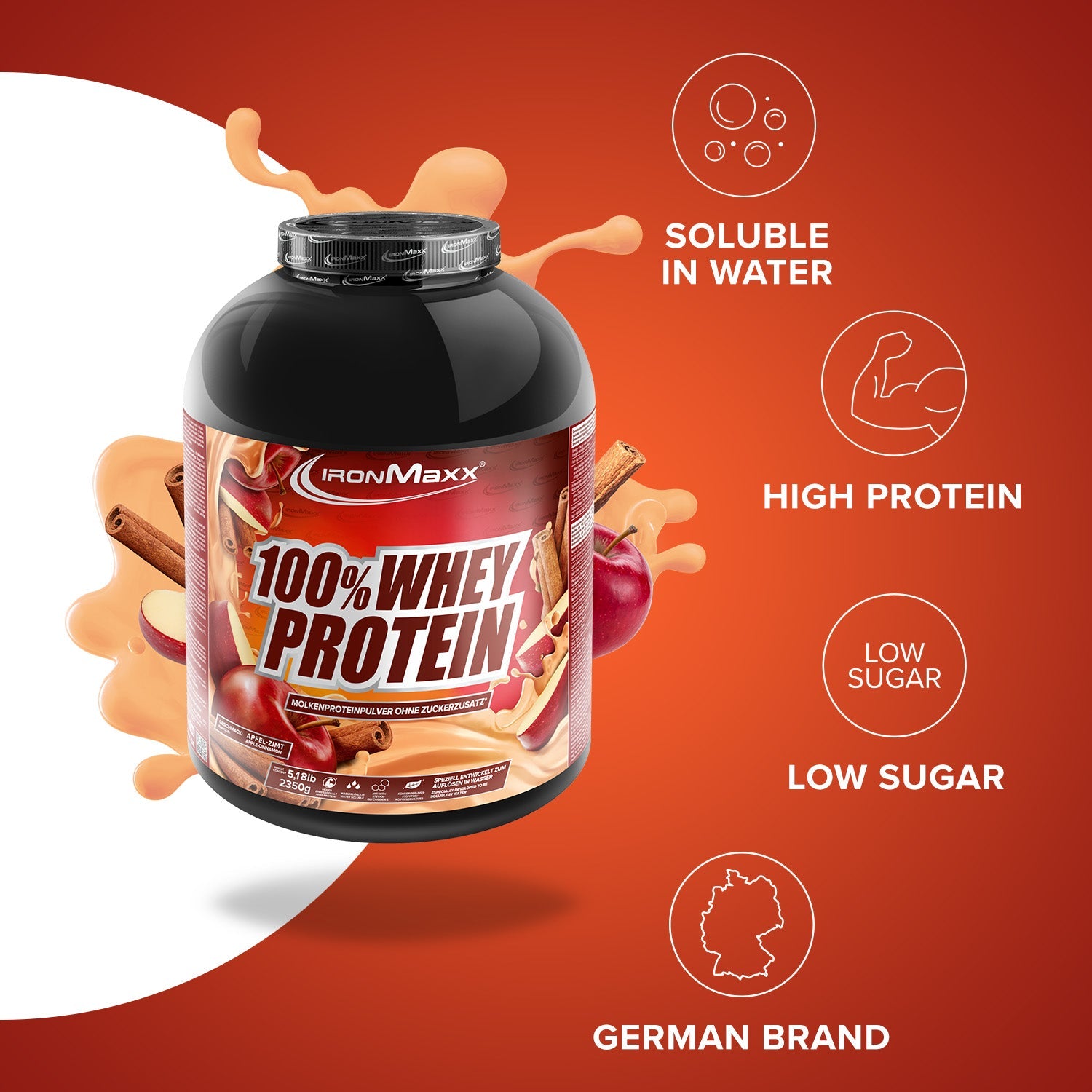 IronMaxx® 100% Whey Protein is one of the most popular protein shakes for muscle growth, recovery and cutting phases. With up to 80% protein, a complete amino acid profile (including BCAAs & EAAs) and a creamy, delicious taste, it is the perfect partner for your fitness routine.