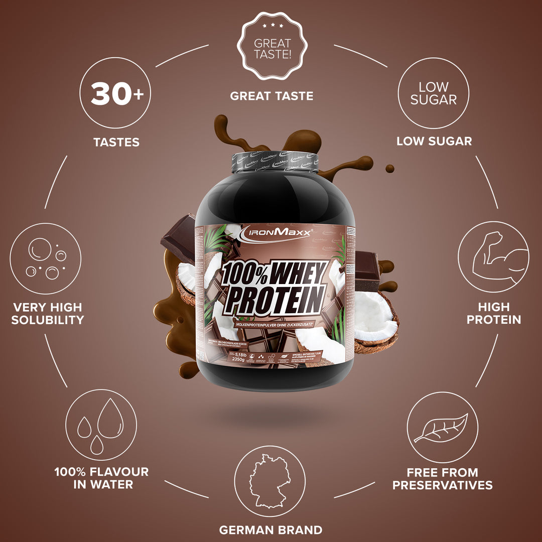 IronMaxx® 100% Whey Protein is one of the most popular protein shakes for muscle growth, recovery and cutting phases. With up to 80% protein, a complete amino acid profile (including BCAAs & EAAs) and a creamy, delicious taste, it is the perfect partner for your fitness routine.