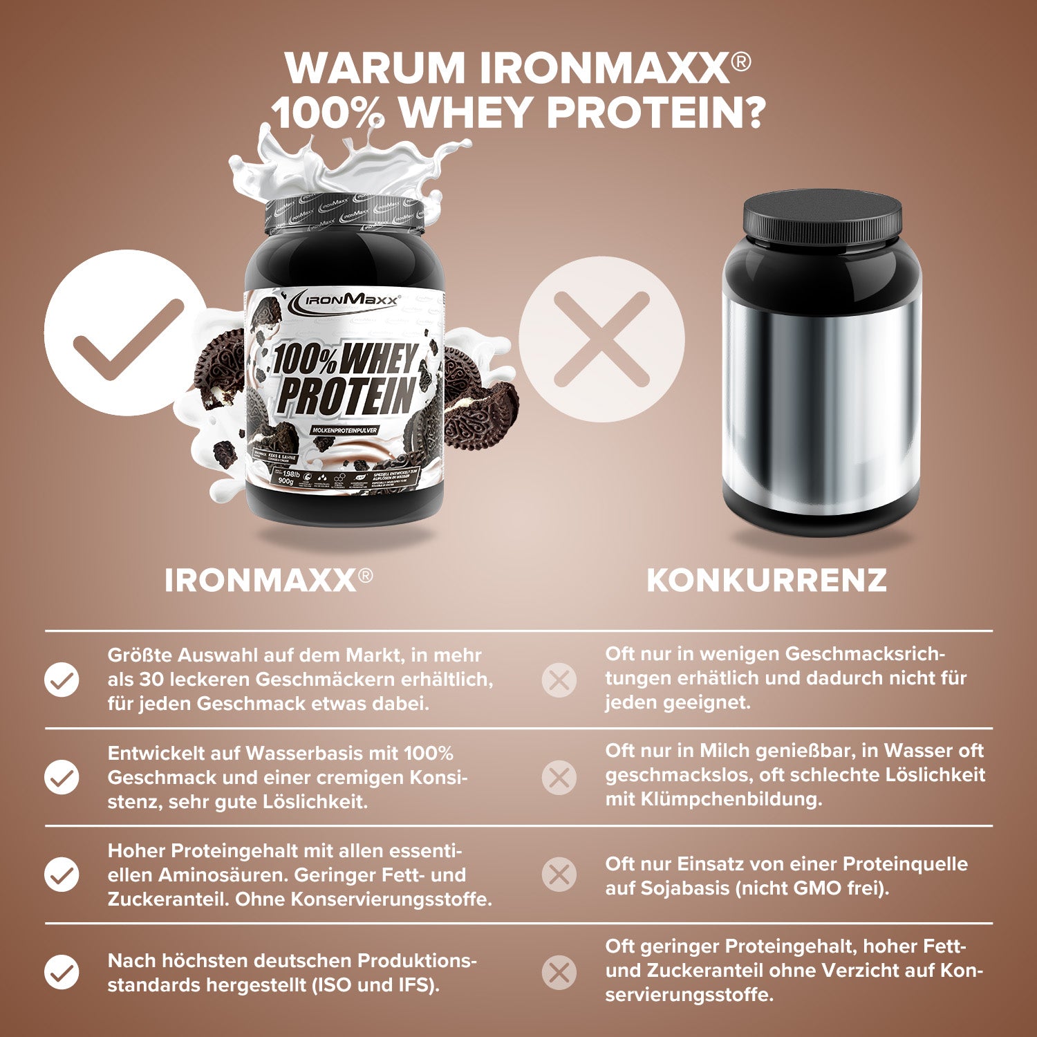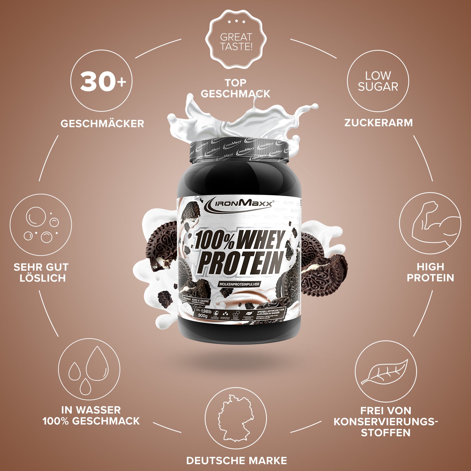 IronMaxx® 100% Whey Protein is one of the most popular protein shakes for muscle growth, recovery and cutting phases. With up to 80% protein, a complete amino acid profile (including BCAAs & EAAs) and a creamy, delicious taste, it is the perfect partner for your fitness routine.