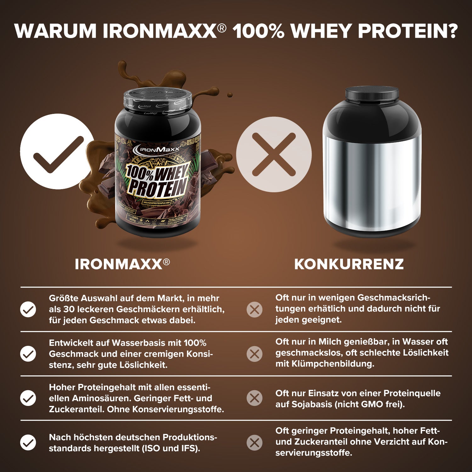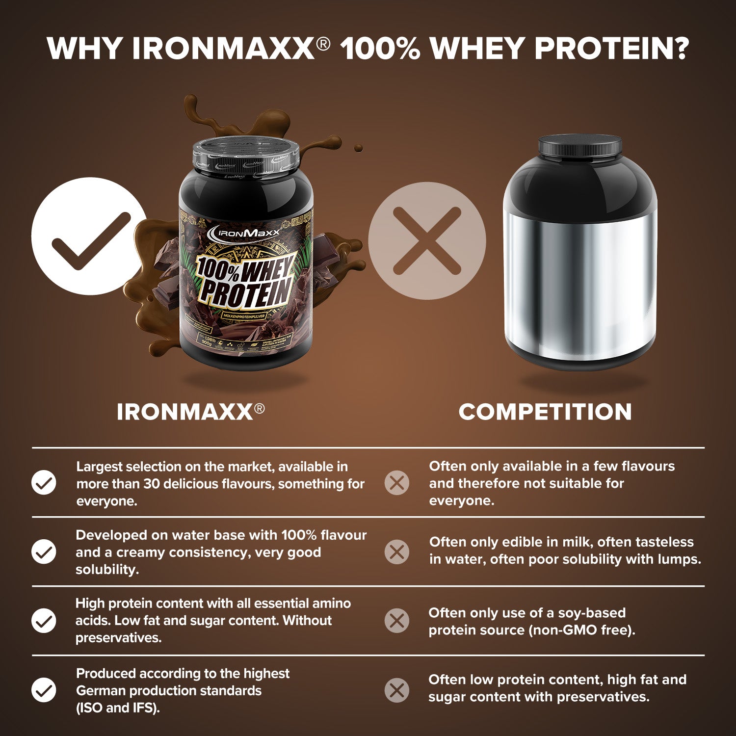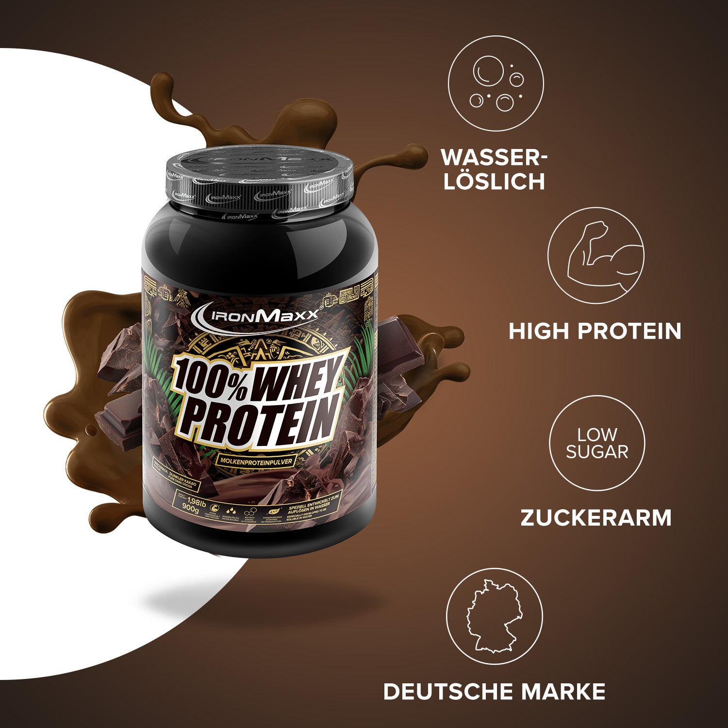 IronMaxx® 100% Whey Protein is one of the most popular protein shakes for muscle growth, recovery and cutting phases. With up to 80% protein, a complete amino acid profile (including BCAAs & EAAs) and a creamy, delicious taste, it is the perfect partner for your fitness routine.