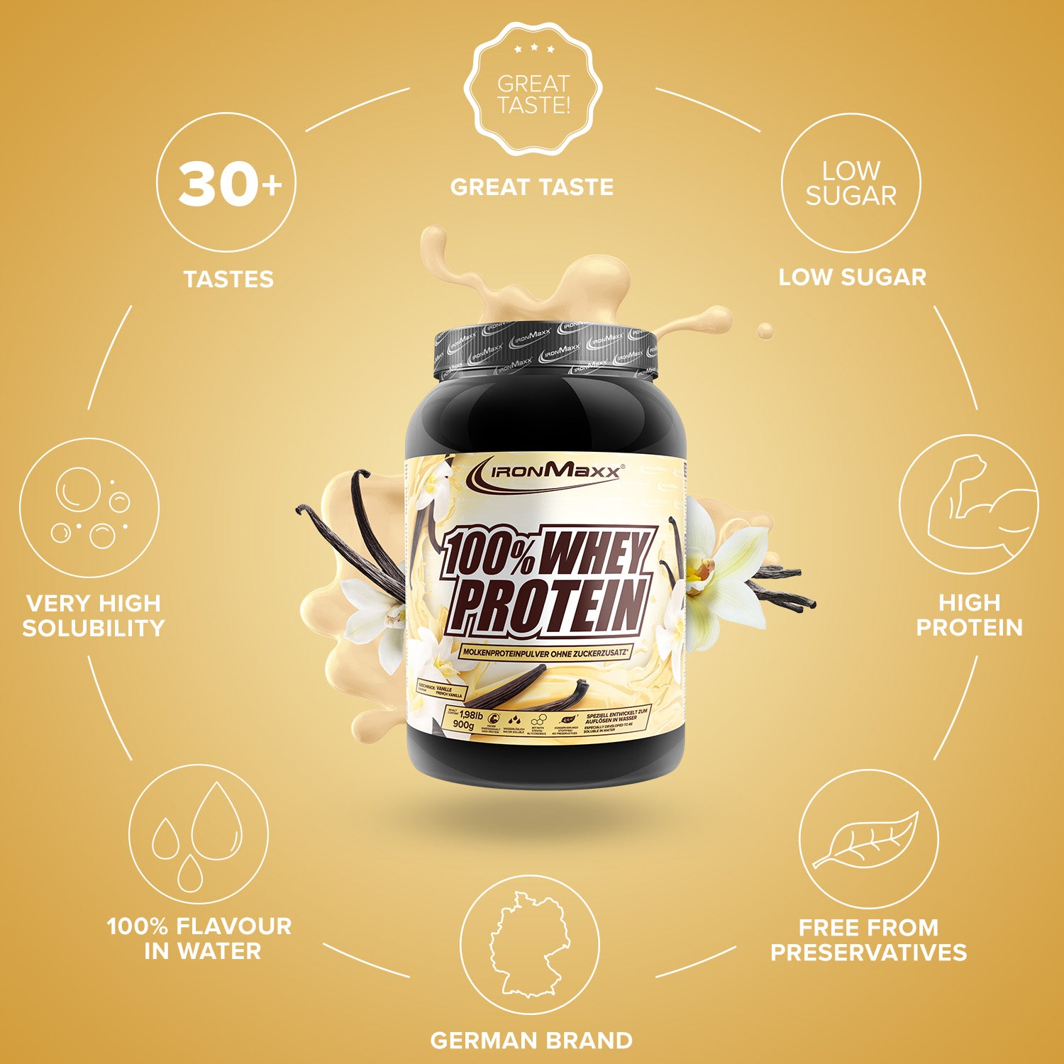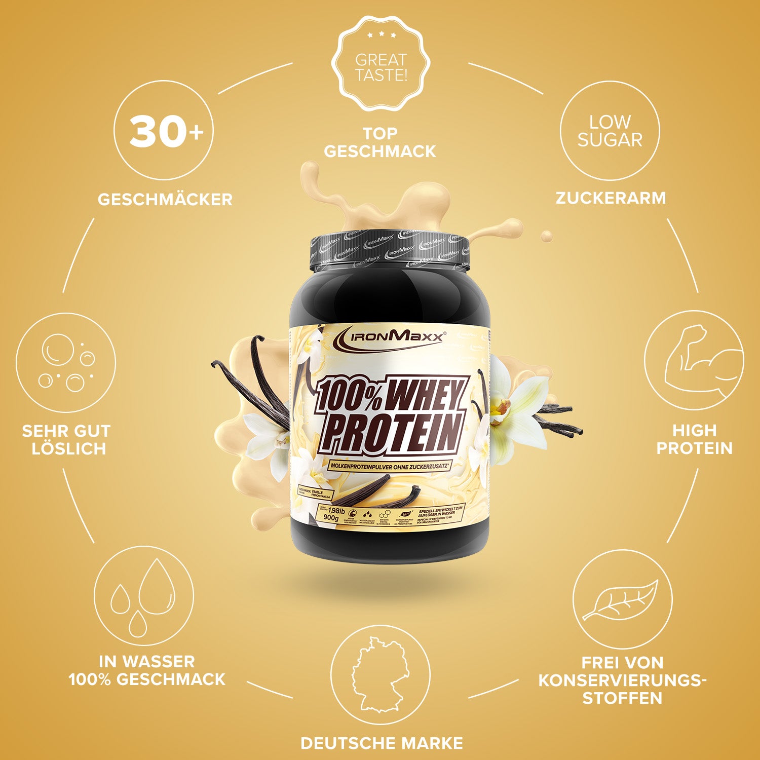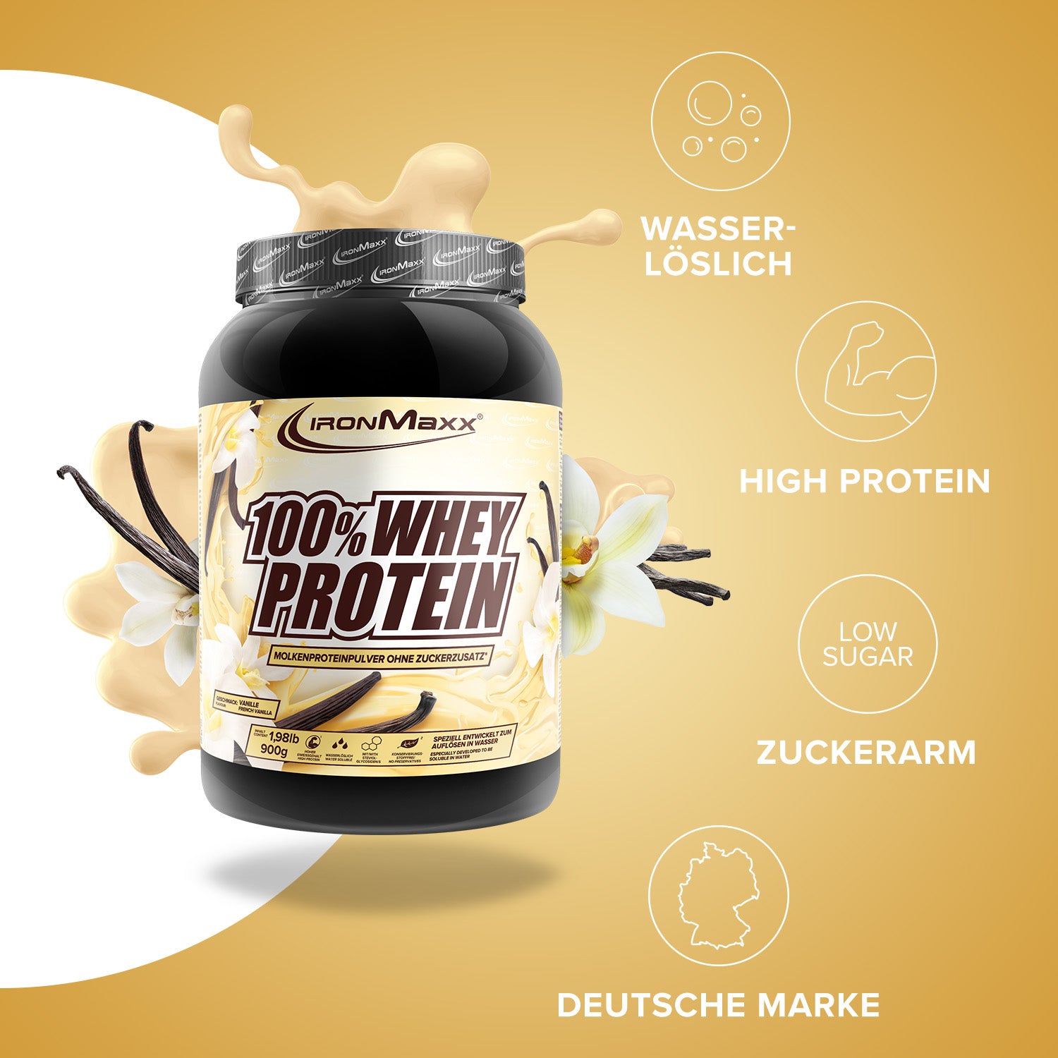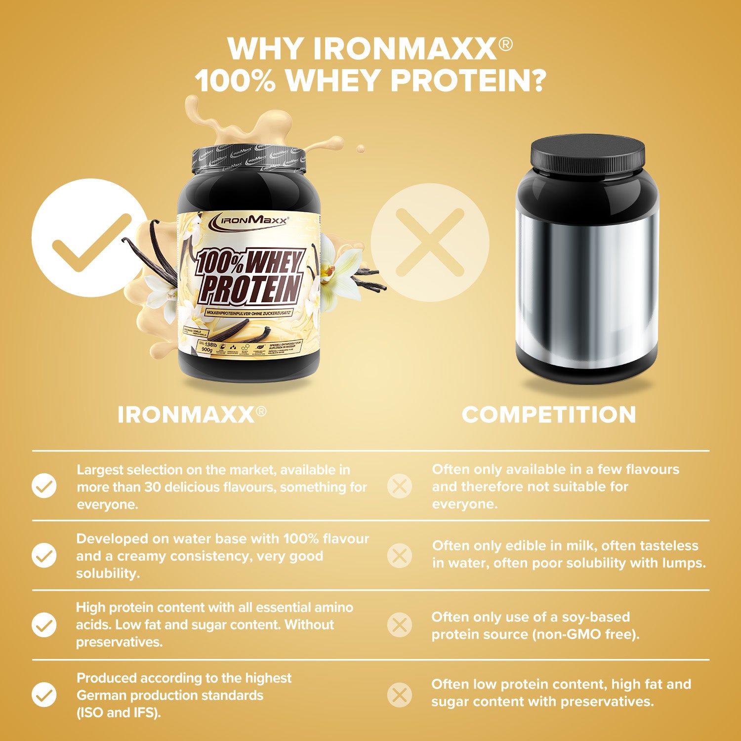 IronMaxx® 100% Whey Protein is one of the most popular protein shakes for muscle growth, recovery and cutting phases. With up to 80% protein, a complete amino acid profile (including BCAAs & EAAs) and a creamy, delicious taste, it is the perfect partner for your fitness routine.