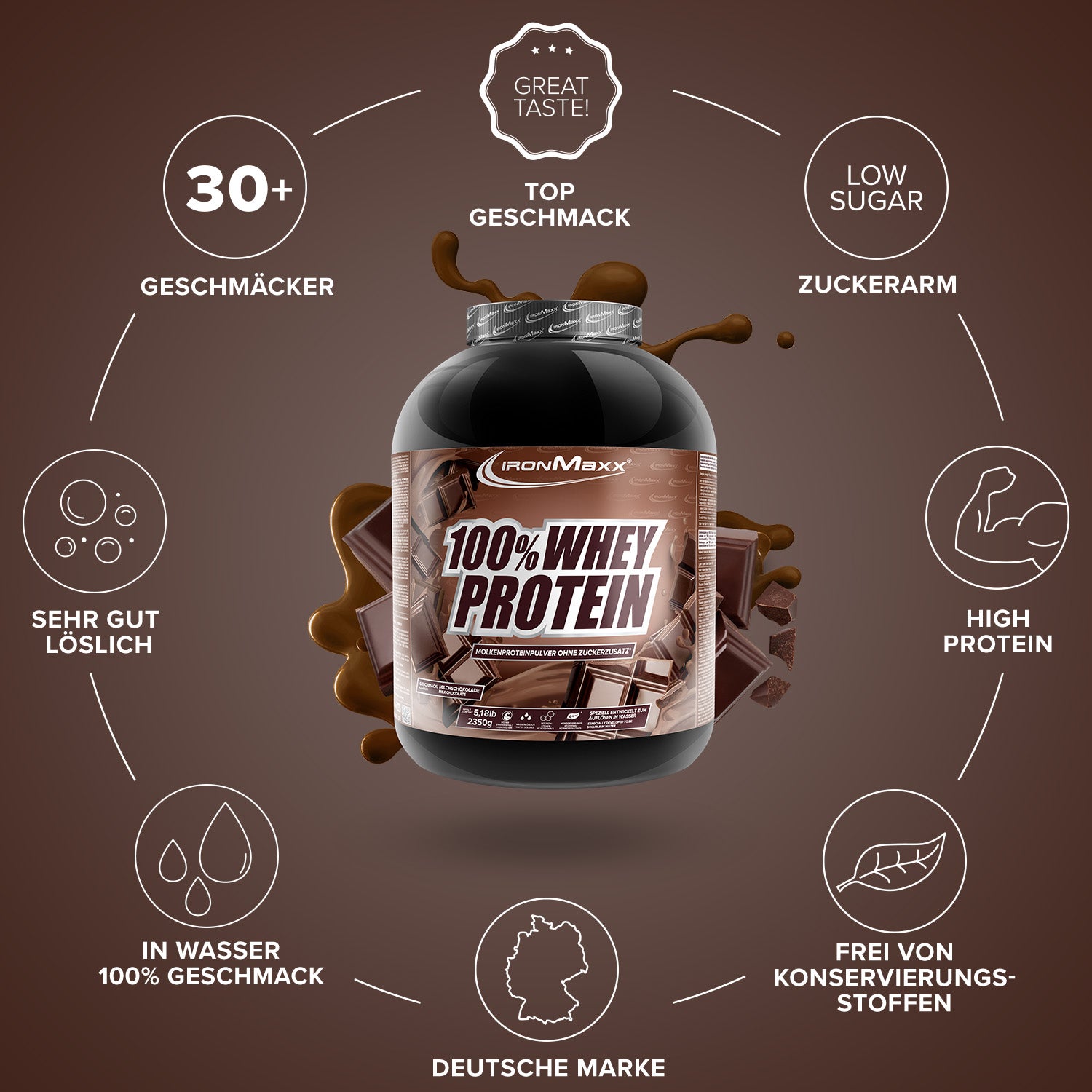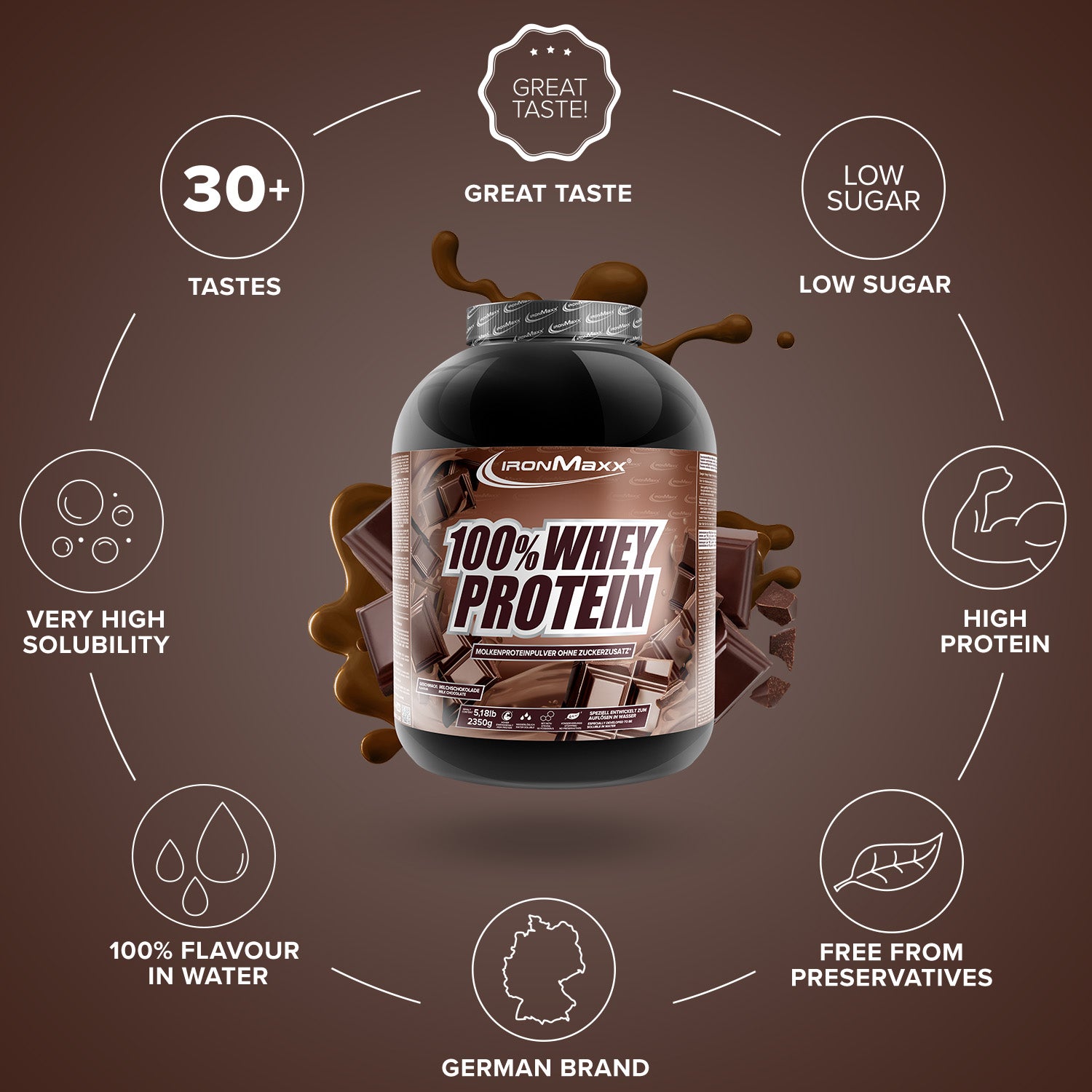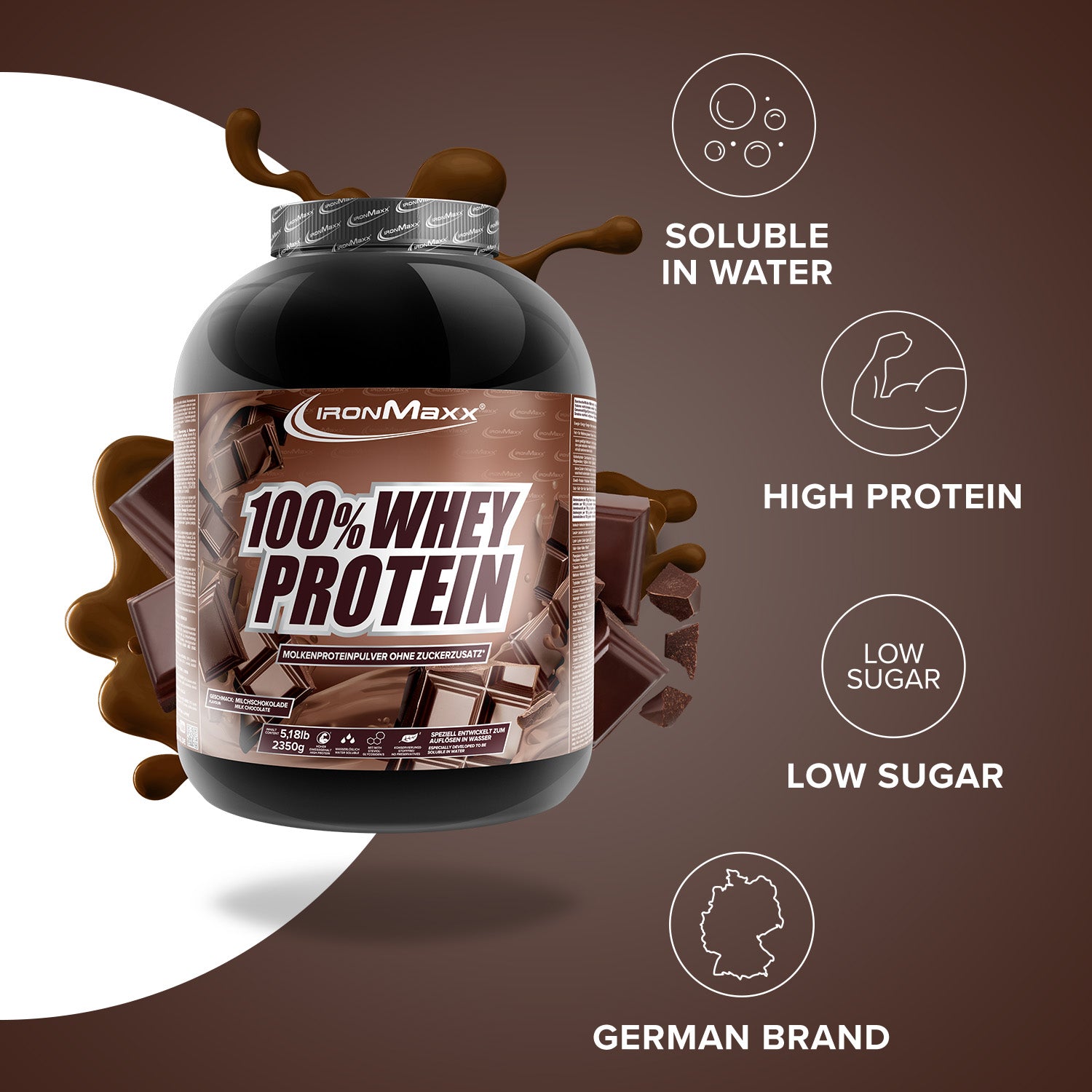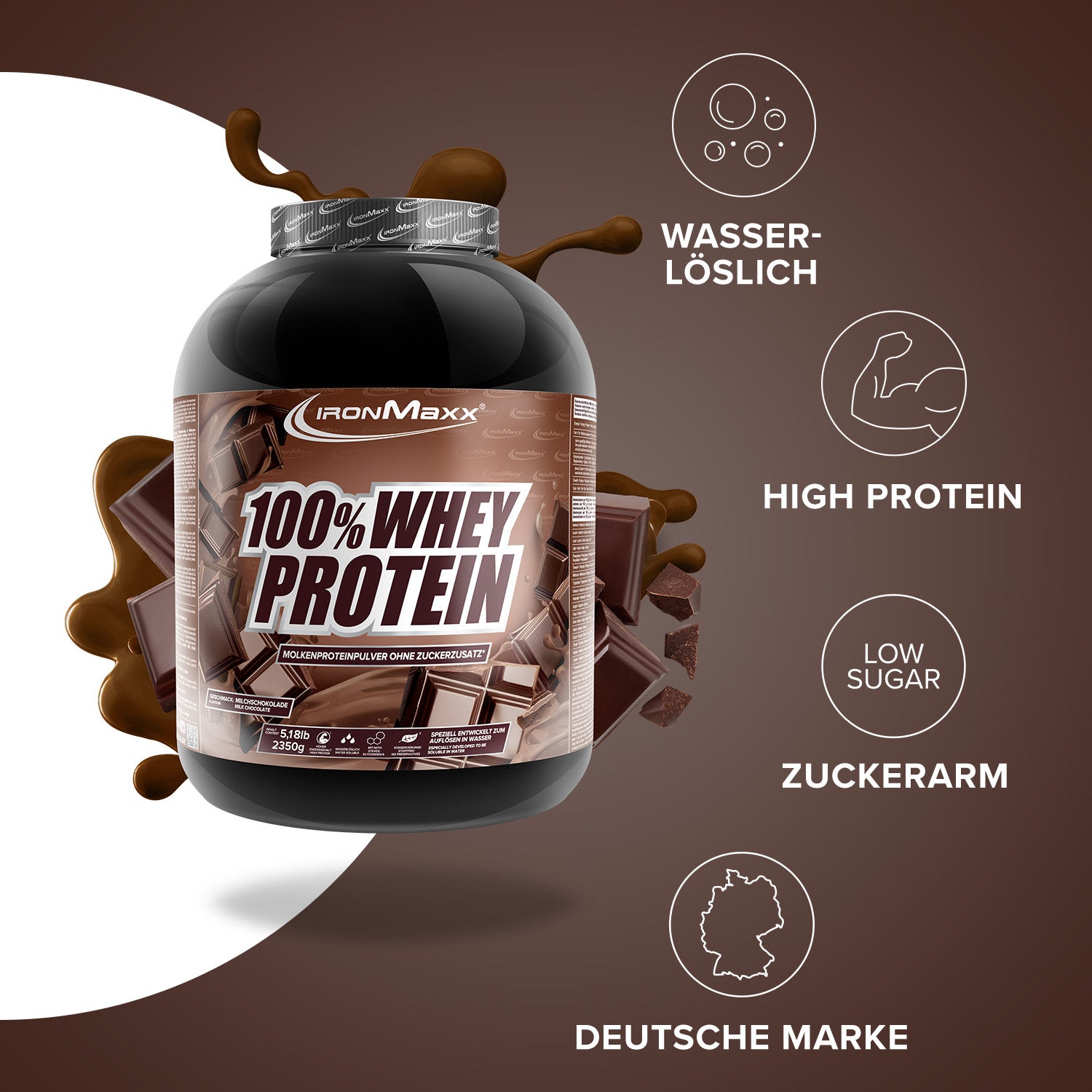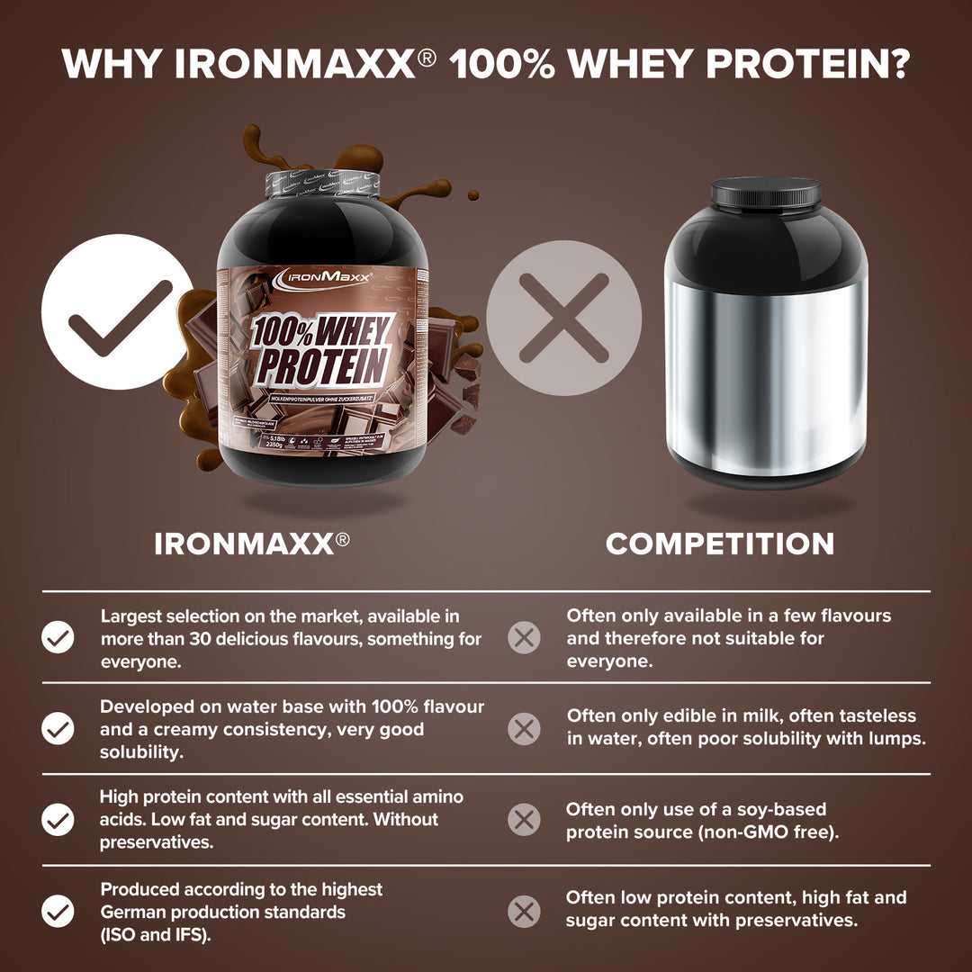 IronMaxx® 100% Whey Protein is one of the most popular protein shakes for muscle growth, recovery and cutting phases. With up to 80% protein, a complete amino acid profile (including BCAAs & EAAs) and a creamy, delicious taste, it is the perfect partner for your fitness routine.