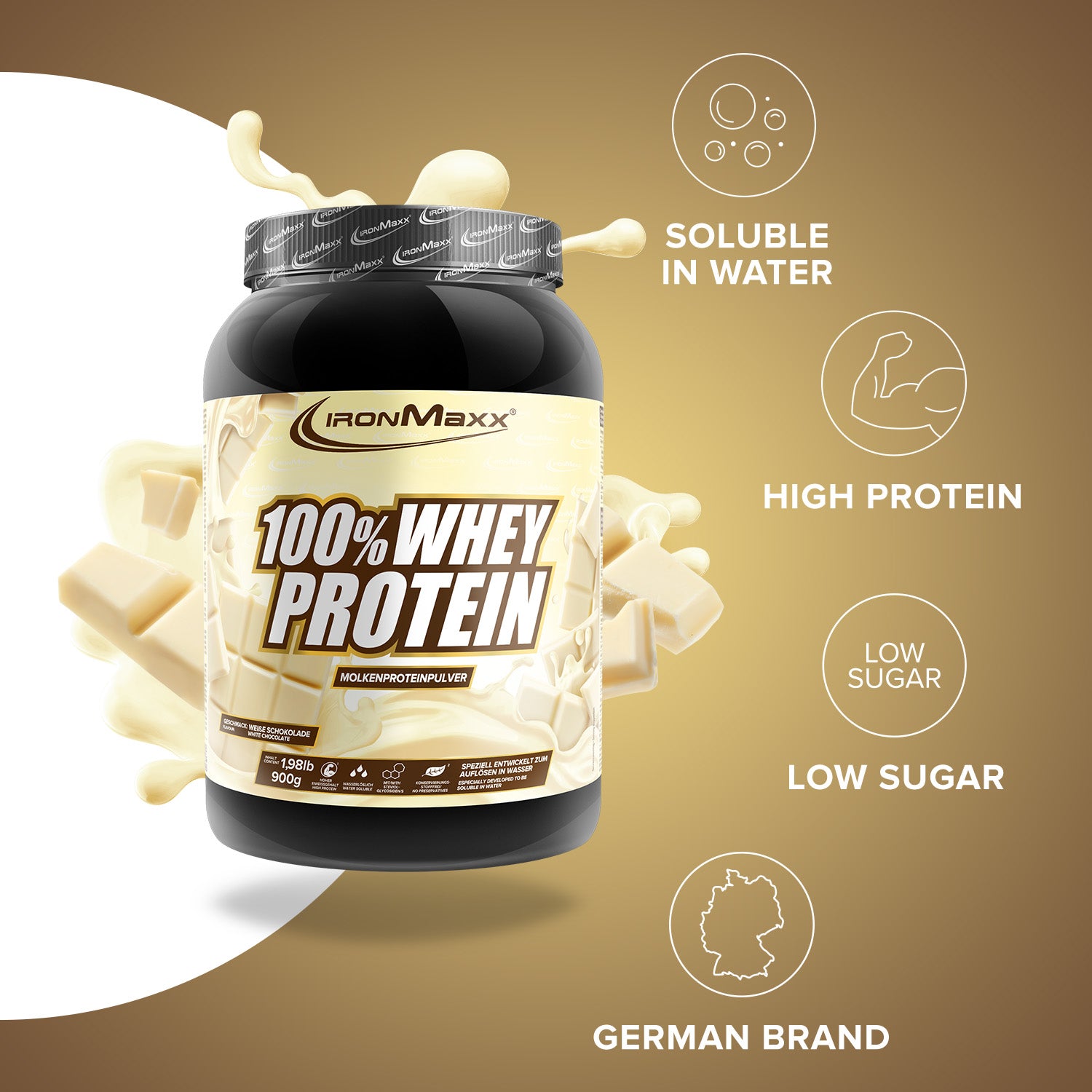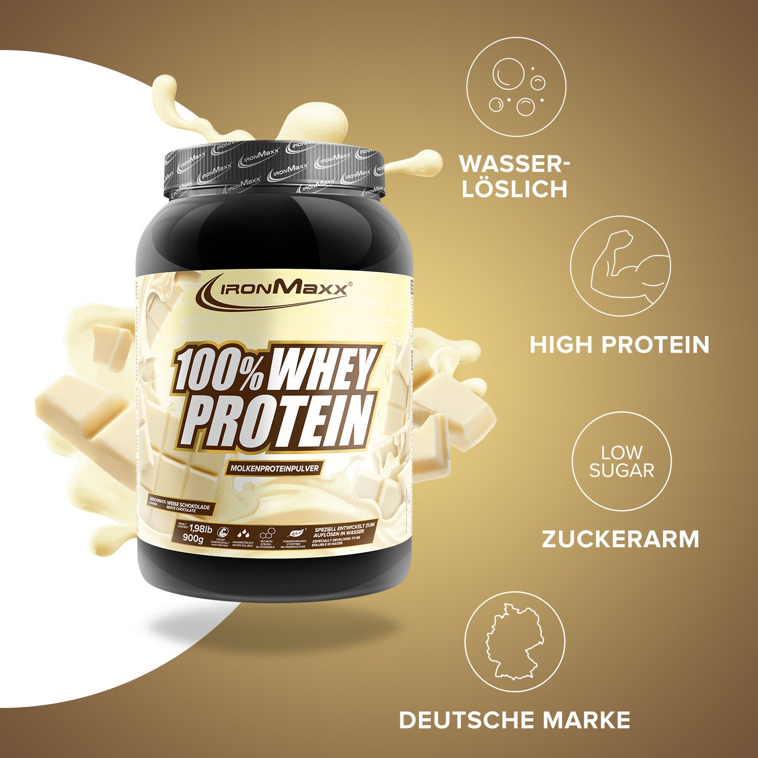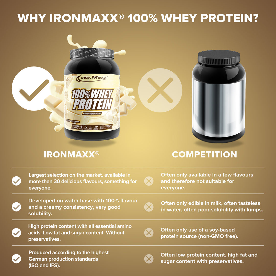 IronMaxx® 100% Whey Protein is one of the most popular protein shakes for muscle growth, recovery and cutting phases. With up to 80% protein, a complete amino acid profile (including BCAAs & EAAs) and a creamy, delicious taste, it is the perfect partner for your fitness routine.