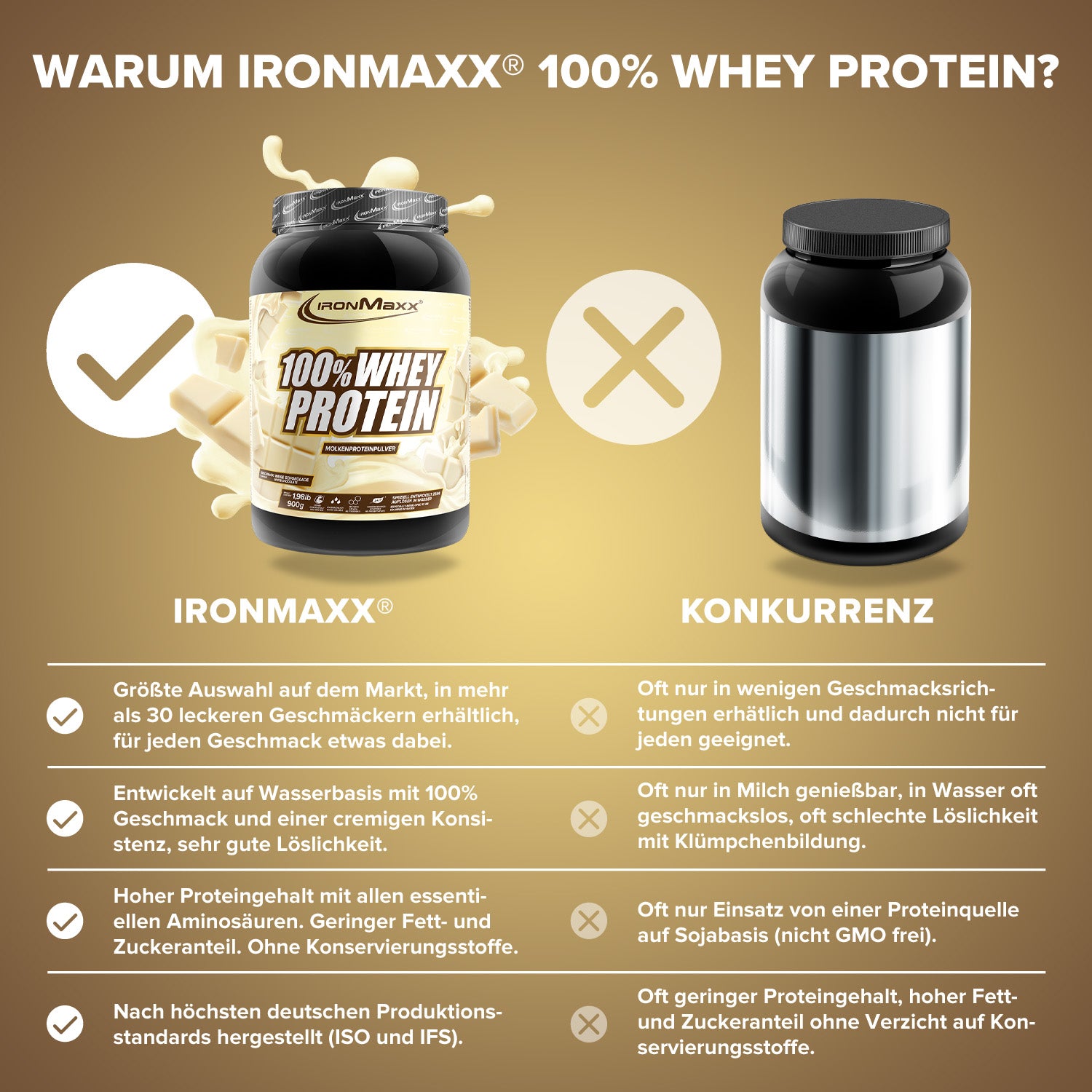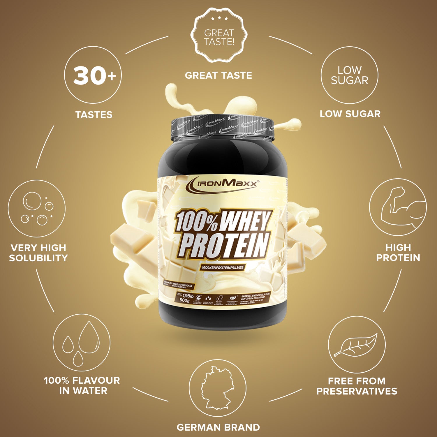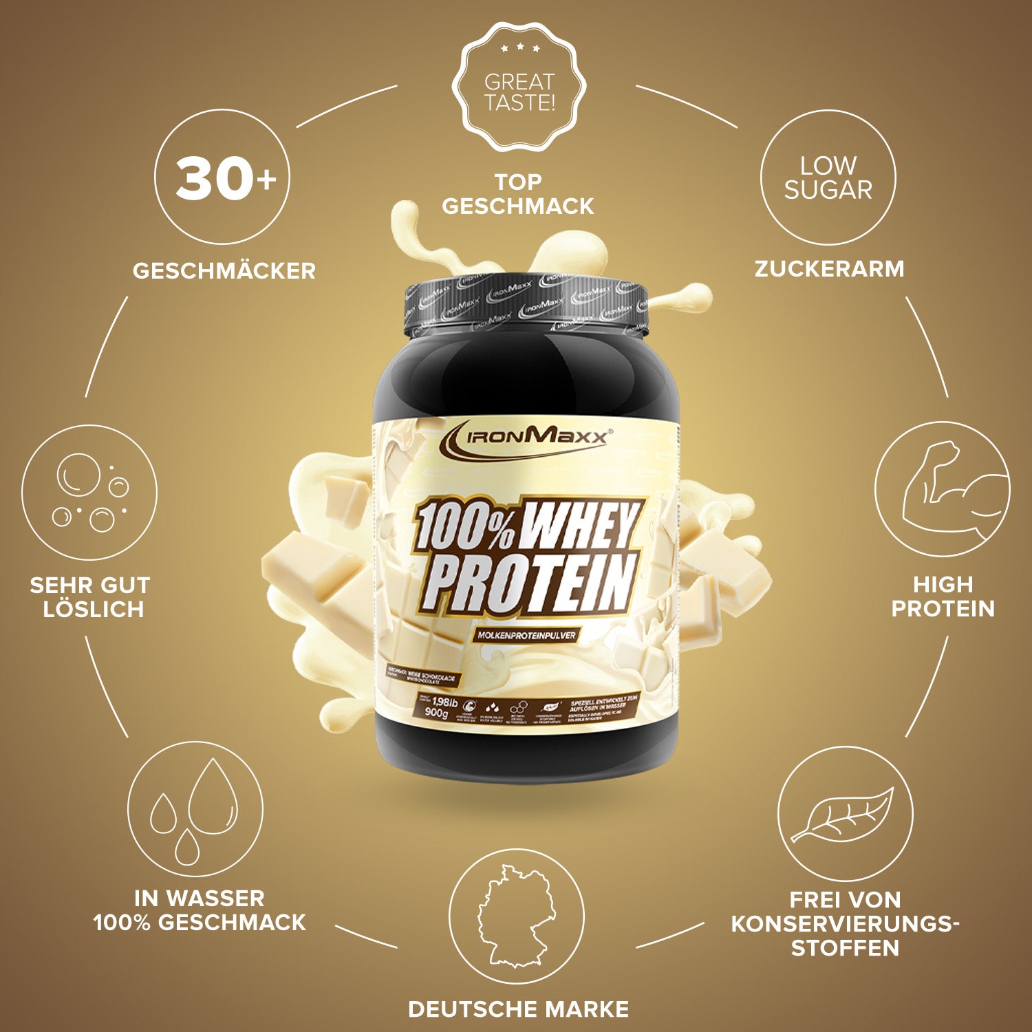 IronMaxx® 100% Whey Protein is one of the most popular protein shakes for muscle growth, recovery and cutting phases. With up to 80% protein, a complete amino acid profile (including BCAAs & EAAs) and a creamy, delicious taste, it is the perfect partner for your fitness routine.