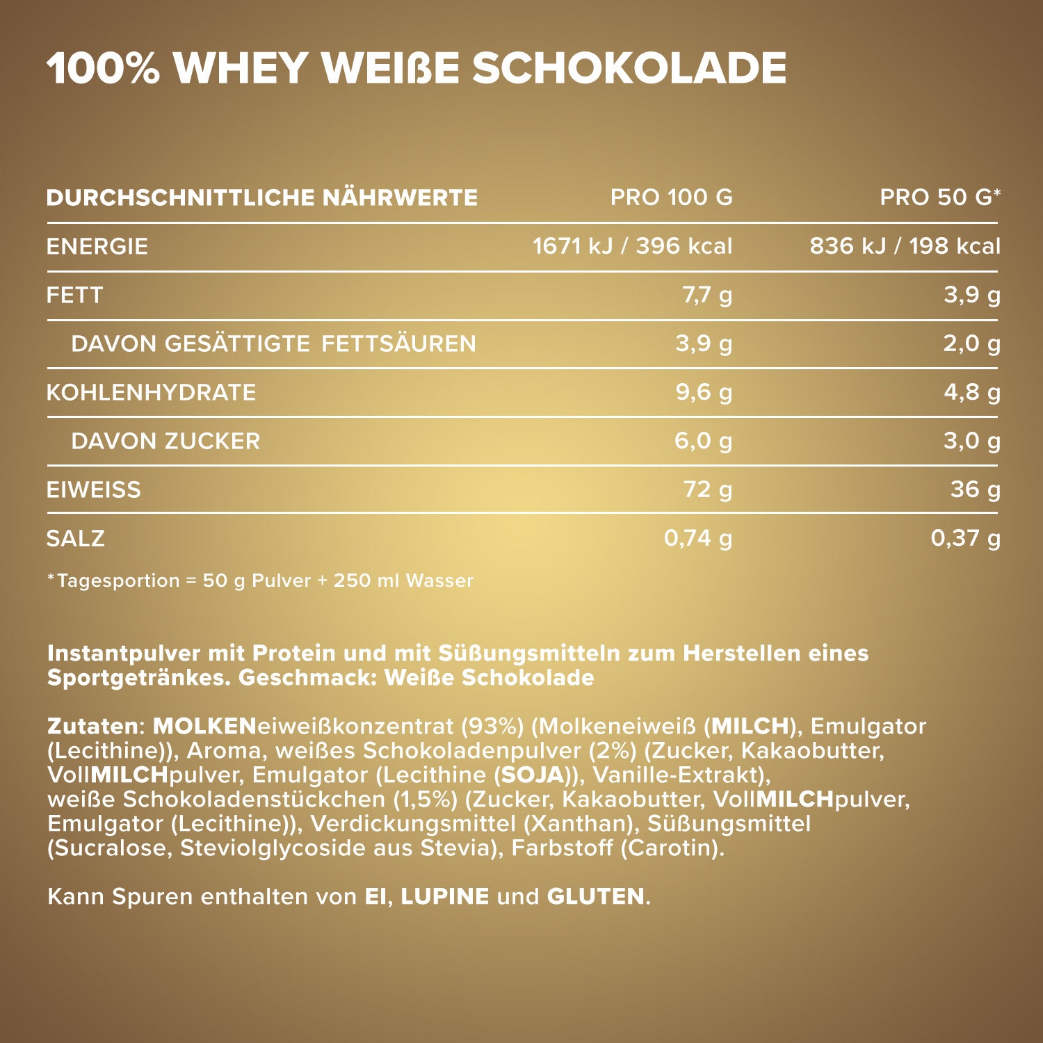 The recommended daily intake must not be exceeded! Keep out of reach of children! Store protected from heat, moisture, and sunlight. Proteins contribute to an increase in muscle mass. A balanced and varied diet and a healthy lifestyle are important. According to trade custom.