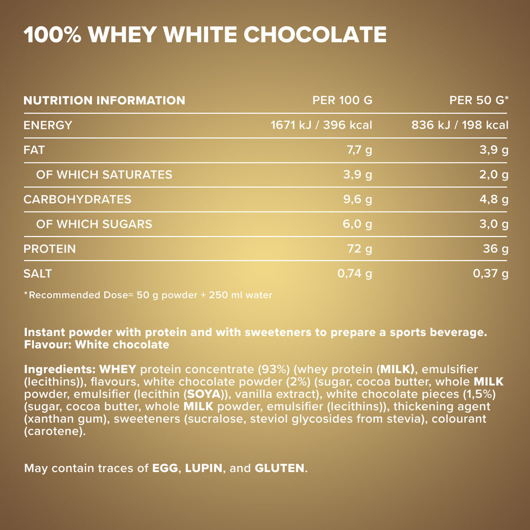 ²One serving contains 30 g of powder and 200 ml of water or milk.³In our Designer Whey, we do not use added sugar, but rely on safe
