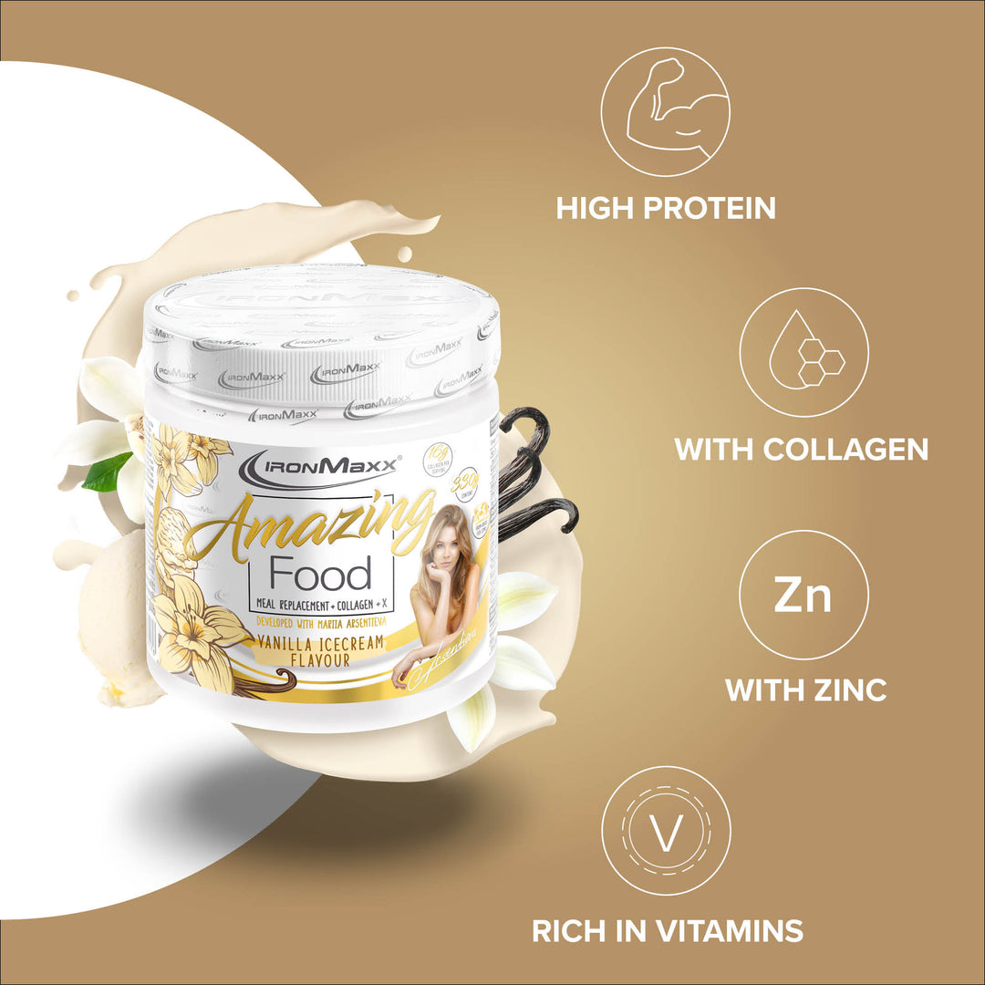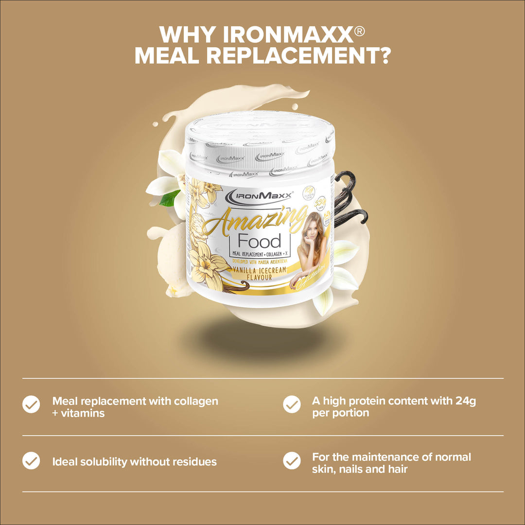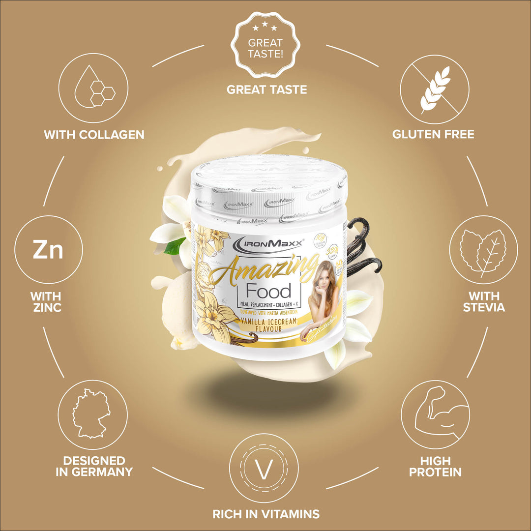 Amazing Food by IronMaxx® is the ideal meal replacement for anyone who values conscious nutrition, inner beauty and high-quality nutrients. With 25 g of protein, grass-fed collagen and 24 vitamins and minerals per serving, it provides your body with optimal support – completely gluten-free and with only 208 kcal.