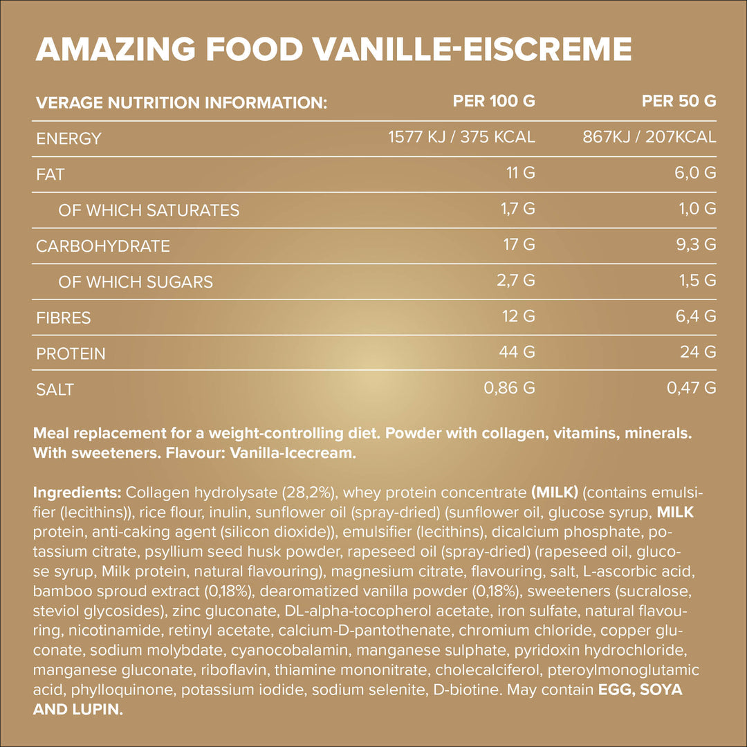 Collagen hydrolysate (28.2%), whey protein concentrate (MILK) (contains emulsifier (lecithins)), rice flour, inulin, sunflower oil (spray-dried) (sunflower oil, glucose syrup, MILK protein, anti-caking agent (silicon dioxide), emulsifier (lecithins), dicalcium phosphate, potassium citrate, psyllium husk powder, rapeseed oil (spray-dried) (rapeseed oil, glucose syrup, MILK protein, natural flavor), magnesium citrate, flavor, salt, L-ascorbic acid, bamboo shoot extract (0.18%), flavored vanilla powder (0.18%), sweeteners (sucralose, steviol glycosides from stevia), zinc gluconate, DL-alpha-tocopheryl acetate, iron sulfate, niacinamide, retinyl acetate, calcium D-pantothenate, chromium chloride, copper gluconate, sodium molybdate, cyanocobalamin, manganese sulfate, pyridoxine hydrochloride, manganese gluconate, riboflavin, thiamine mononitrate, cholecalciferol, pteroylmonoglutamic acid, phylloquinone, potassium iodide, sodium selenite, D-biotin.