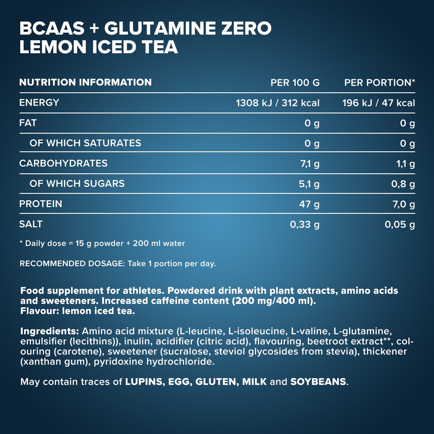 Amino acid mixture (L-Leucine, L-Isoleucine, L-Valine, L-Glutamine, Emulsifier (Lecithin)), Inulin, Acidifier (Citric acid), Flavor, Beetroot extract, Colorant (Carotene), Sweeteners (Sucralose, Steviol glycosides), Thickening agent (Xanthan), Pyridoxine hydrochloride.
