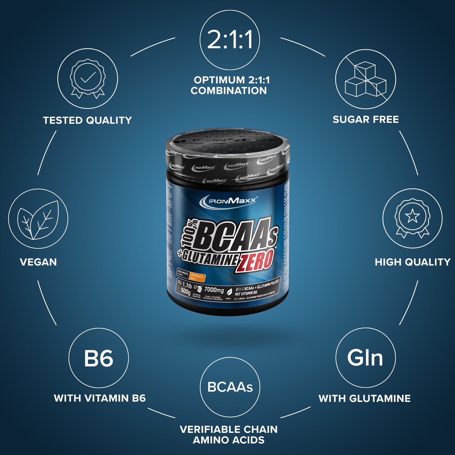 IronMaxx® BCAAs + Glutamine Zero in Peach Flavour combines essential amino acids, glutamine, and vitamin B6 – all without any sugar. With excellent solubility and intense fruity flavors like mango, cherry, or raspberry, it’s the perfect refreshing drink before, during, or after your workout. This advanced formula supports muscle building and is ideal for cutting phases as well. Optimized for performance, it delivers targeted amino support to help you push harder and recover faster.