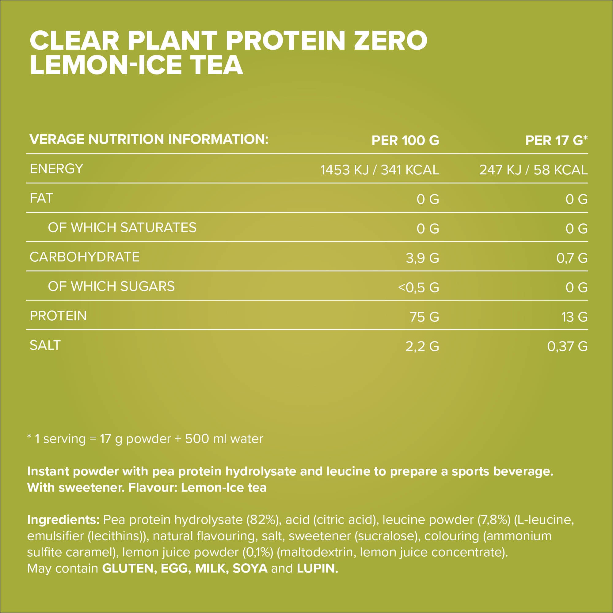 Pea protein hydrolysate (82%), acidifier (citric acid), leucine powder (7.8%) (L-leucine, emulsifier (lecithins)), natural flavor, salt, sweetener (sucralose), colorant (ammonium sulfite caramel), lemon juice powder (0.1%) (maltodextrin, lemon juice concentrate). For allergy sufferers: May contain traces of GLUTEN, EGG, MILK, SOY, and LUPIN