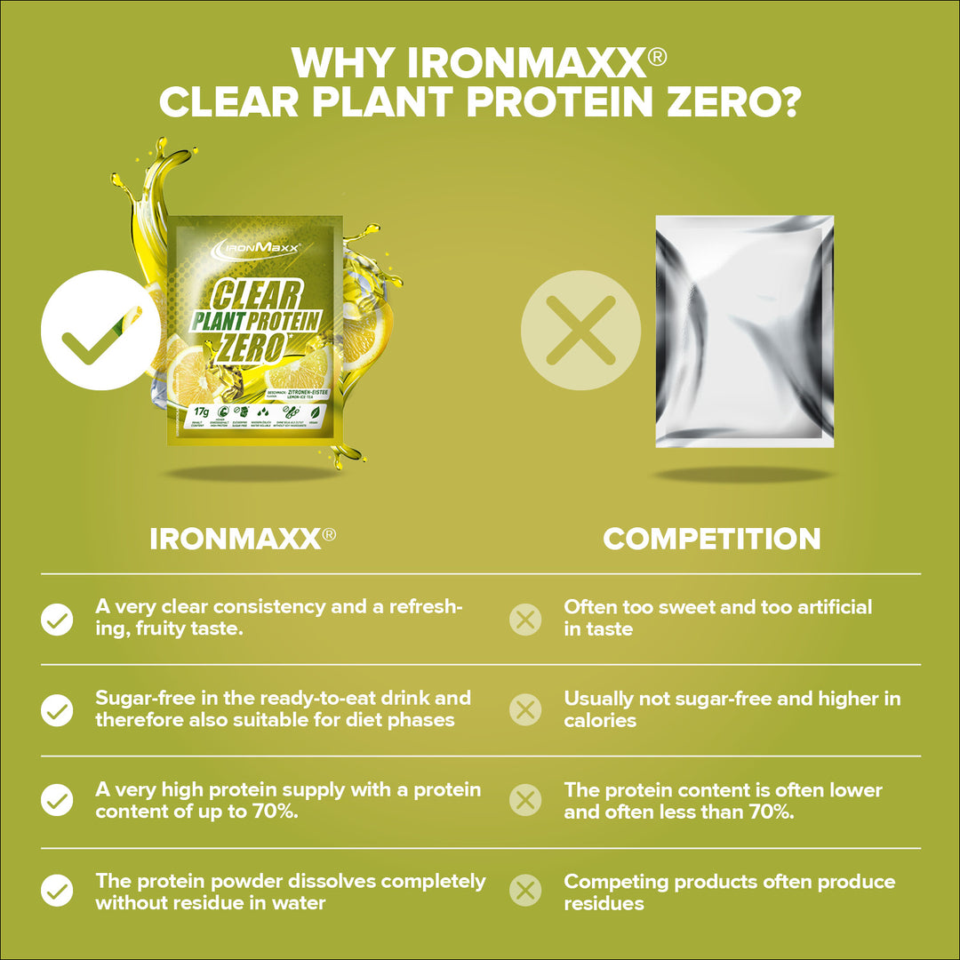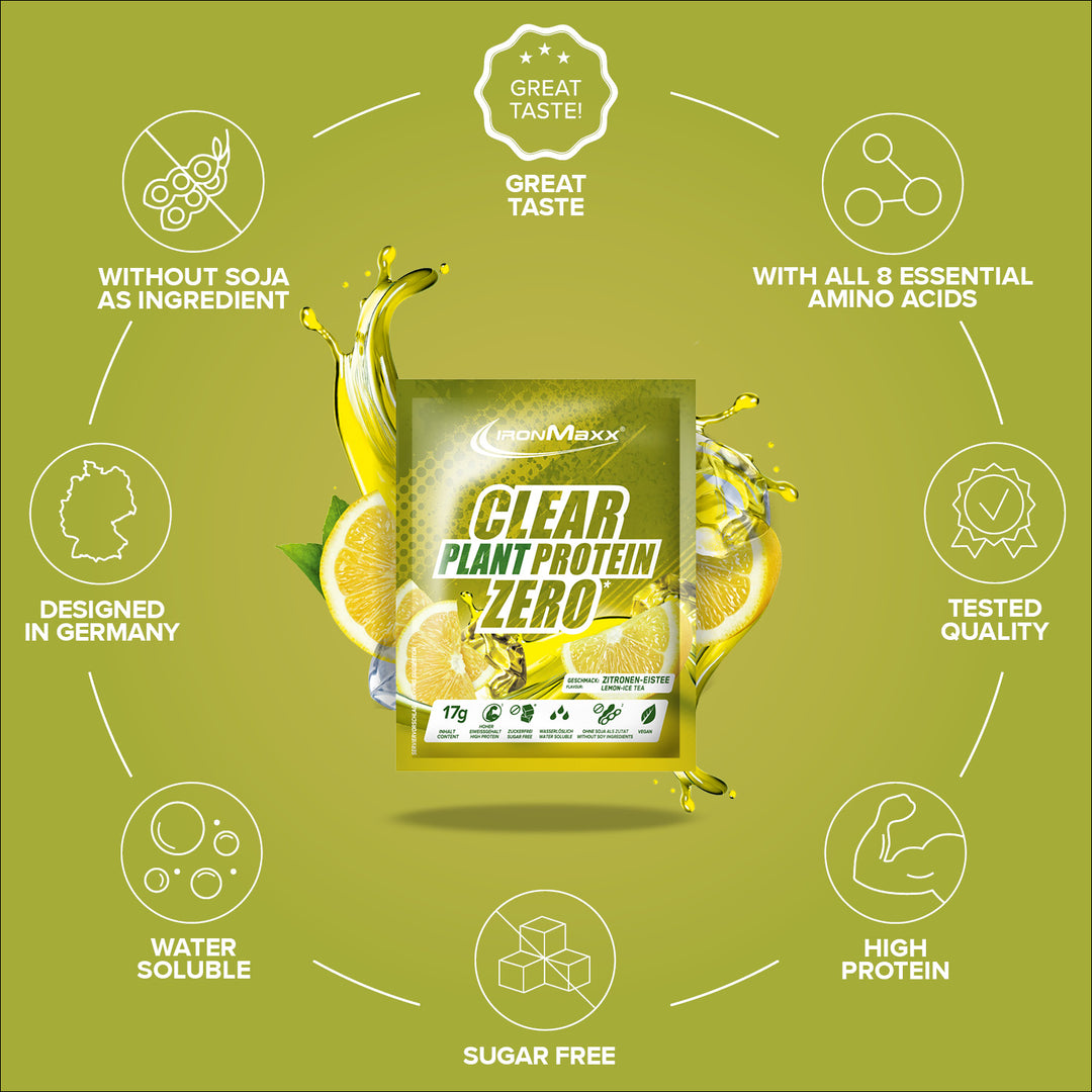 IronMaxx® Clear Plant Protein Lemon Ice Tea combines plant-based protein with fruity flavor – completely without a thick consistency. With up to 13 g of pea protein hydrolysate per serving, it specifically supports muscle building and recovery. Ideal for training and an active daily life – sugar-free, vegan, and lactose-free. Simply mix with water, shake, and ready!