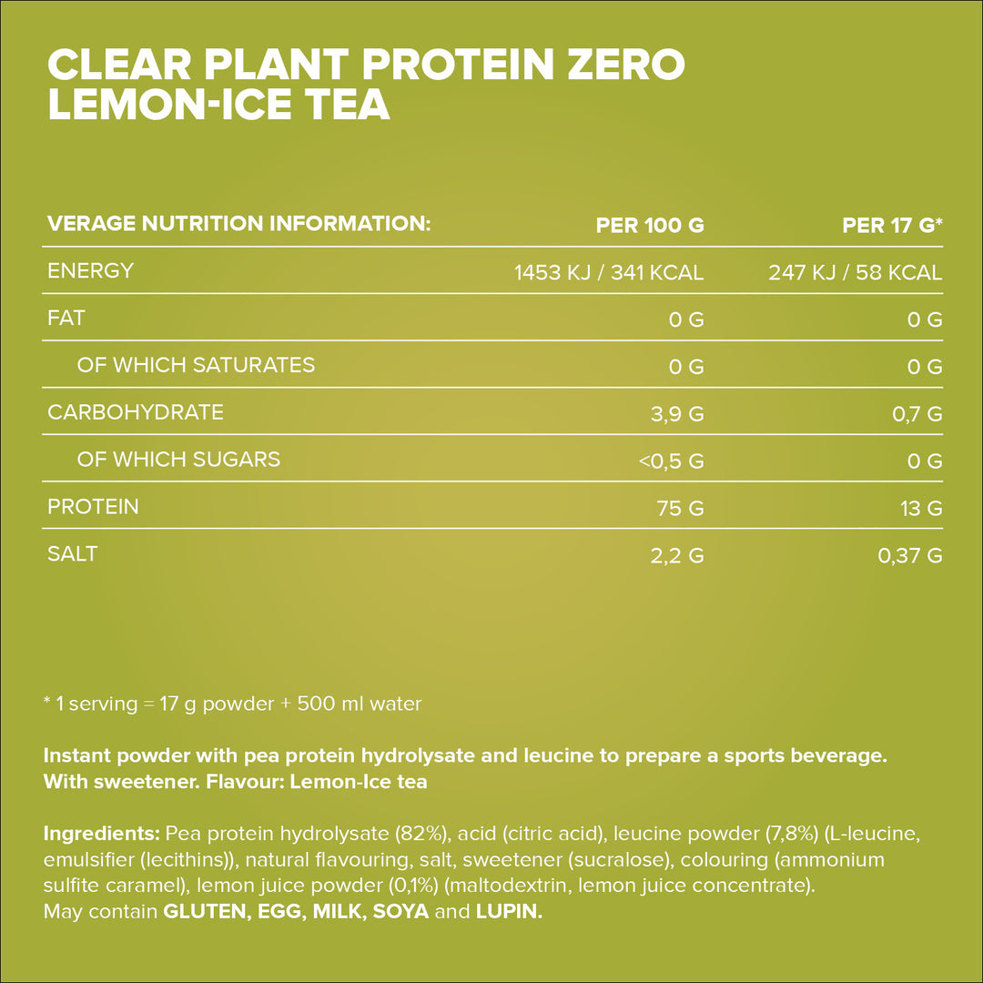 Pea Protein Hydrolysate (82%), Acidifier (Citric Acid), Leucine Powder (7.8%) (L-Leucine, Emulsifier (Lecithins)), Natural Flavoring, Salt, Sweetener (Sucralose), Color (Ammonium Sulfite Caramel), Lemon Juice Powder (0.1%) (Maltodextrin, Concentrated Lemon Juice).