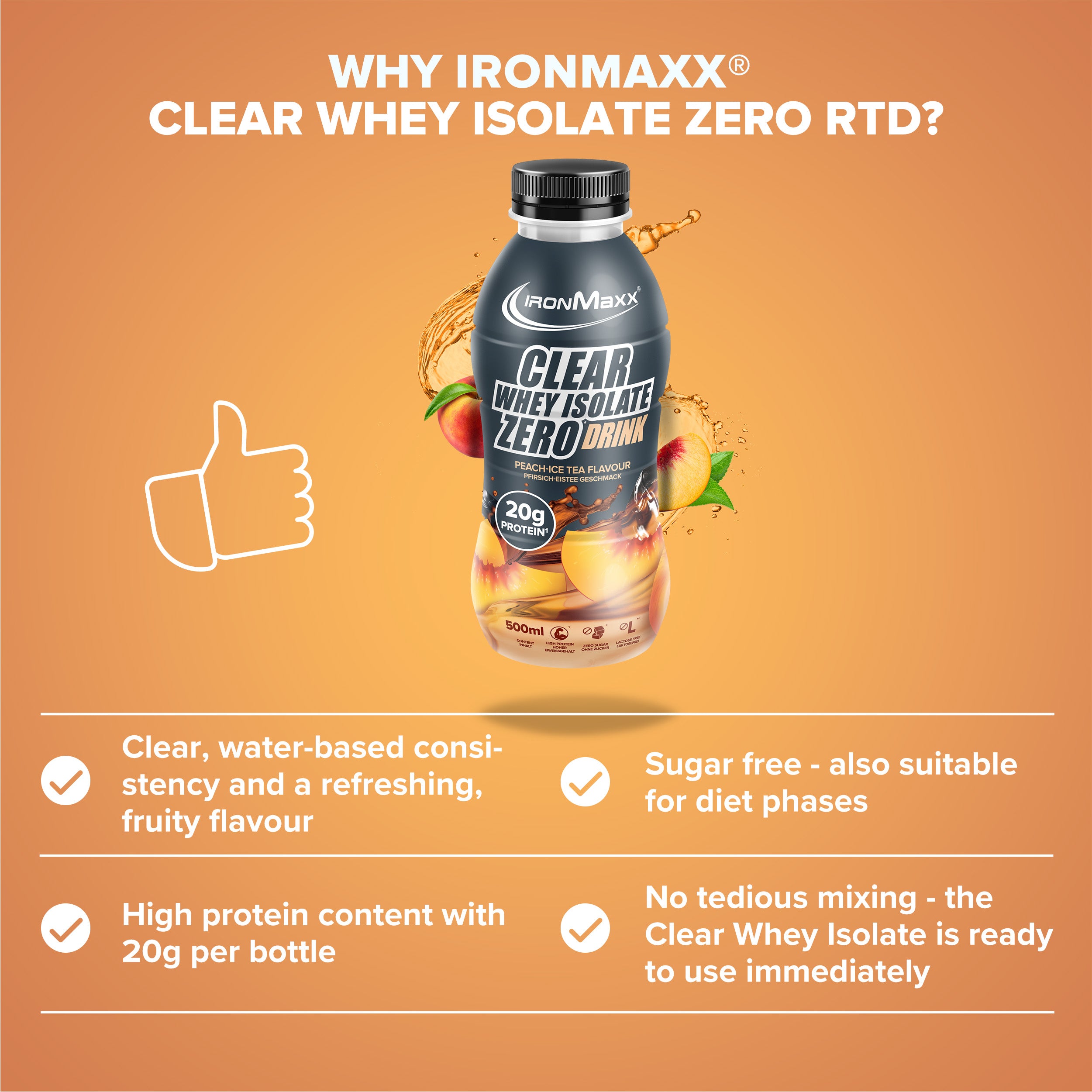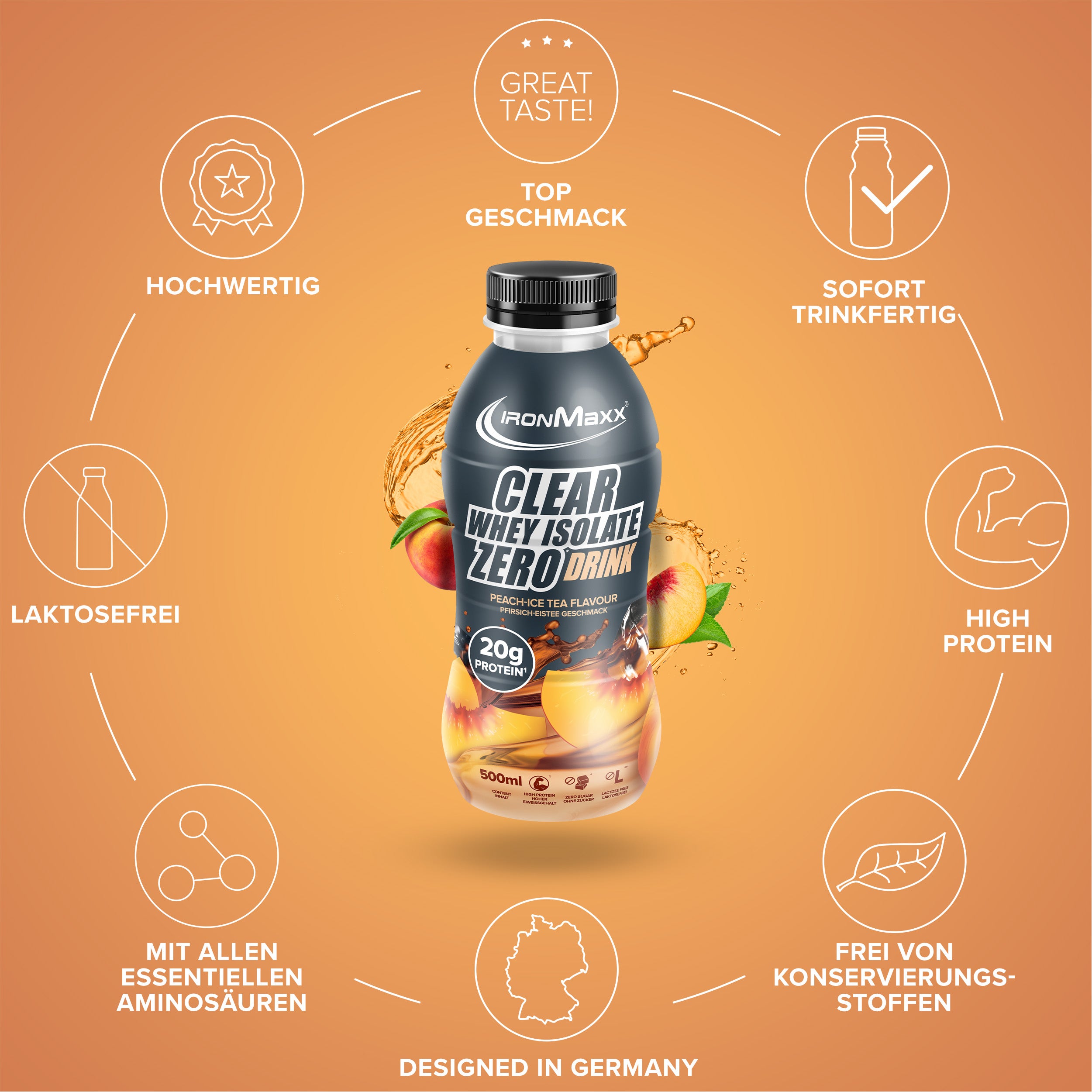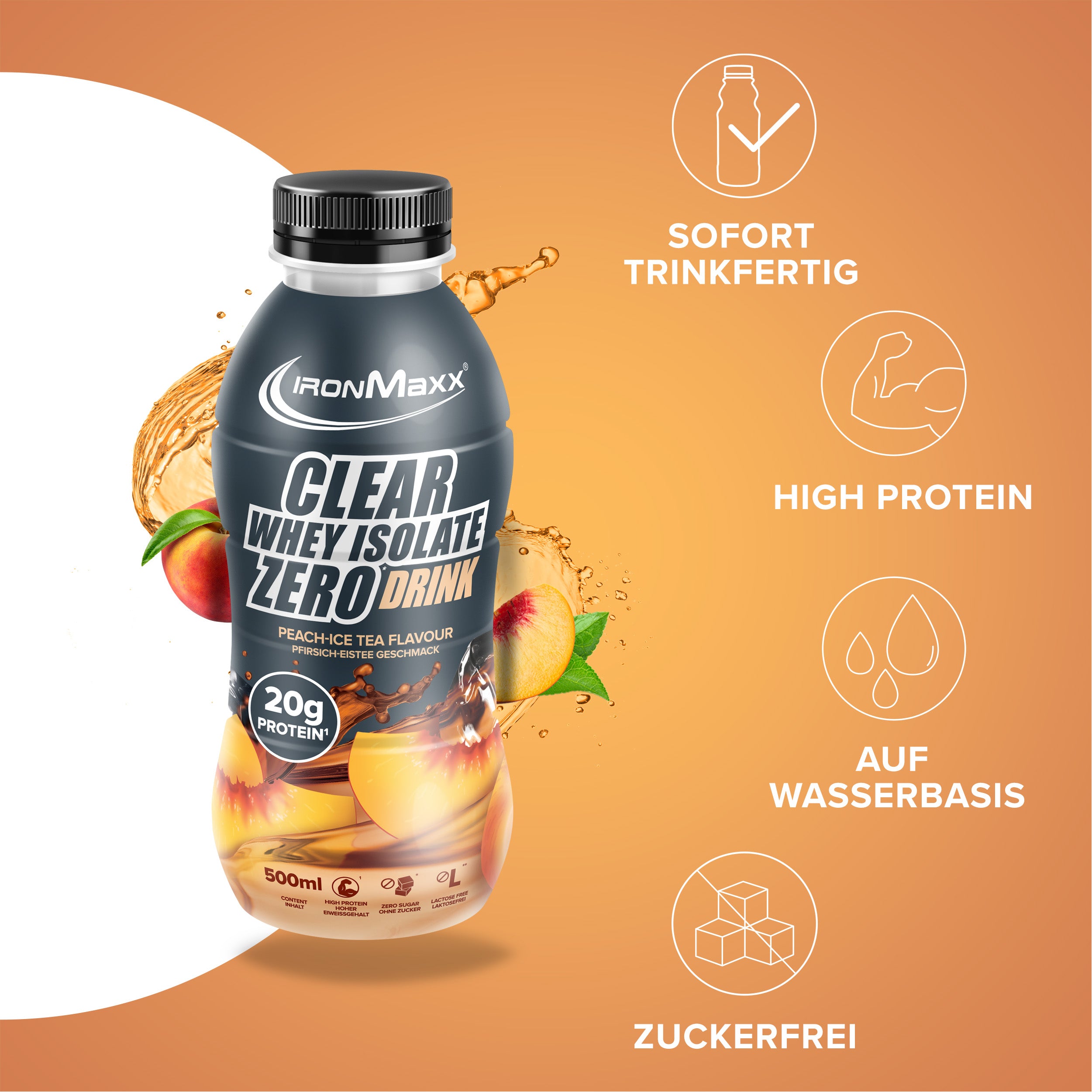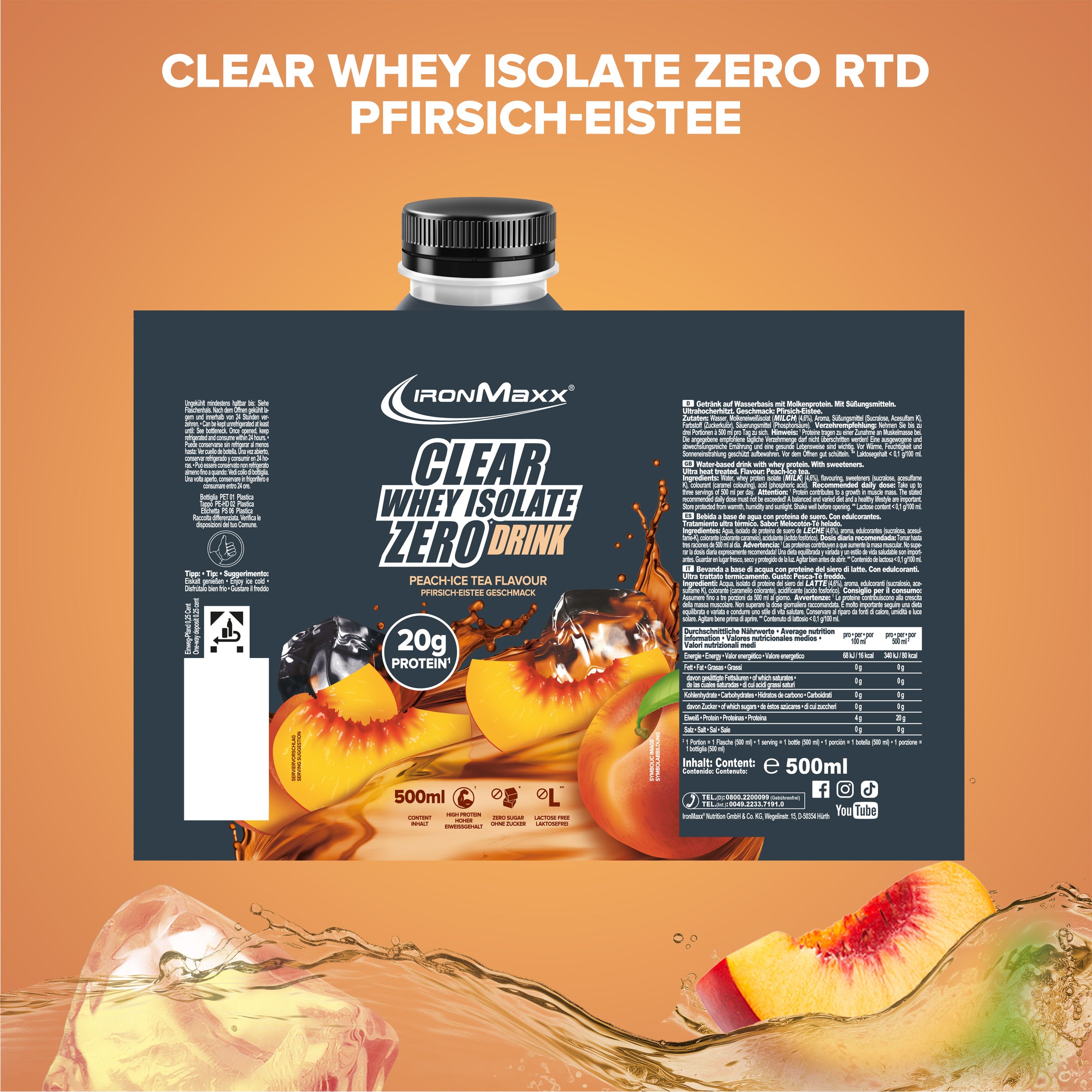 With Clear Whey Isolate Zero from IronMaxx®, you’ll experience protein in a whole new way – light, clear, and refreshing. The multi-filtered whey protein isolate delivers up to 84% protein and is sugar-free in the ready-to-drink shake – perfect for mindful nutrition and your training.