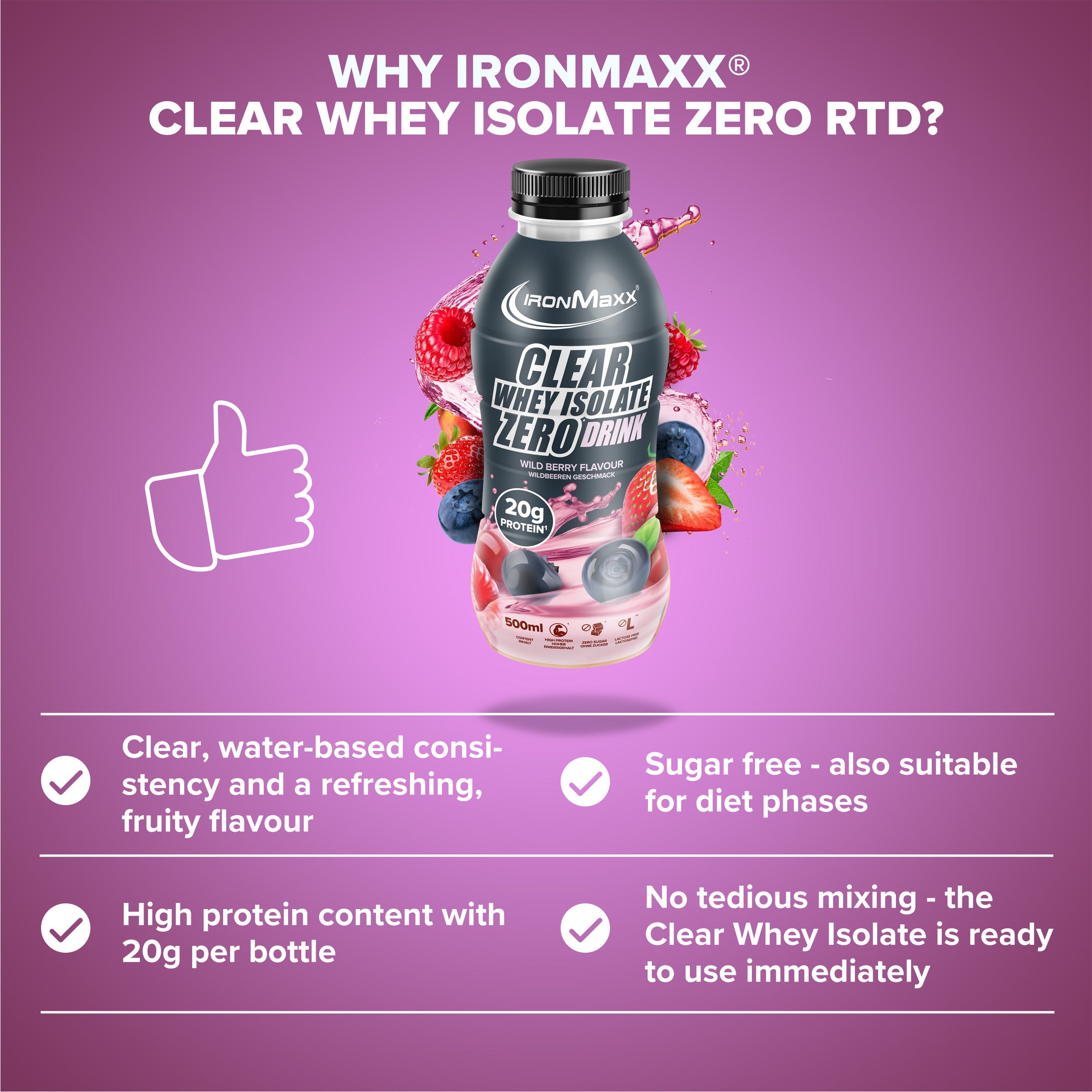 Water, whey protein isolate (MILK) (4.6%), flavoring, sweeteners (sucralose, acesulfame K), coloring foodstuffs (carrot juice concentrate, blackcurrant concentrate), acidifying agent (phosphoric acid)